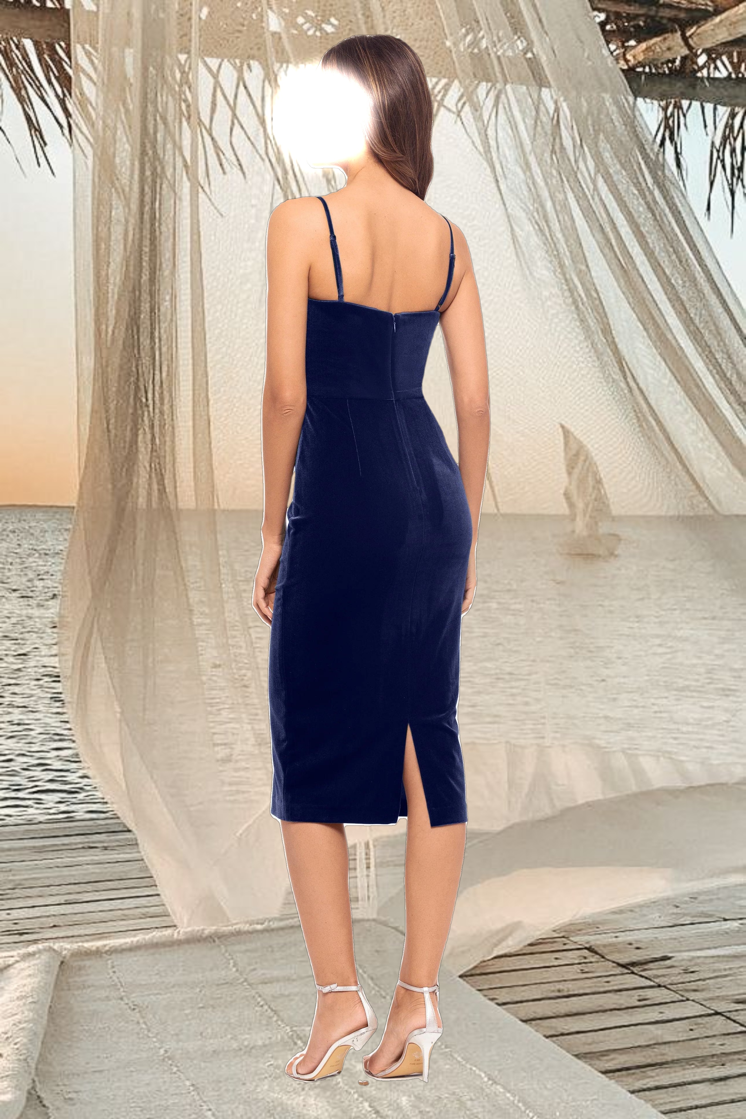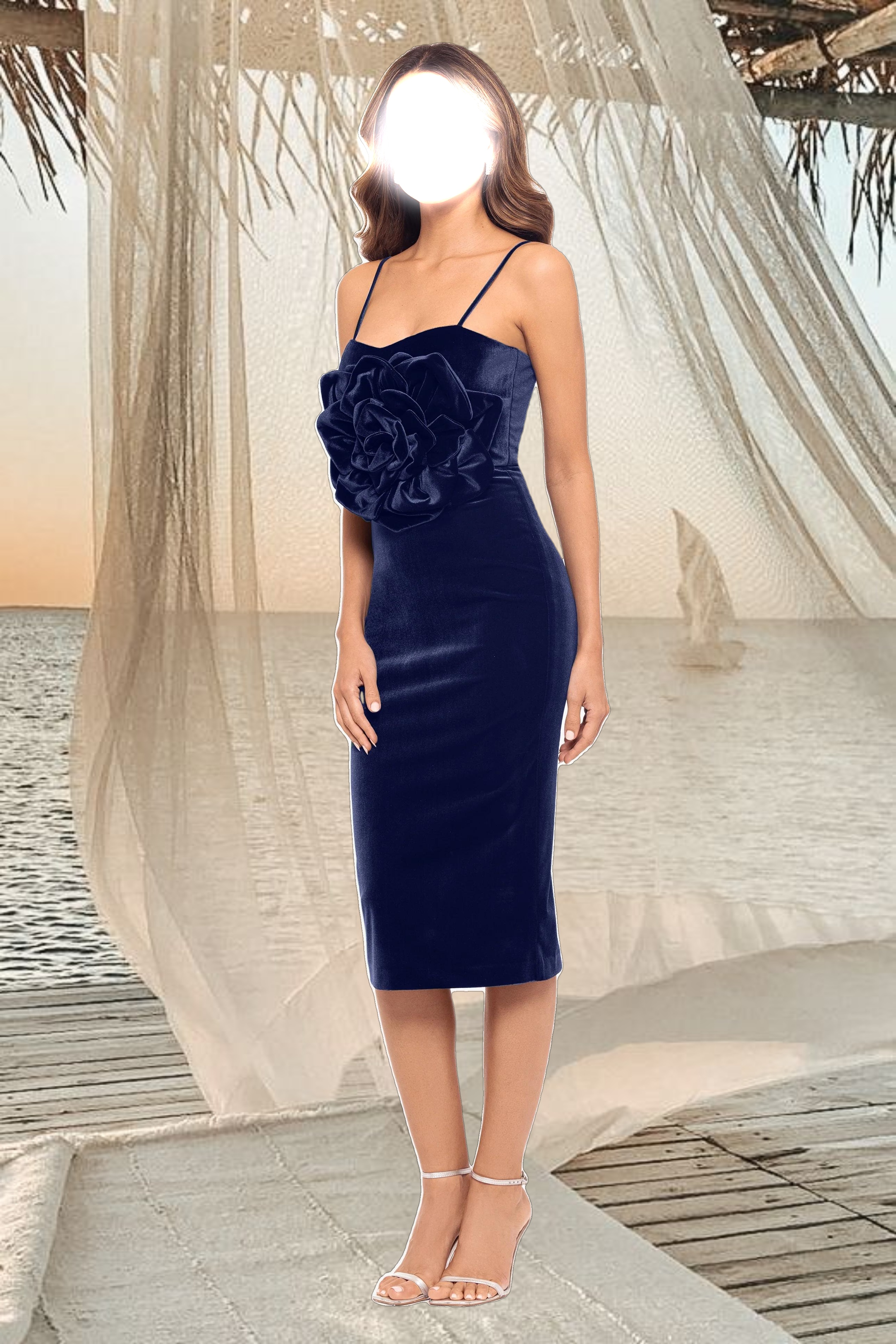 This velvet dress features a sophisticated knee-length cut, perfect for cocktail parties and formal events. The elegant design includes delicate straps and a fitted bodice adorned with intricate detailing, enhancing its luxurious feel. Ideal for making a stylish statement, this dress combines timeless glamour with modern chic.