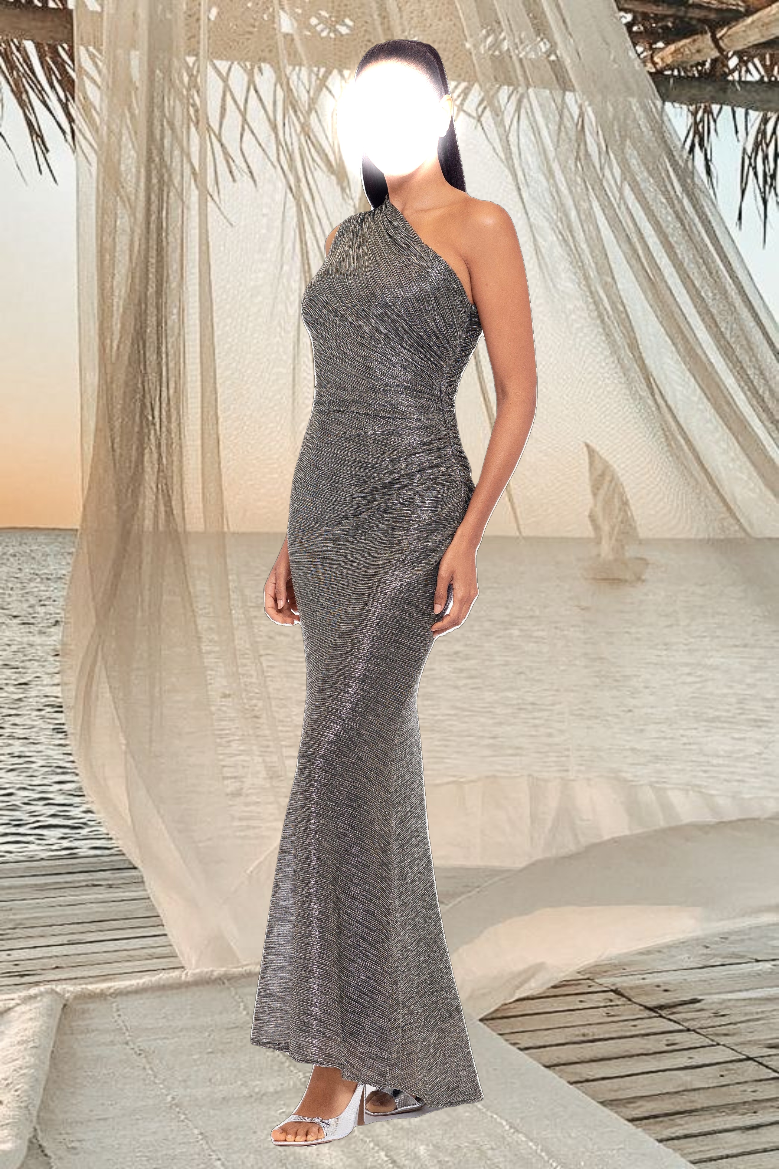 Effortlessly elegant, this one-shoulder gown features subtle metallic shimmer, flattering side ruching, and a floor-length silhouette designed to hug your curves and catch the light with every step. Perfect for black-tie soirées and formal celebrations.