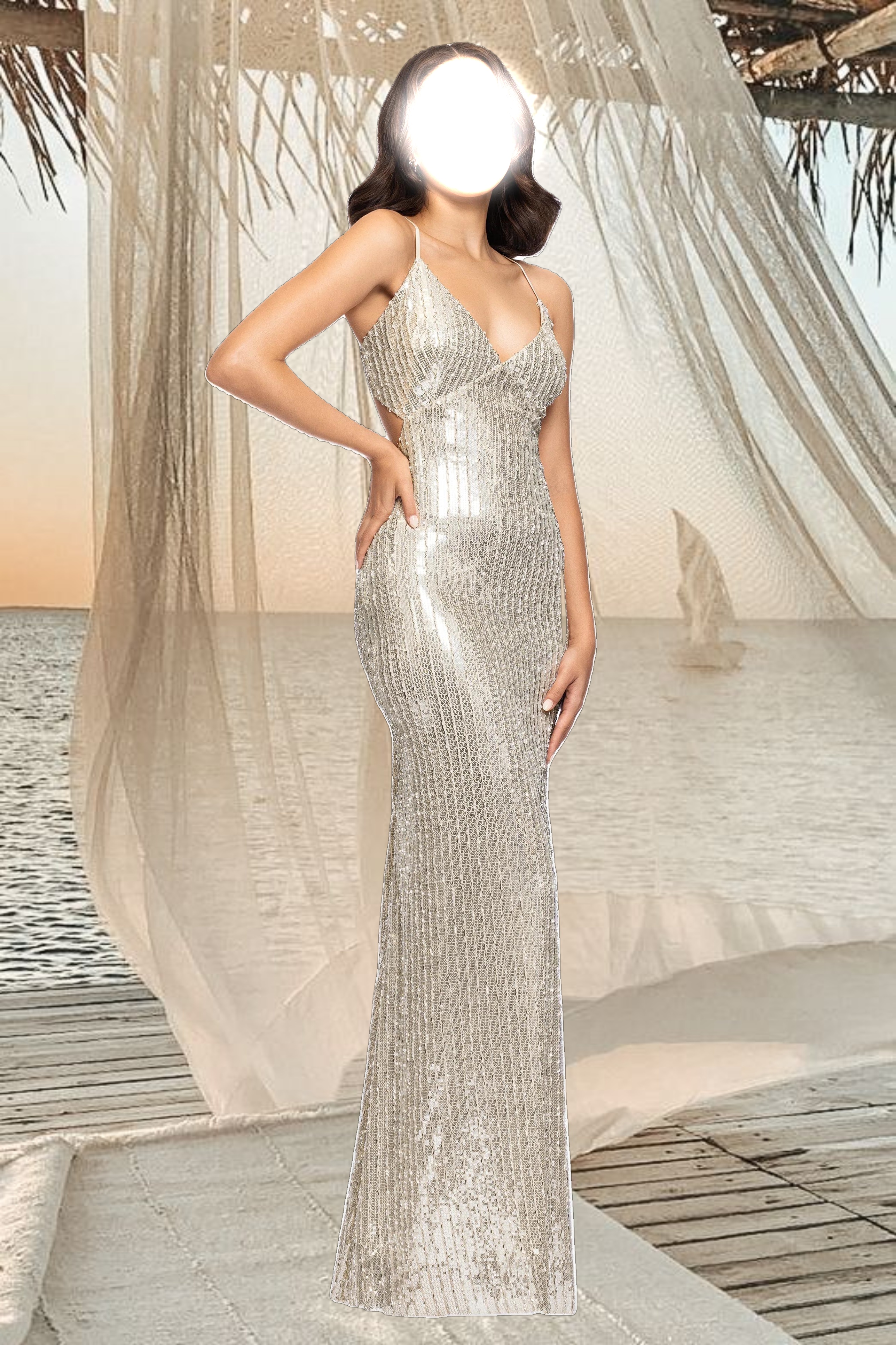 Shine bright in this glamorous floor-length gown featuring a fitted silhouette and delicate straps. The intricate beaded design catches the light beautifully, creating an elegant and show-stopping look. Perfect for galas, weddings, or any special event.