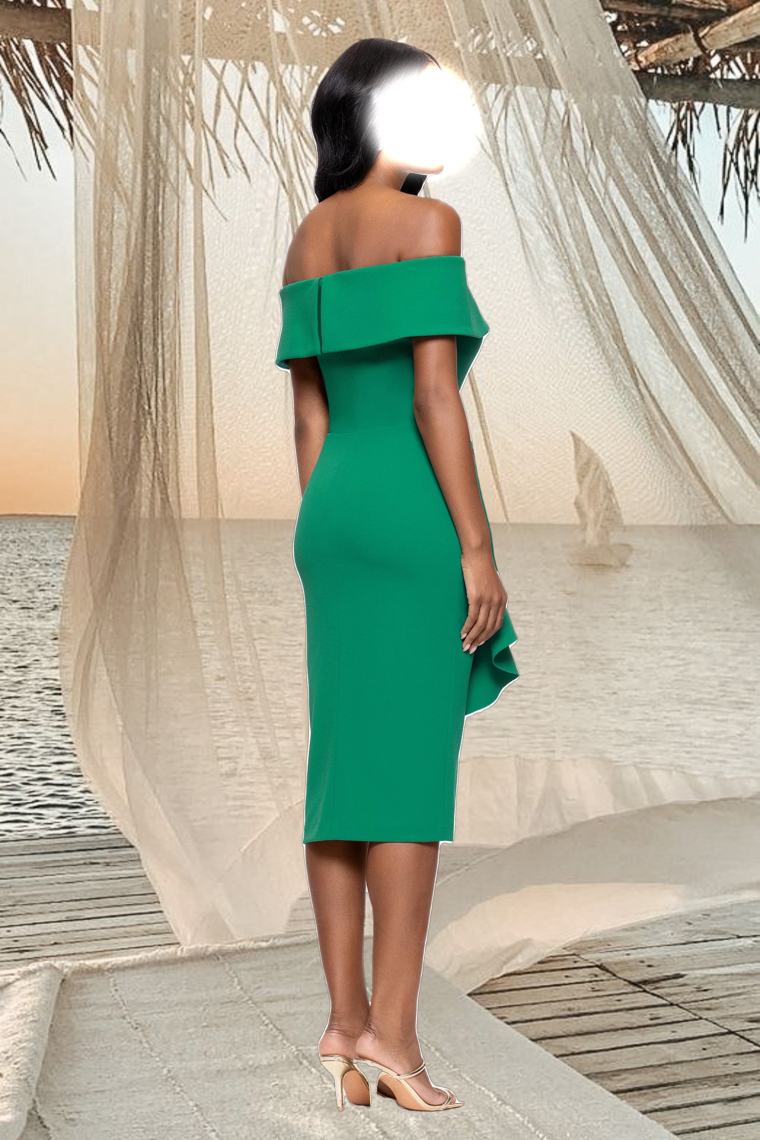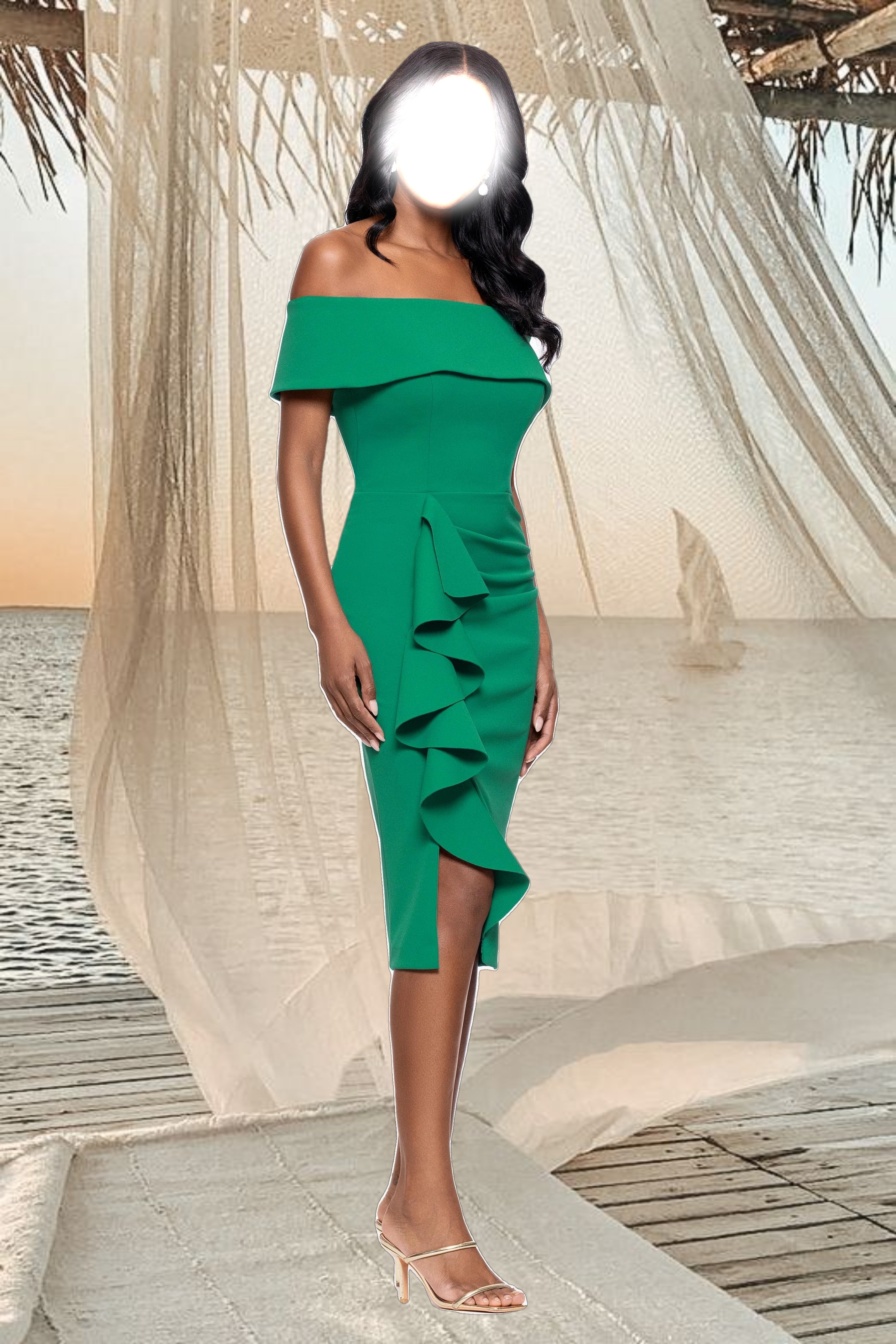 Make an unforgettable entrance in this off-the-shoulder cocktail dress. The structured bodice beautifully highlights your neckline, while the cascading ruffle detail adds a touch of drama. A sophisticated choice for any special occasion.