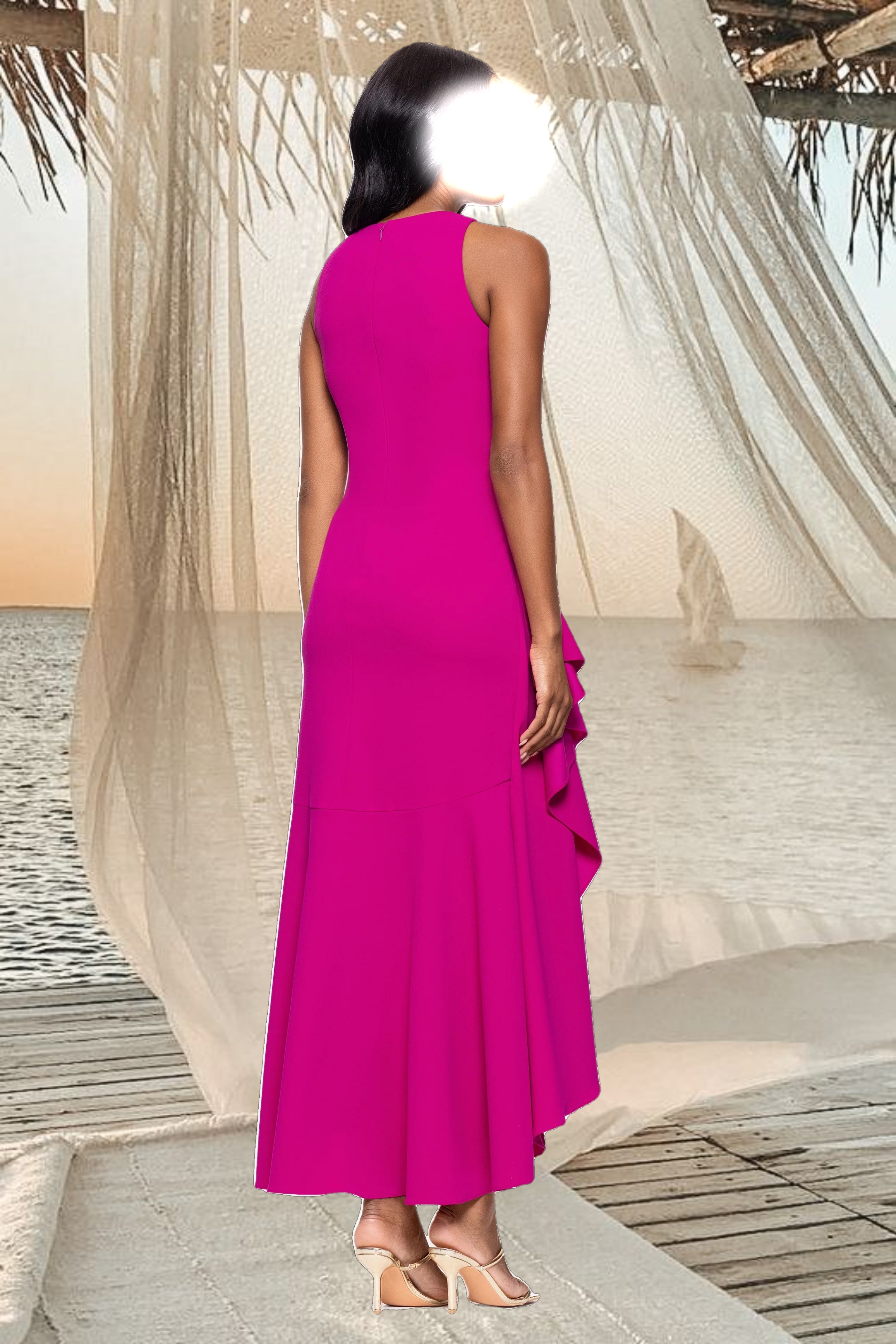 This sleeveless high-low gown features a sleek fitted bodice and cascading ruffle along the asymmetrical skirt. The soft stretch fabric flatters your shape while offering comfortable movement, making it perfect for weddings, cocktail parties, or galas.
