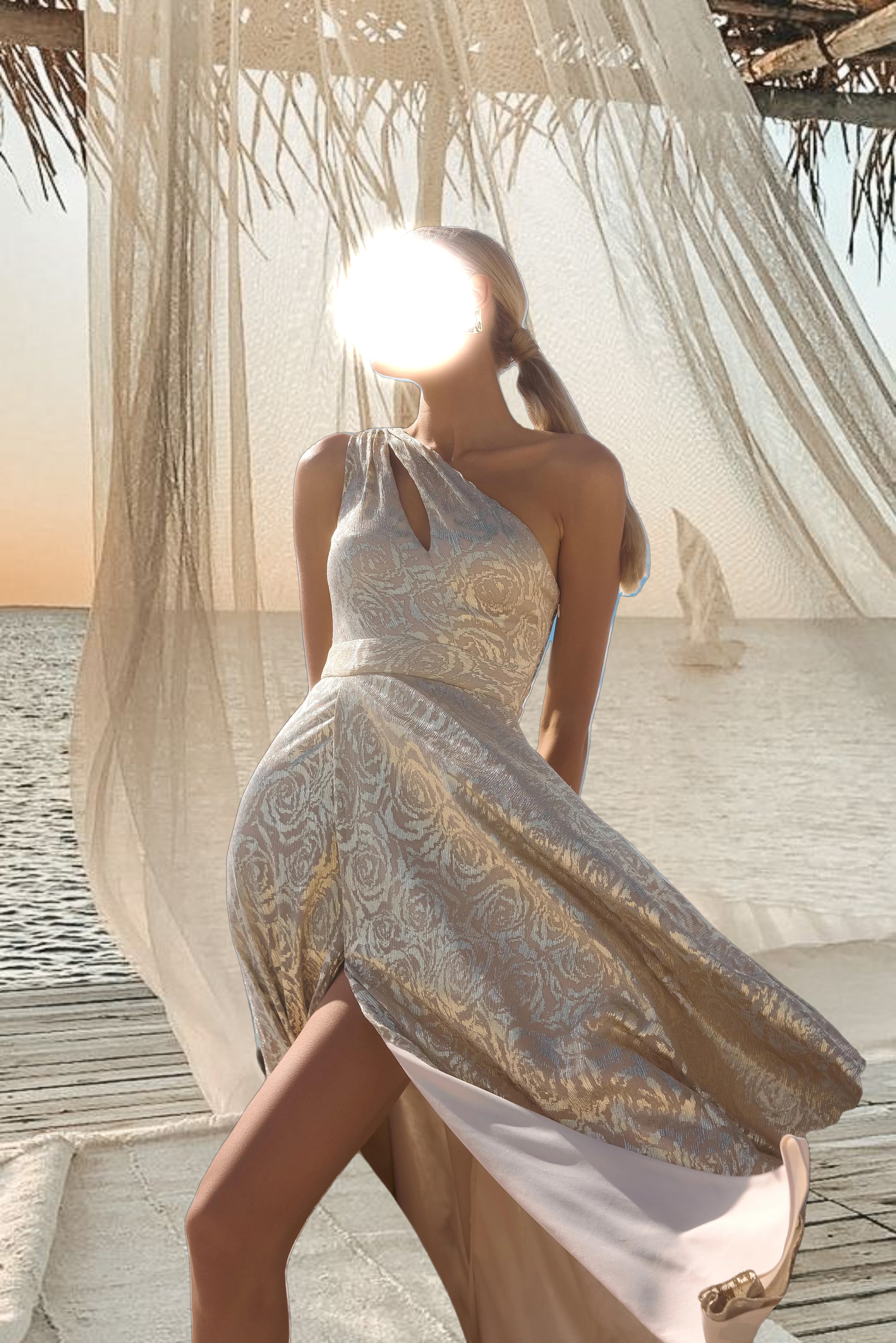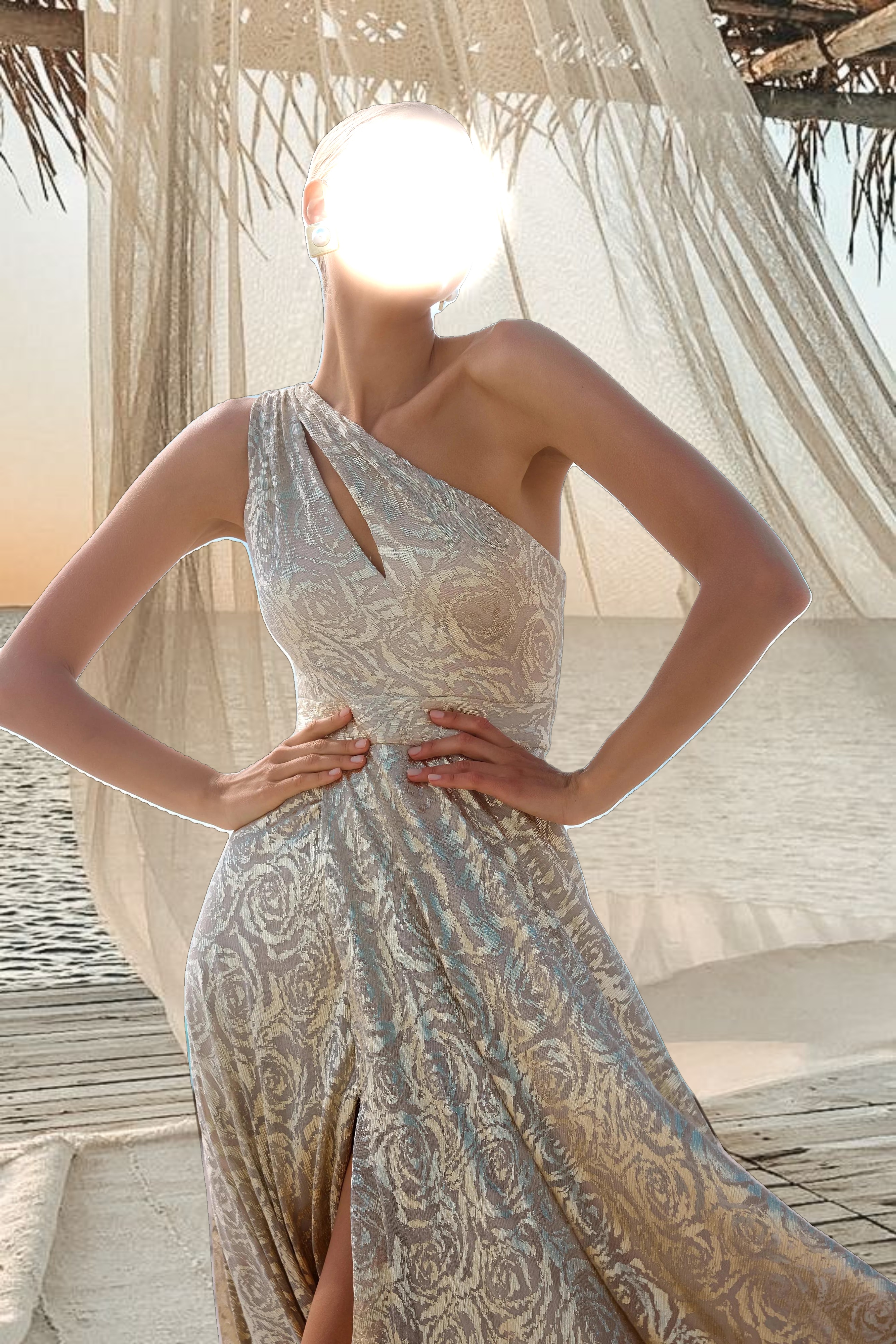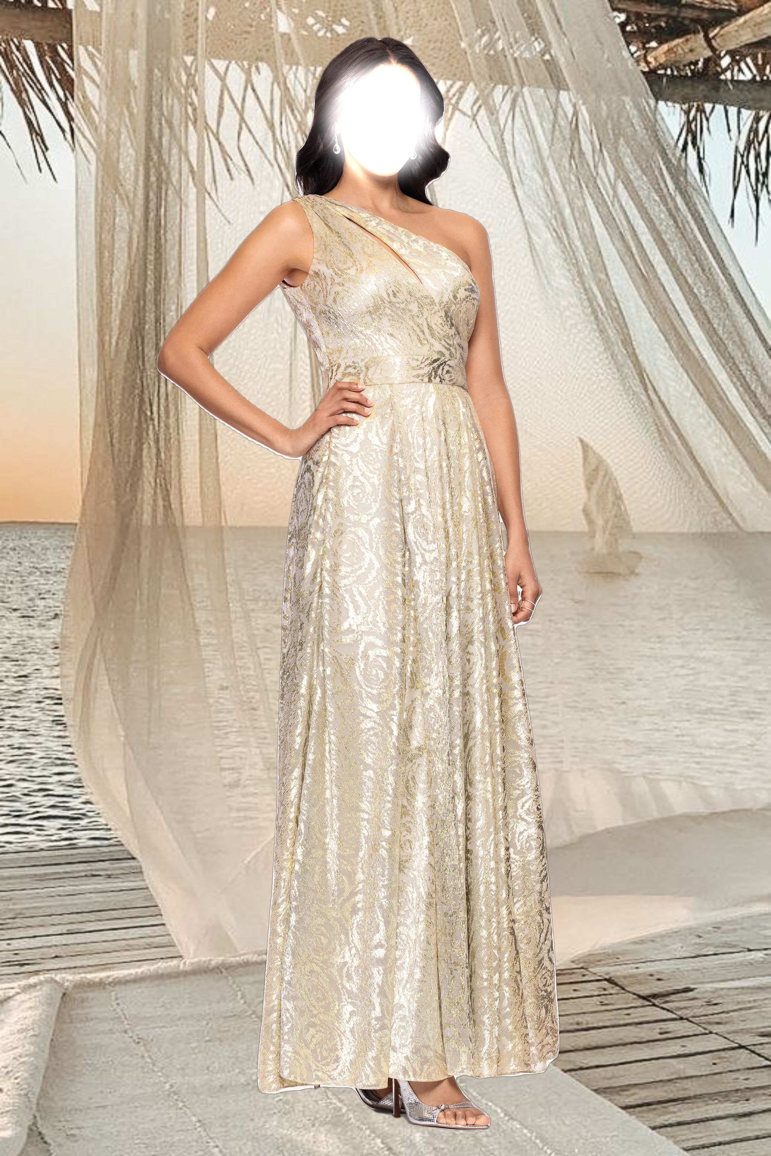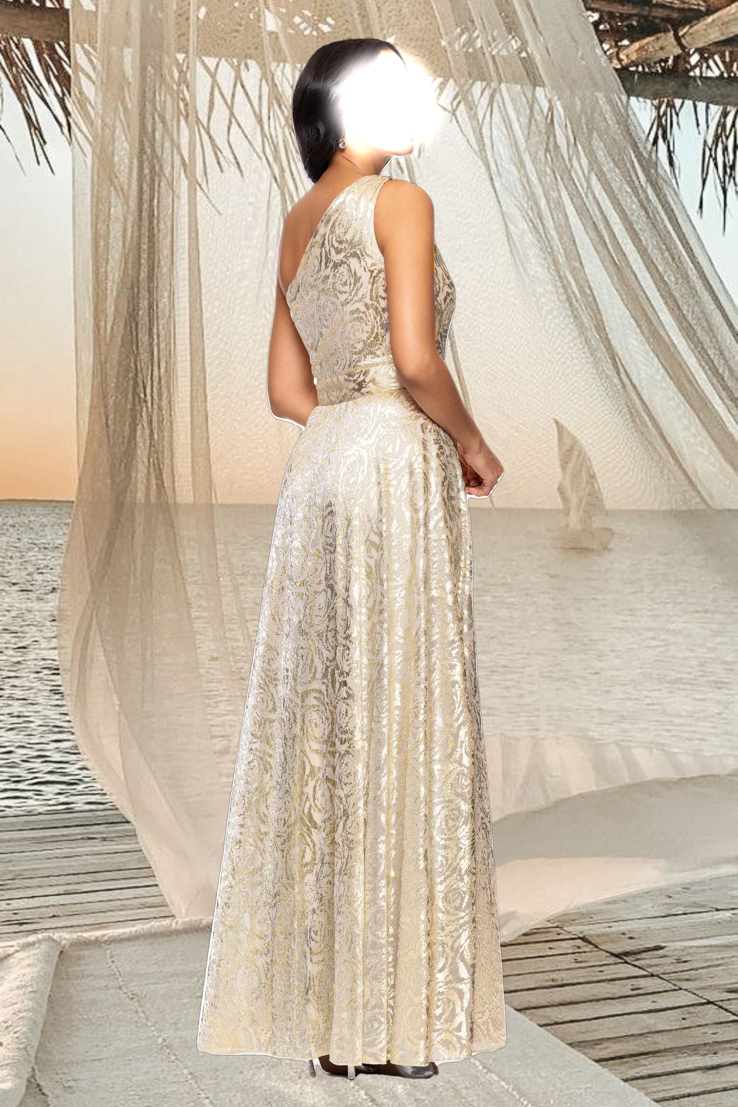 This stunning one-shoulder dress combines elegance with a modern twist. Featuring a beautiful metallic jacquard fabric, its sleek cut and high-low hemline create a flattering silhouette, perfect for making a bold statement at any formal event.