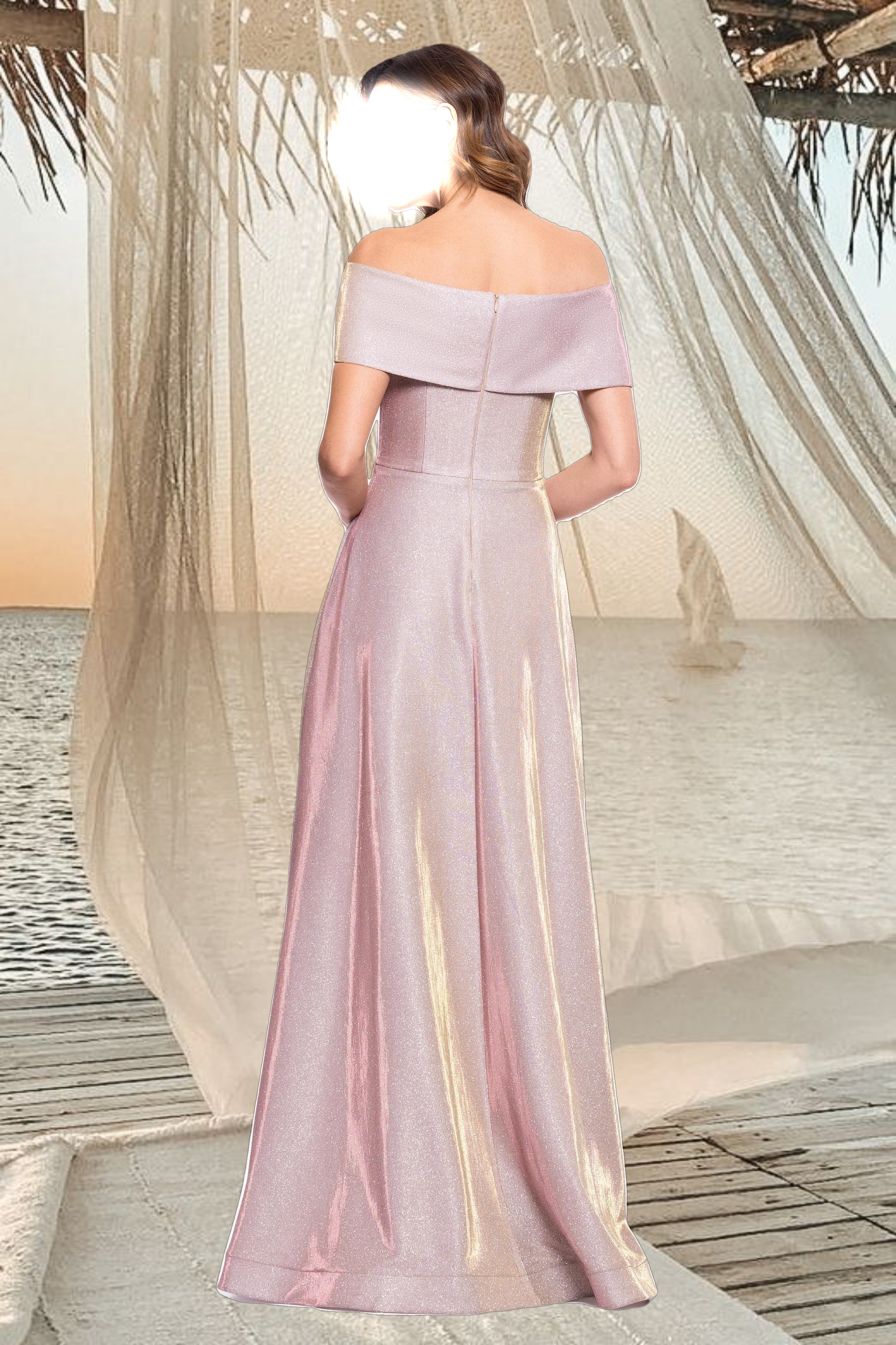 This luminous off-the-shoulder gown features a soft shimmer finish and a gracefully draped neckline overlay. The structured bodice flows into an A-line skirt that flatters the figure while offering movement and elegance—perfect for any formal celebration.