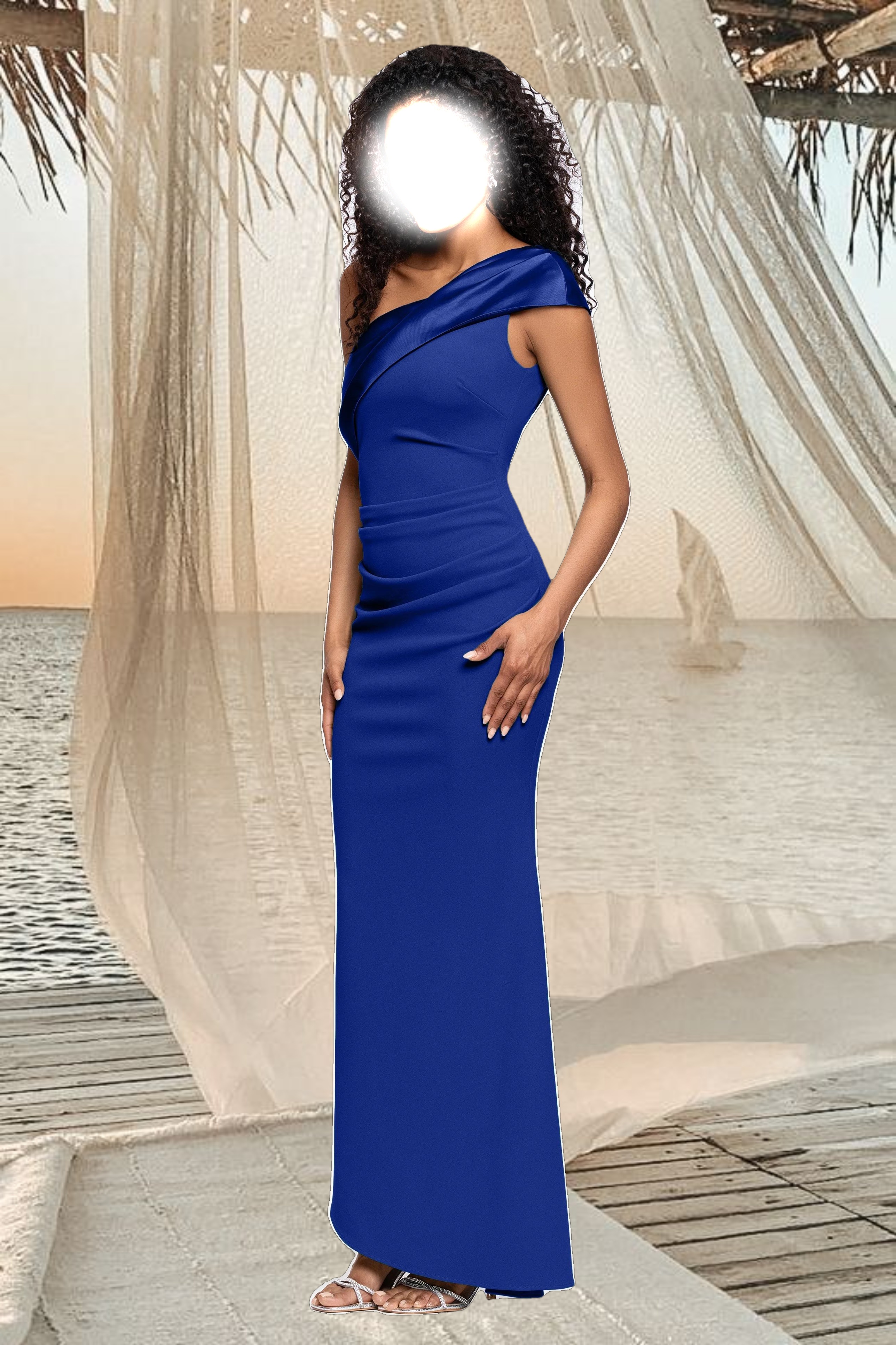Turn heads in this one-shoulder gown featuring a sleek satin banded neckline and flattering ruched detailing. The fitted silhouette and floor-length hem create a timeless, elegant look—ideal for weddings, galas, and black-tie events.