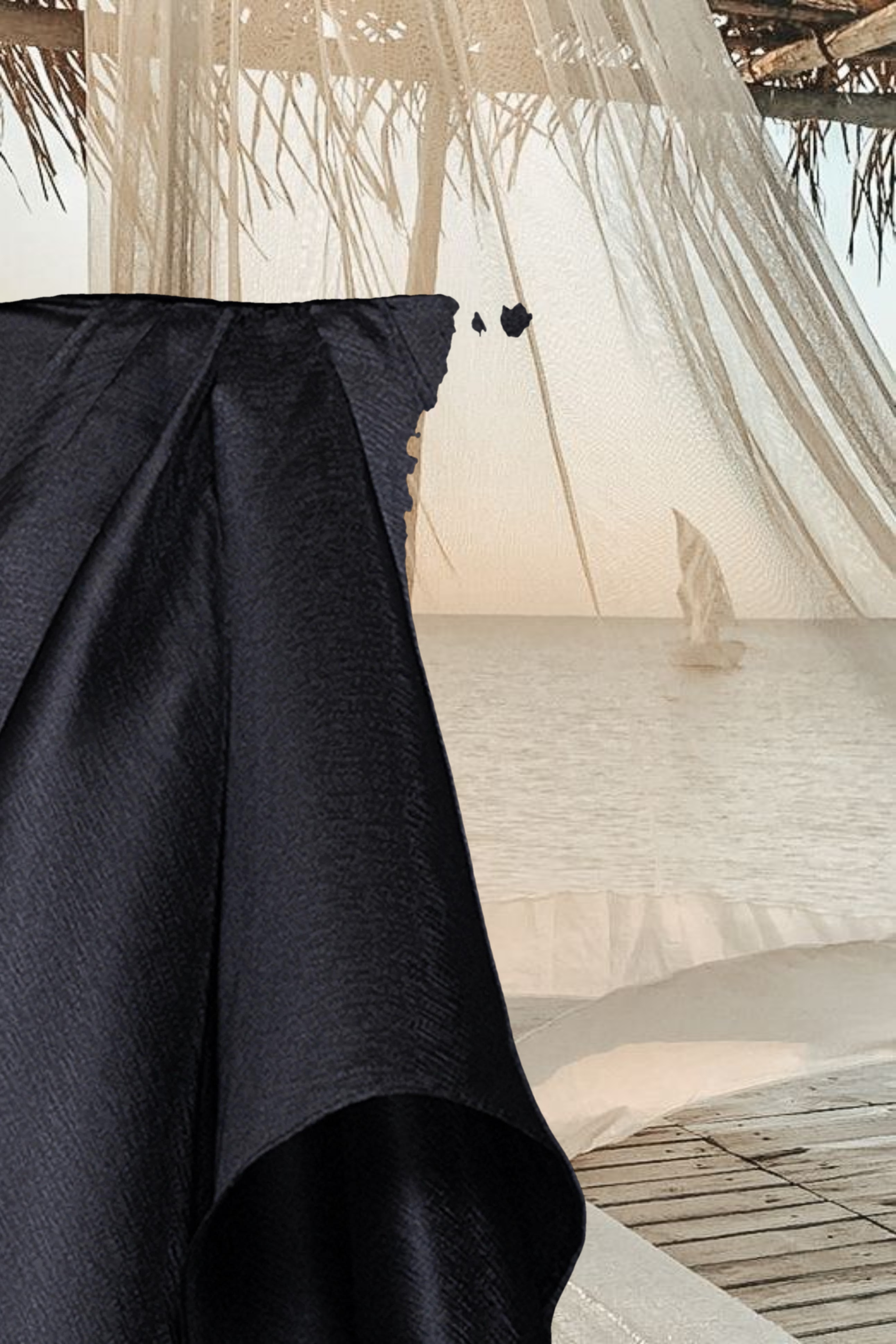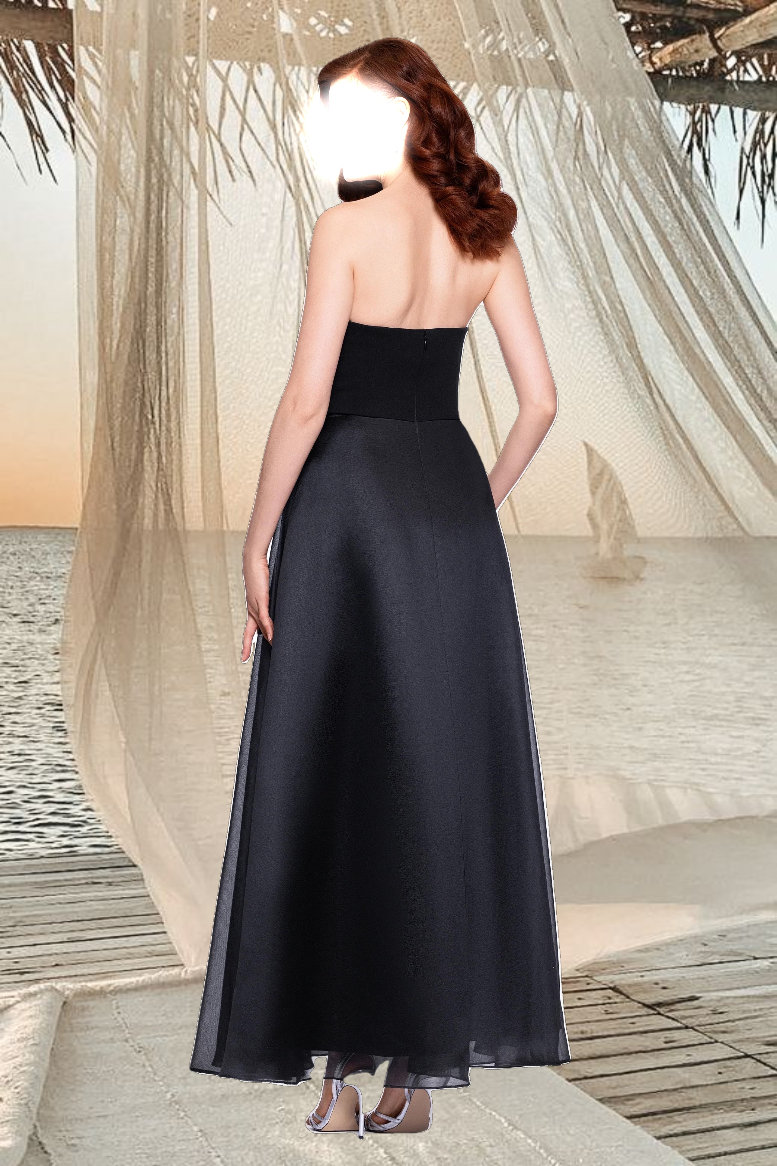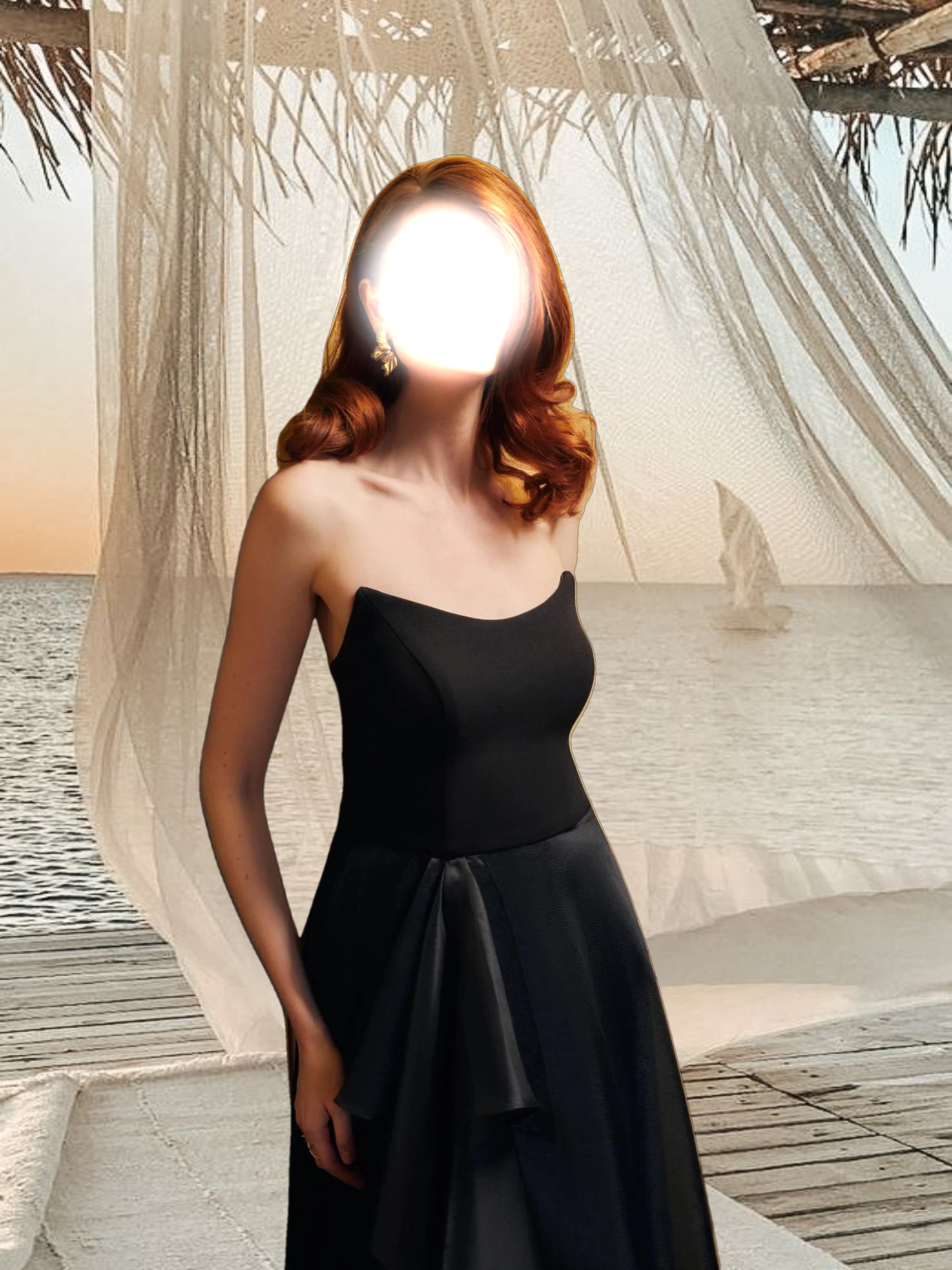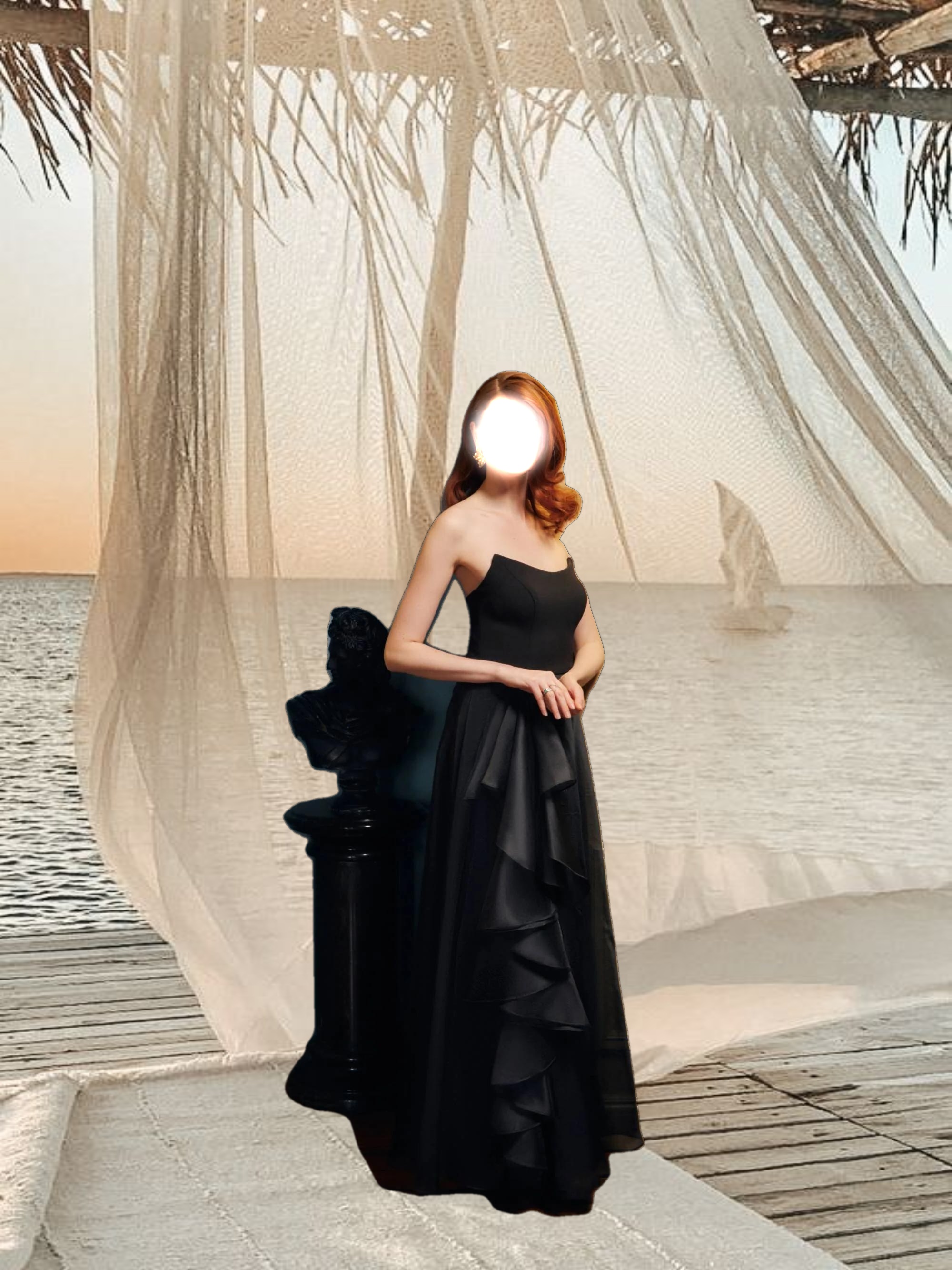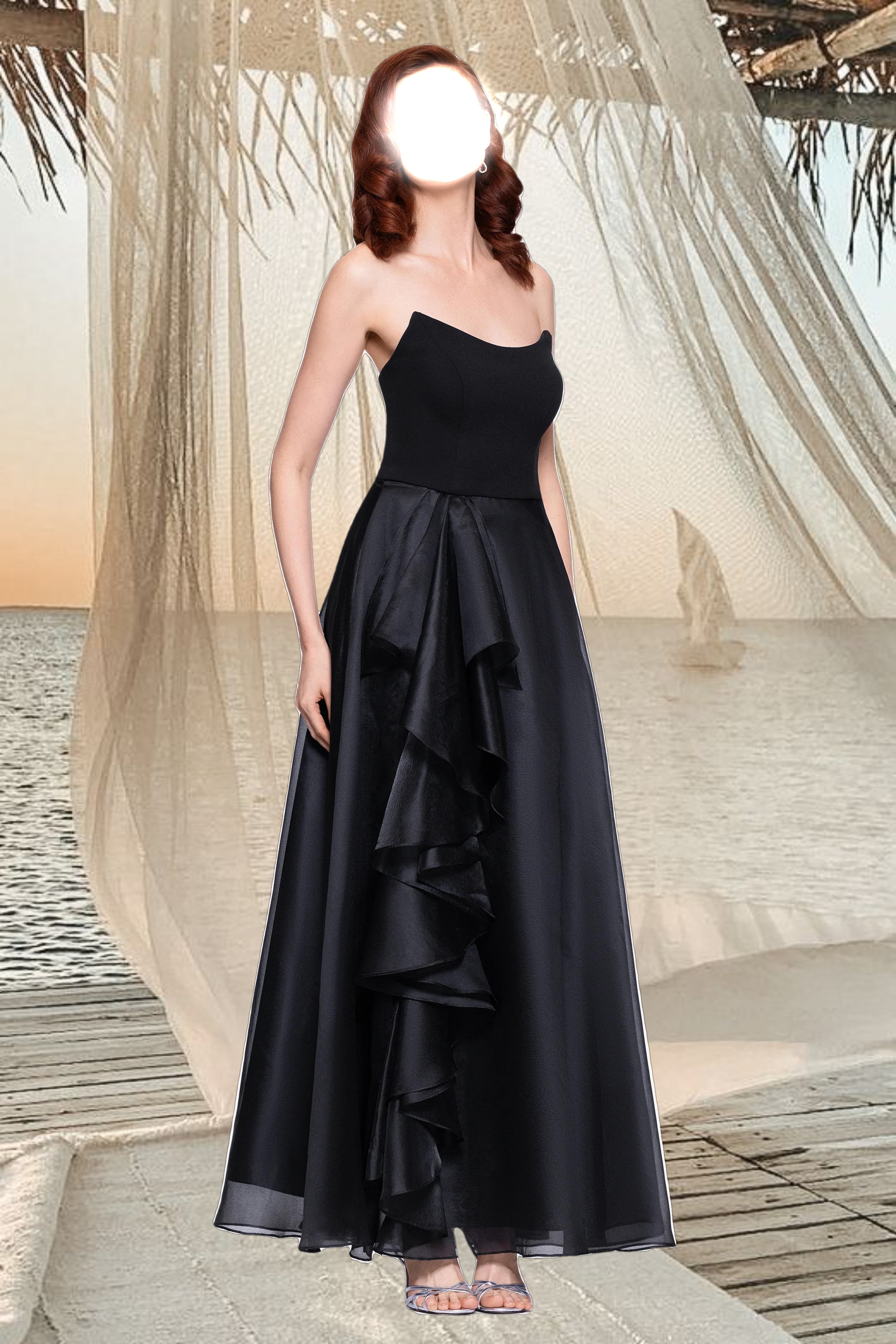 This strapless dress combines classic elegance with a modern twist. The smooth, fitted bodice transitions into a voluminous skirt with a dramatic ruffle, offering a chic silhouette perfect for formal events or evening galas.