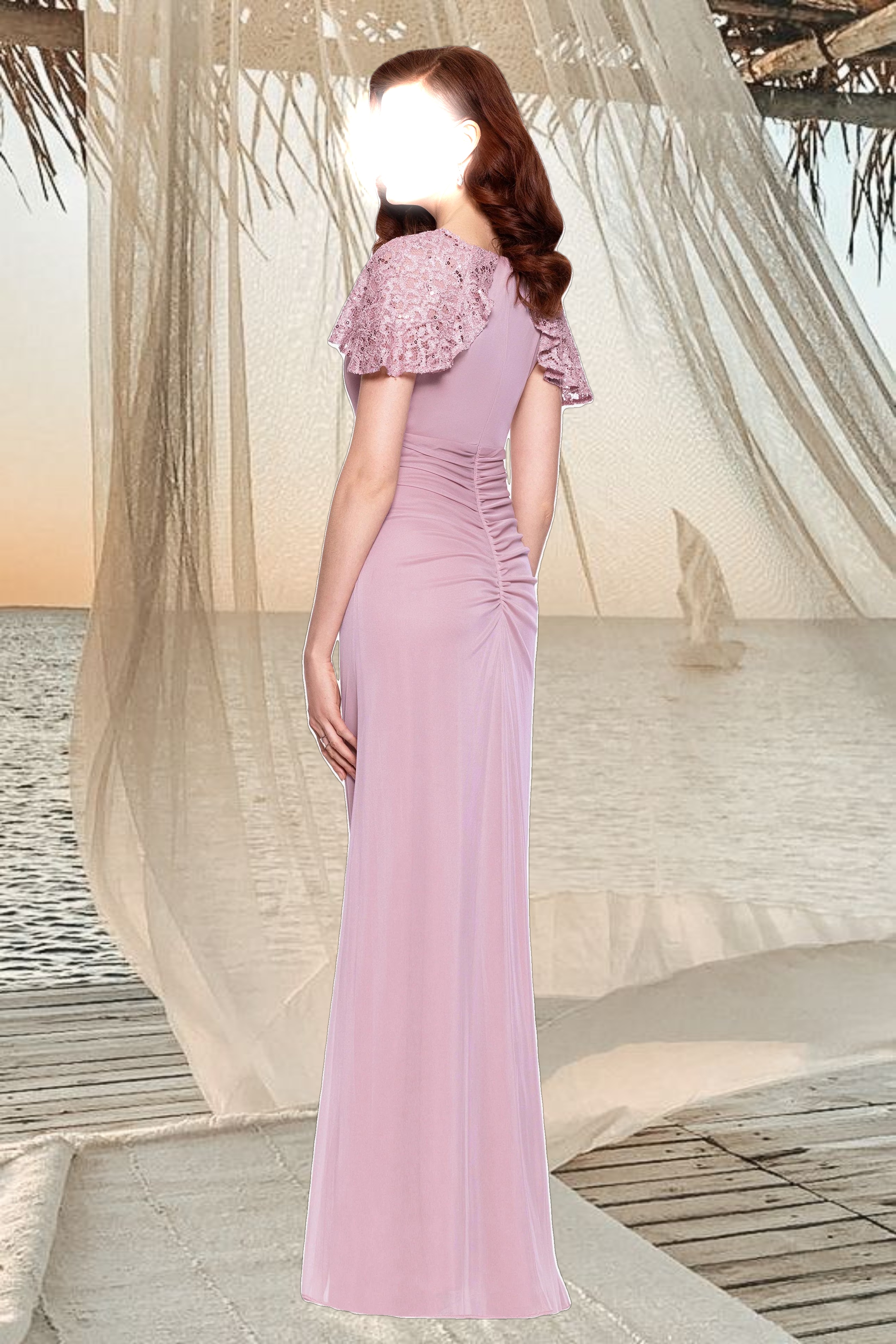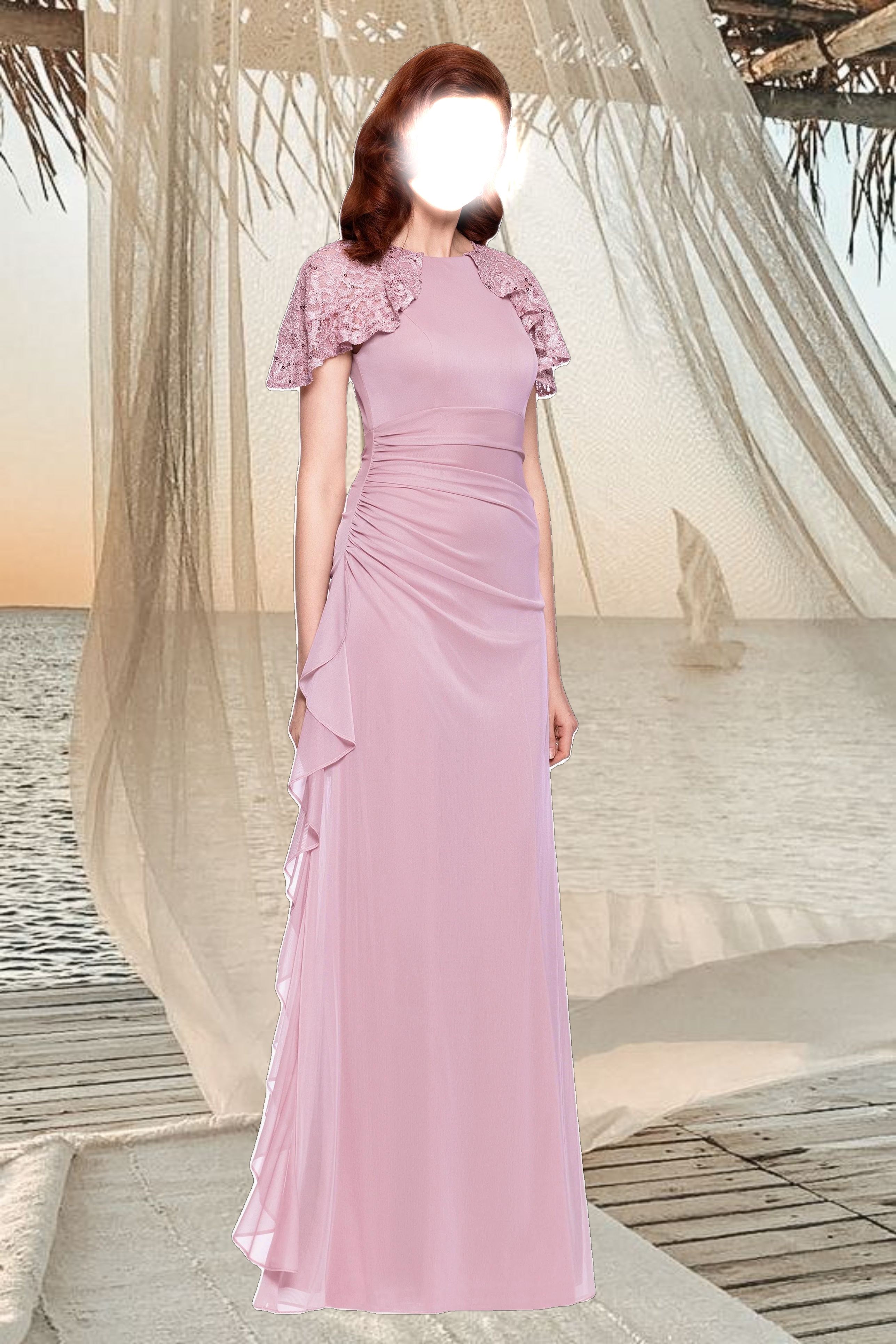 Grace meets sophistication in this stunning gown, featuring delicate lace cap sleeves and elegant ruching for a flattering silhouette. The soft rose hue adds a romantic touch, while cascading side draping brings effortless movement. A perfect choice for formal events!
