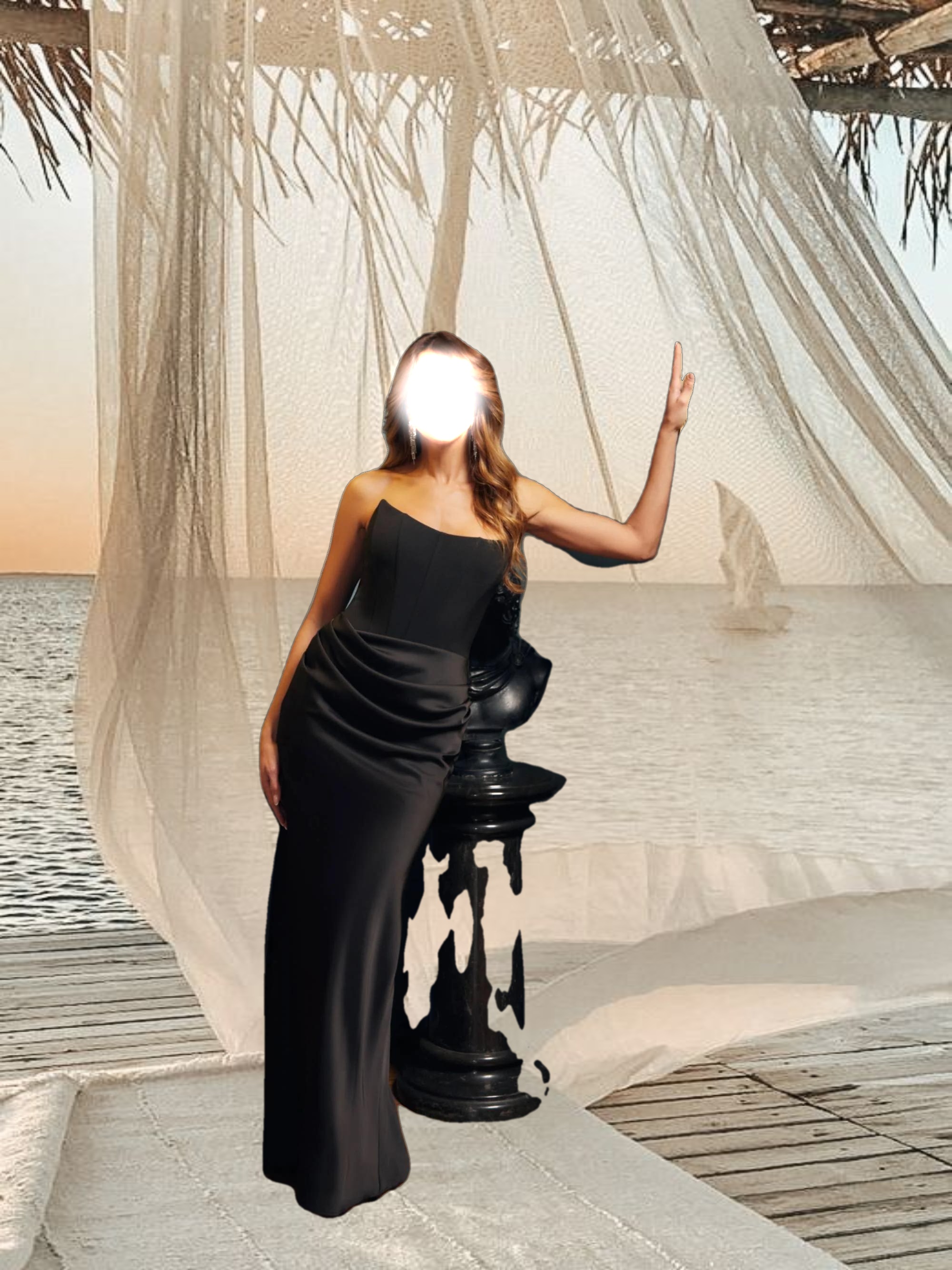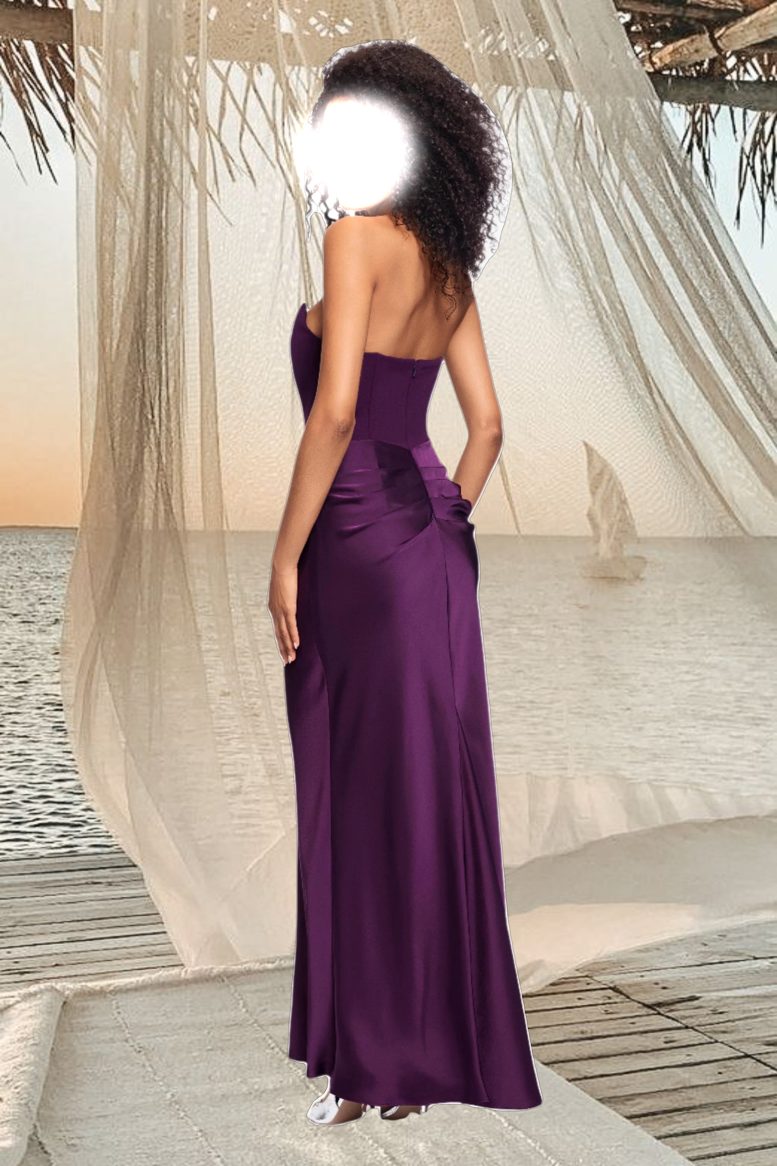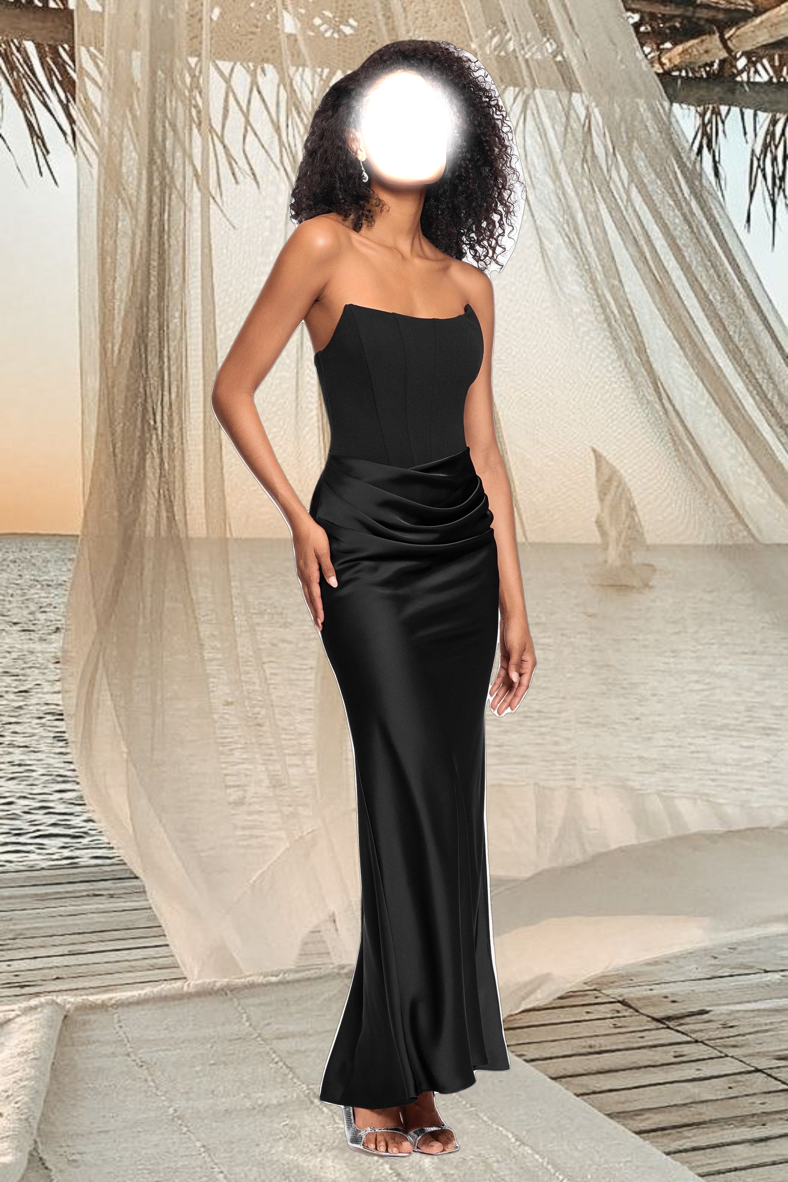 This strapless gown is a vision of sleek sophistication, featuring a structured bodice that beautifully highlights the neckline. The flowing satin skirt drapes gracefully for a polished silhouette, exuding understated elegance. Ideal for formal events, this gown seamlessly combines timeless appeal with a modern touch.