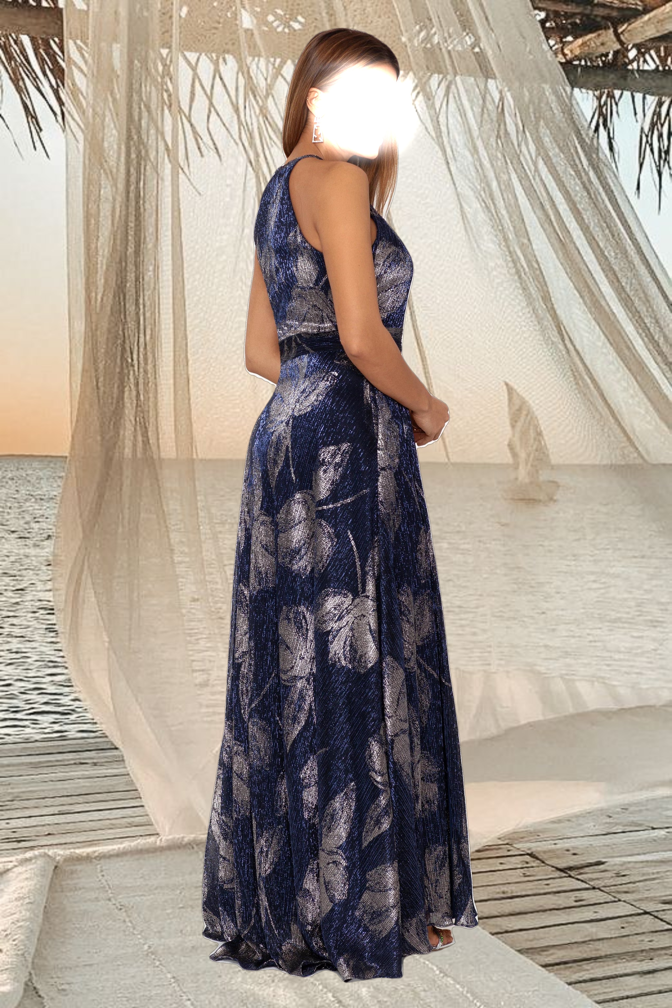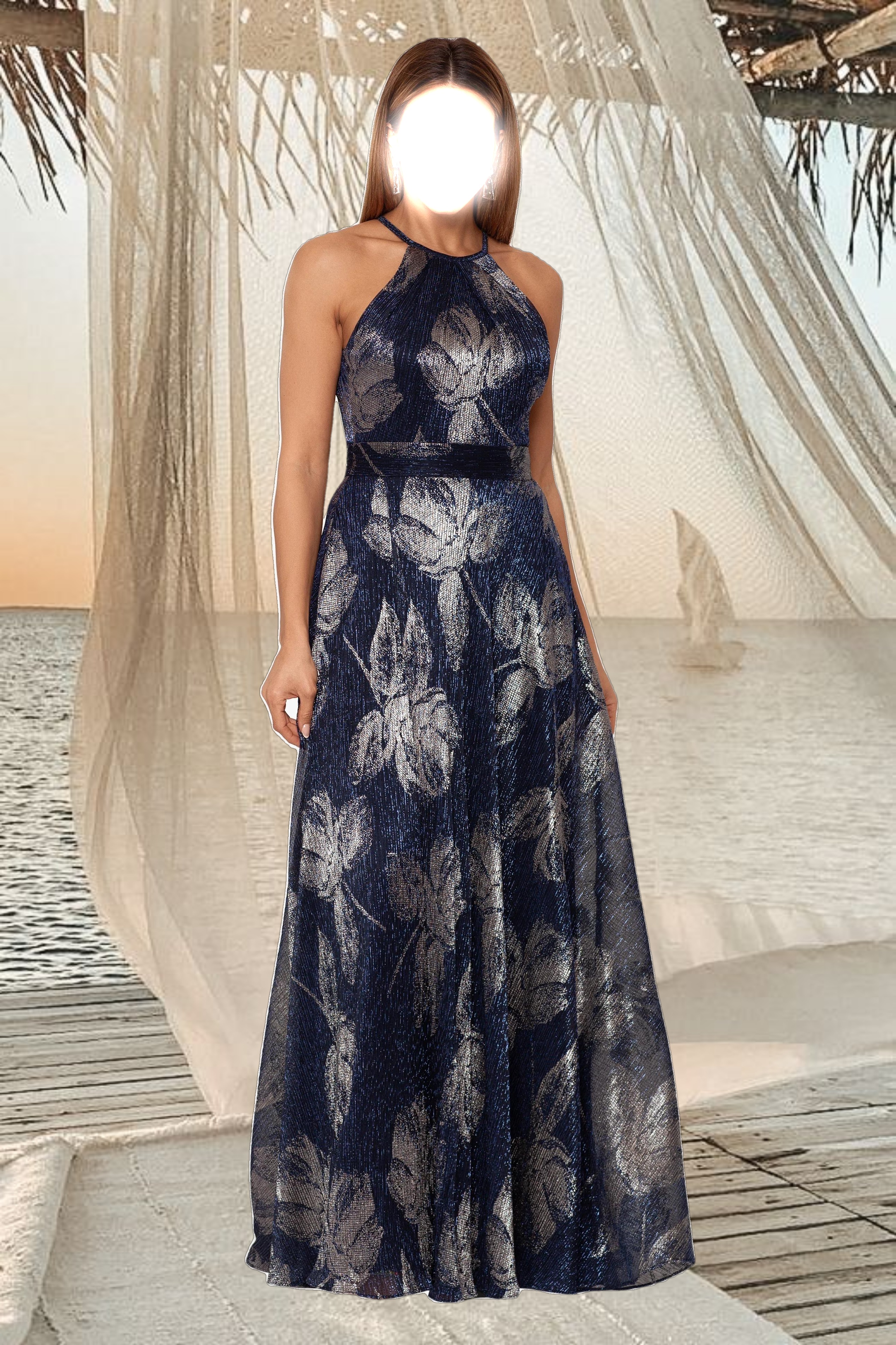 Release your inner diva with the "Ilaria" Long Halter Foil Print Dress. This metallic foil dress features a fully lined halter top with a hidden back zipper for a seamless look. The cinched waist and long gown style will have you feeling like the star of the show. Shine on, darling.