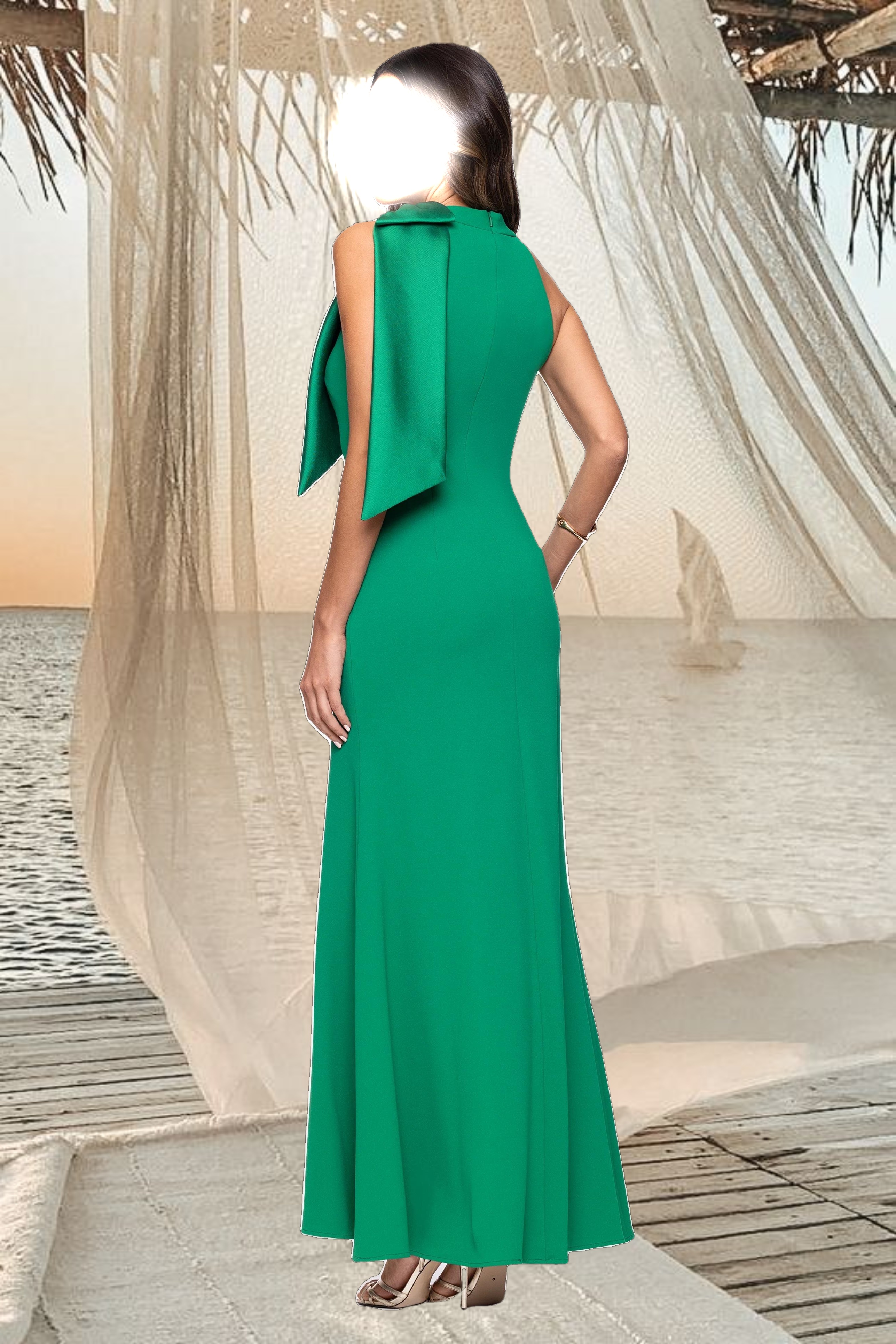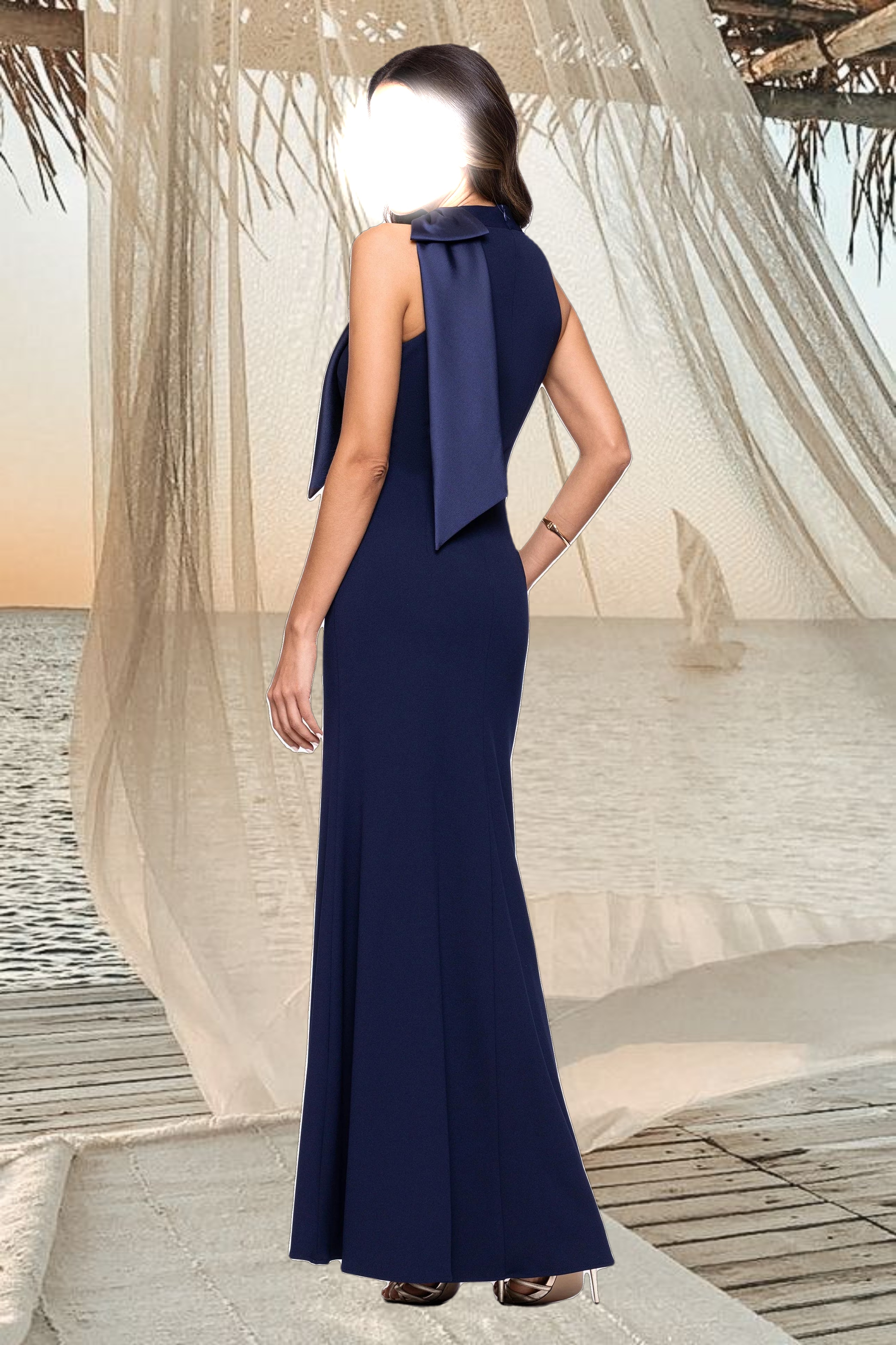 Make a striking entrance in this sophisticated halter gown, featuring a chic asymmetrical bow detail at the shoulder and a flattering sheath silhouette. The floor-length design exudes timeless elegance, making it perfect for formal occasions and evening soirees.