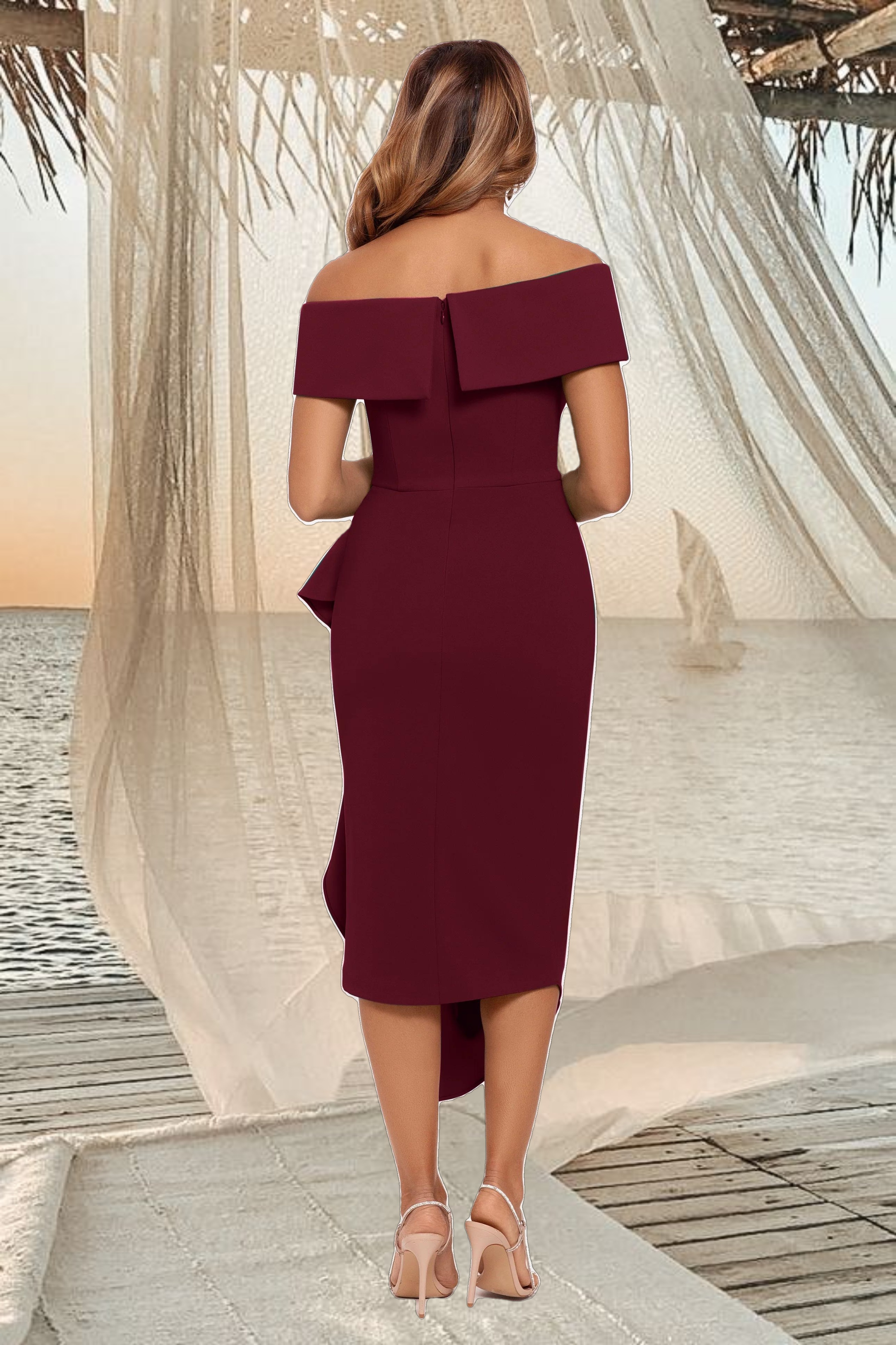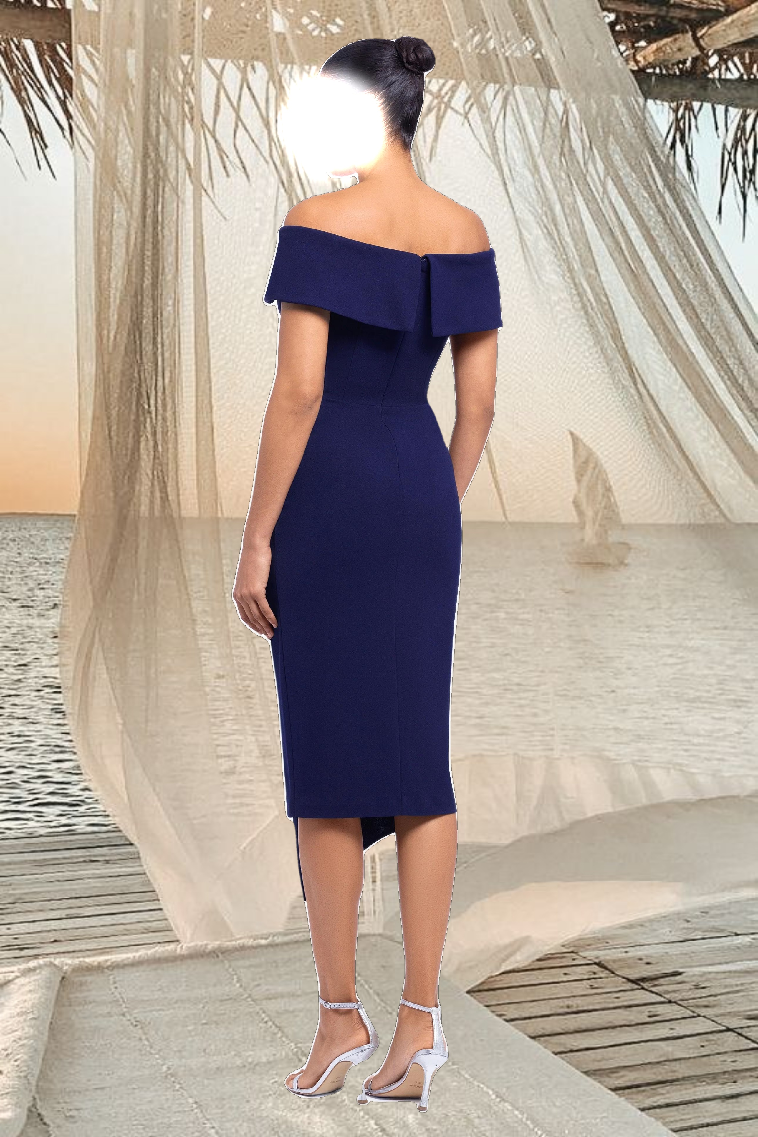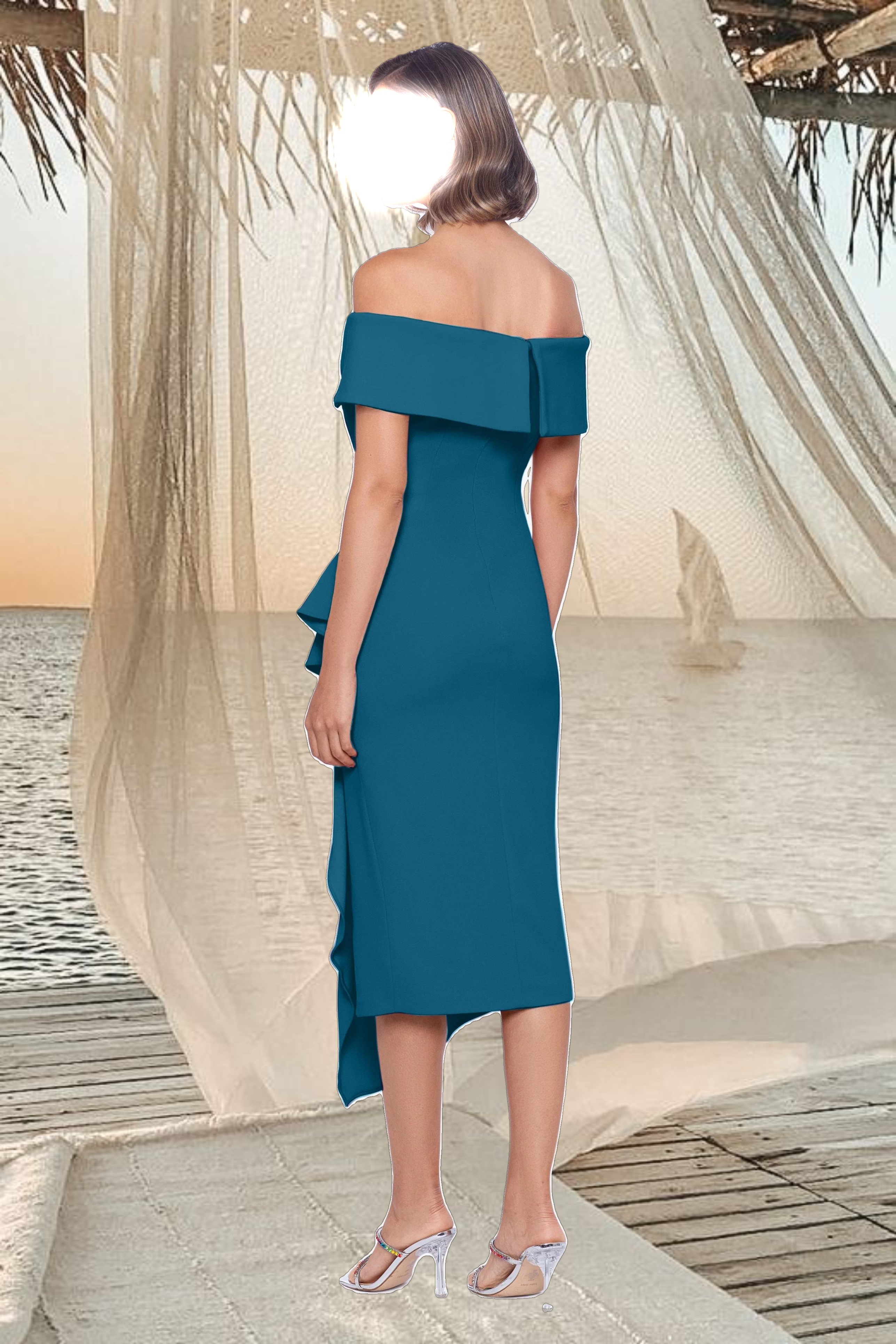 - Details: Off the Shoulder, Cuffed, Side Ruching, Midi