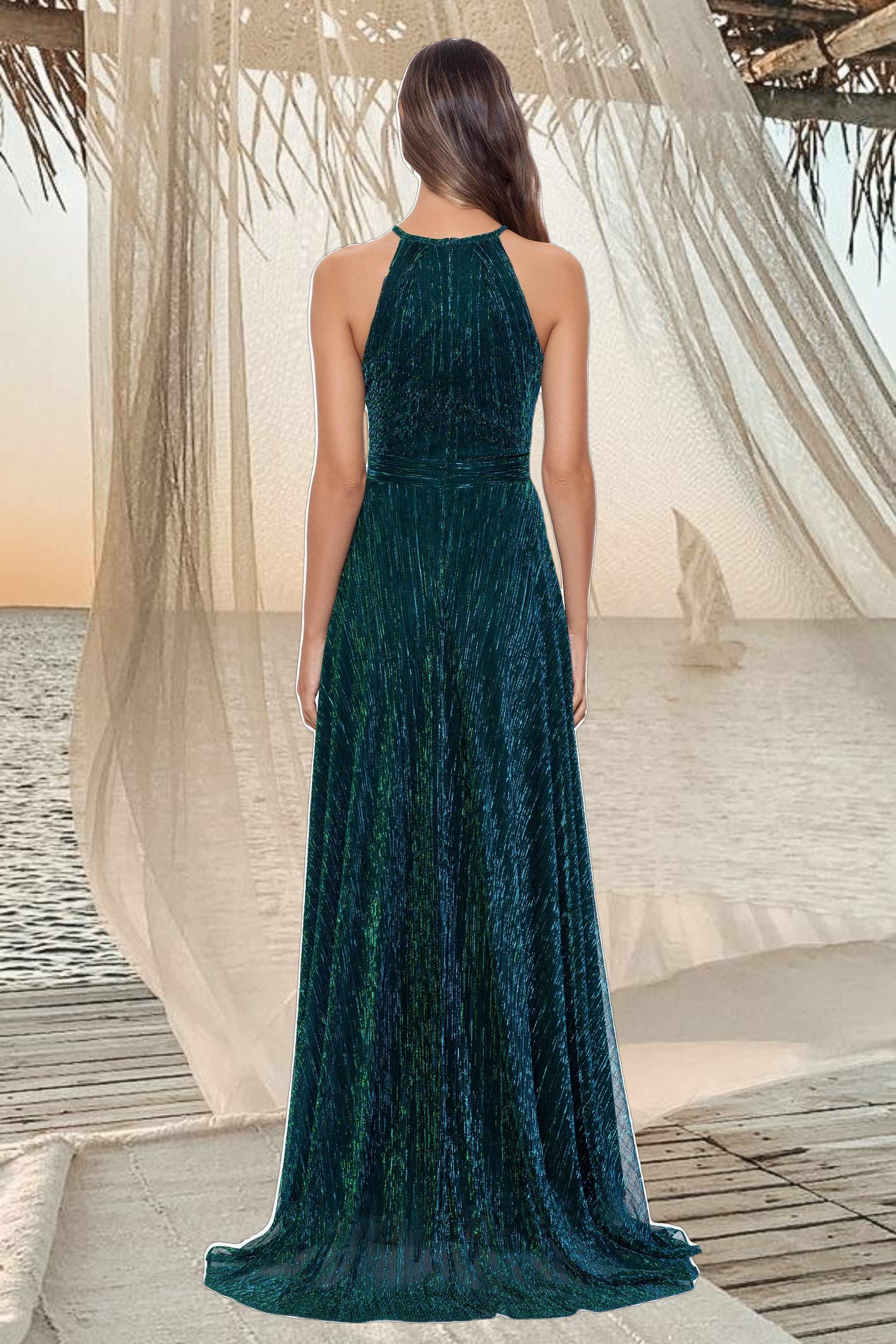- Details: Halter Top, Cinched Waist, Metallic, Skirt with Slit, Pockets at Hips