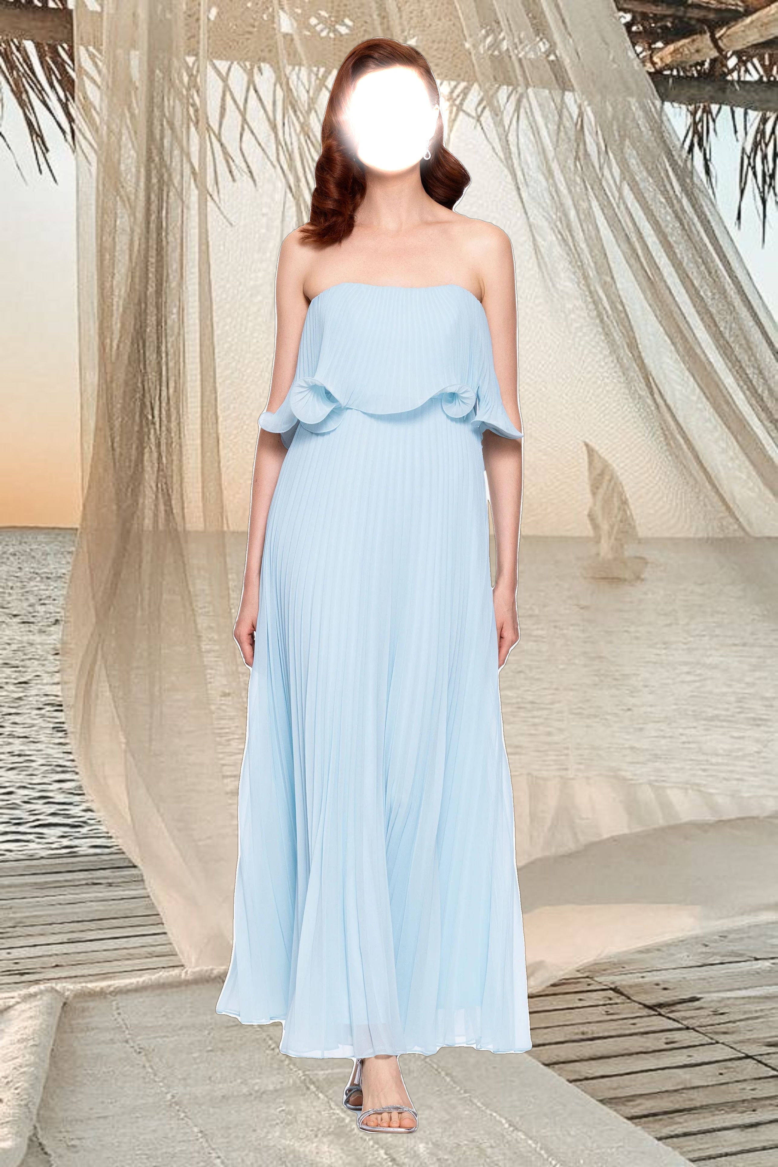This strapless gown features a flowing silhouette with a delicate ruffled overlay, creating a soft, feminine look. Perfect for spring or summer events like weddings or garden parties, it combines elegance with effortless charm.