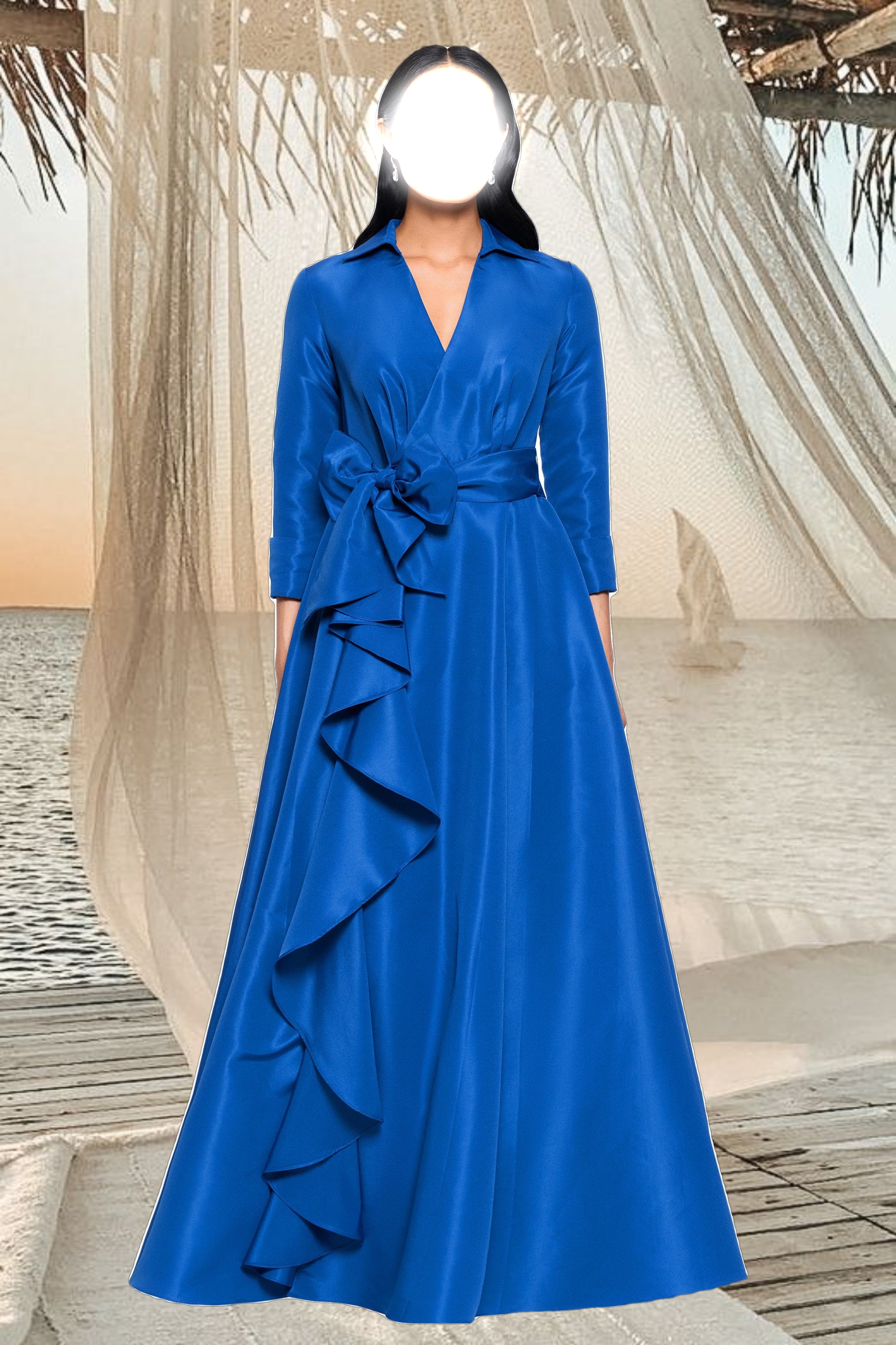 "Beverly" Taffeta 3/4 Sleeve V-Neck A-Line Bow and Ruffle Floor Length Dress