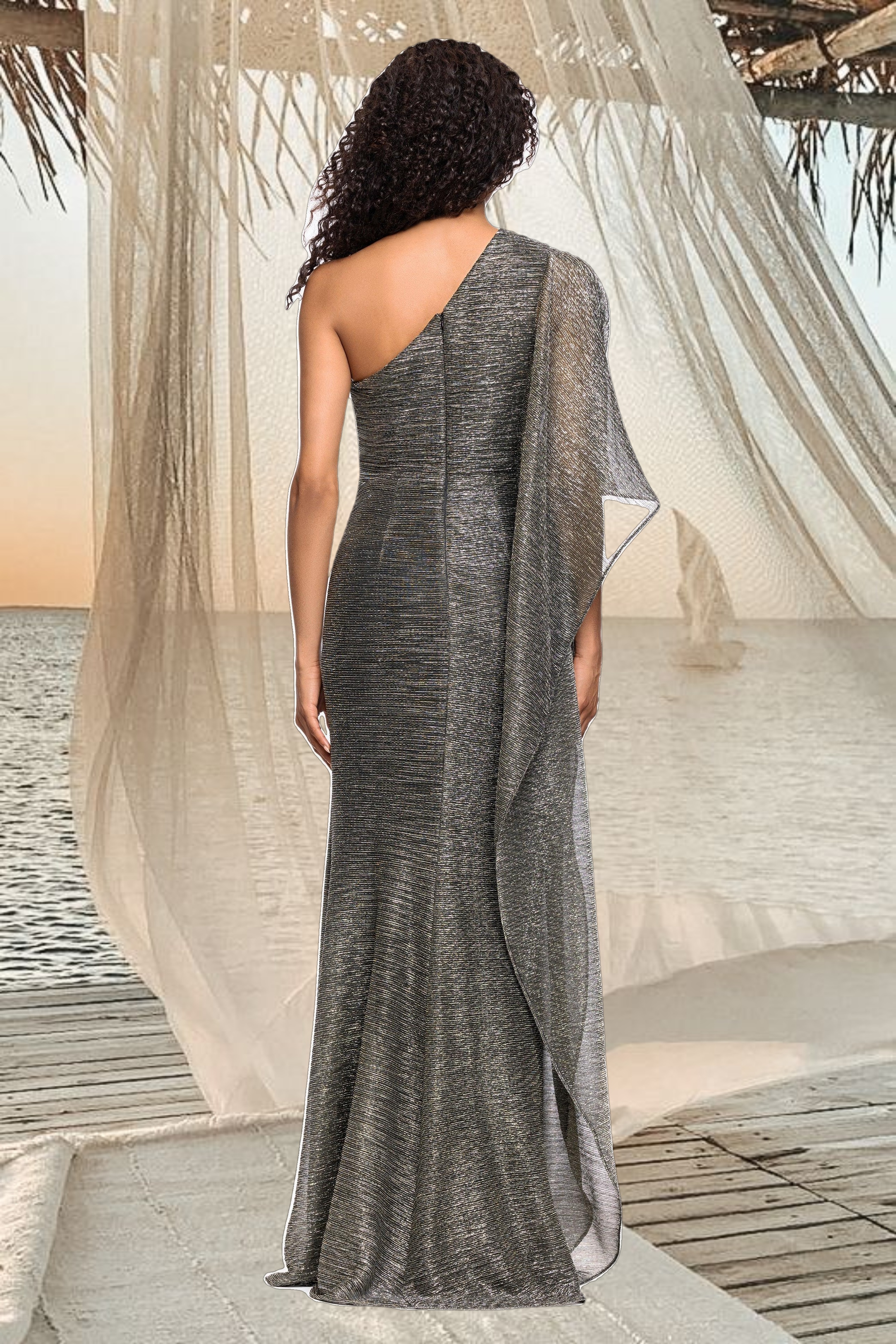 "Graclyn" Metallic Knit One Shoulder Flowy Sleeve Floor Length Dress