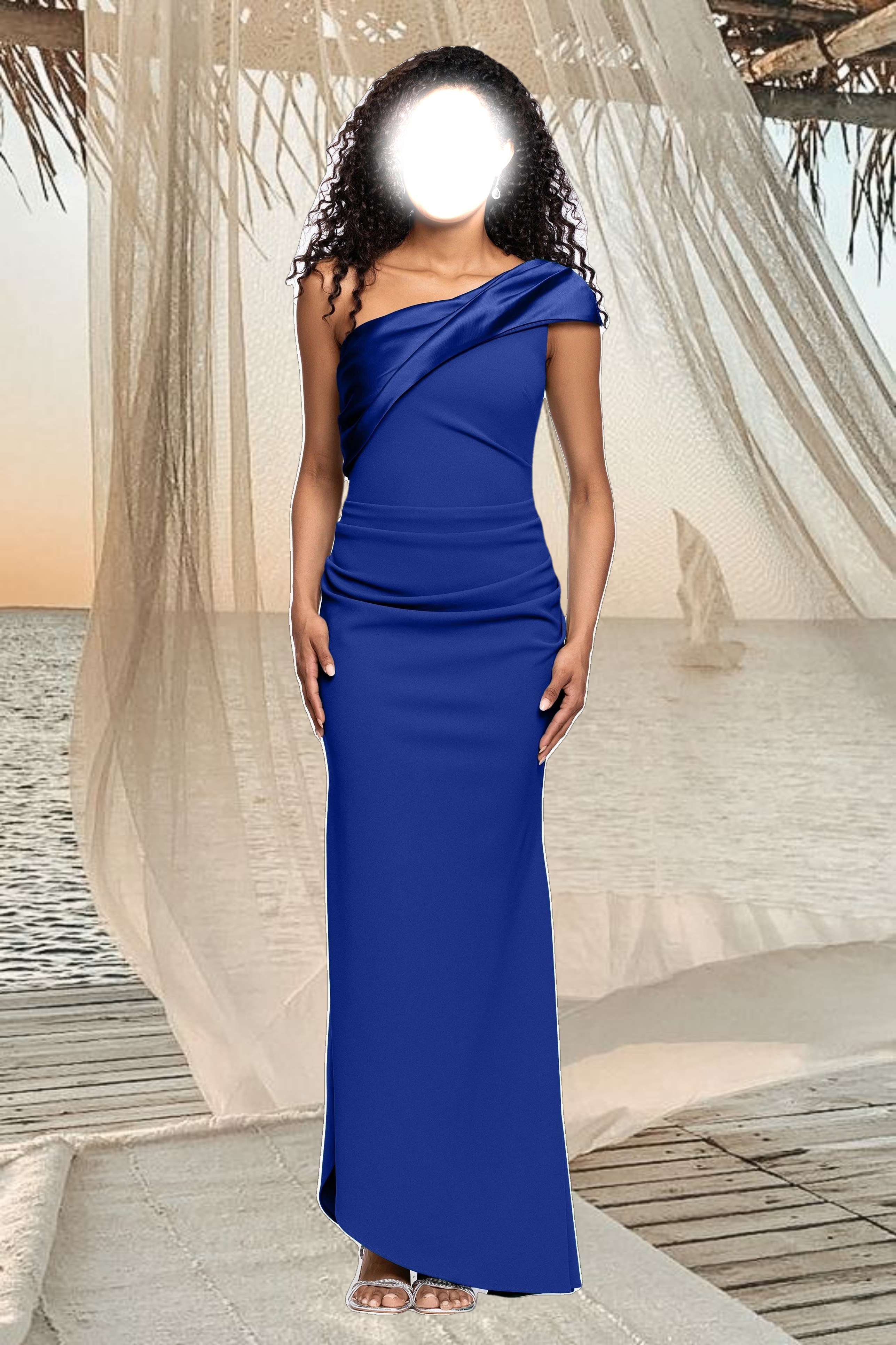 "Belinda" Scuba Crepe Drop Shoulder Satin Banded Neckline Floor Length Dress