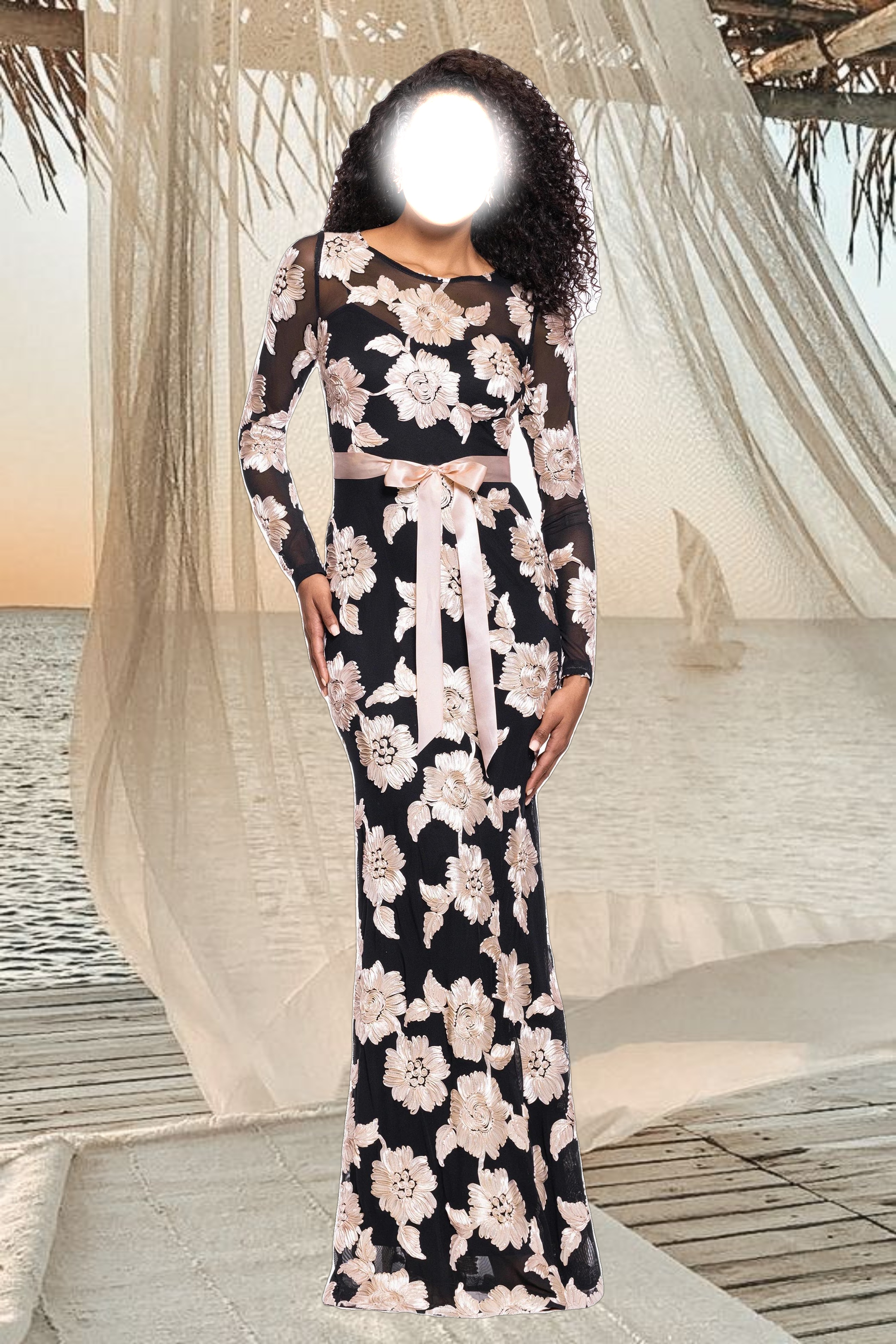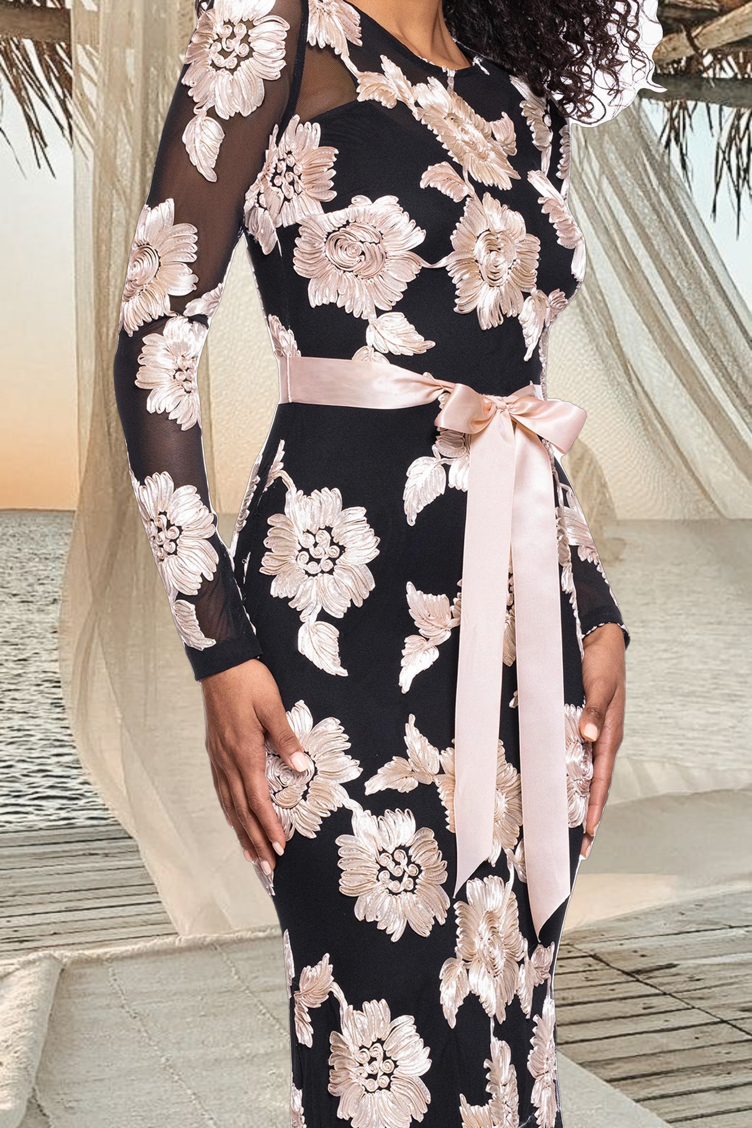 "Juliana" Soutache Mesh Long Sleeve Floor Length Dress