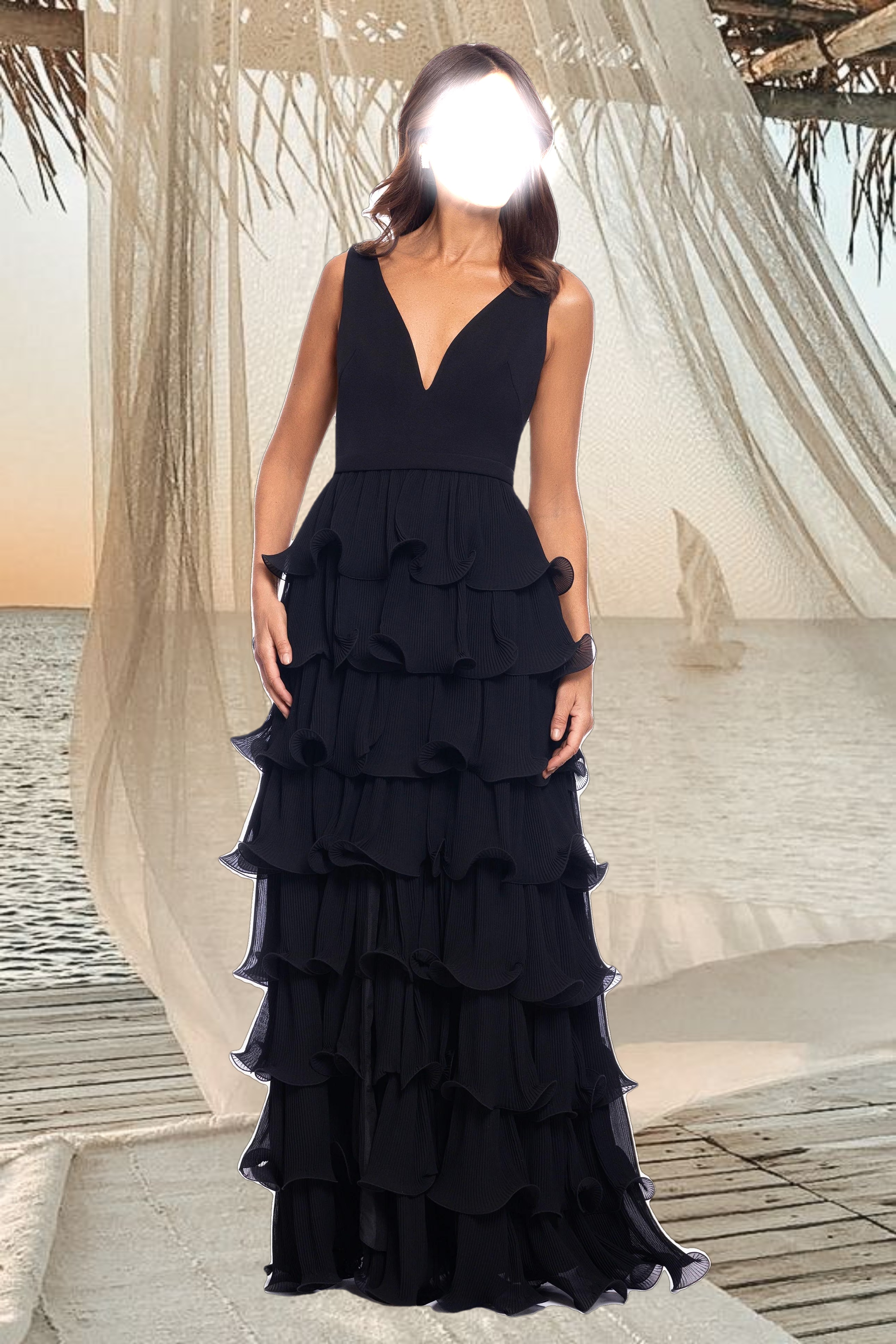 Petite "Candace" Long V- Neck Hi Low Cascade Dress