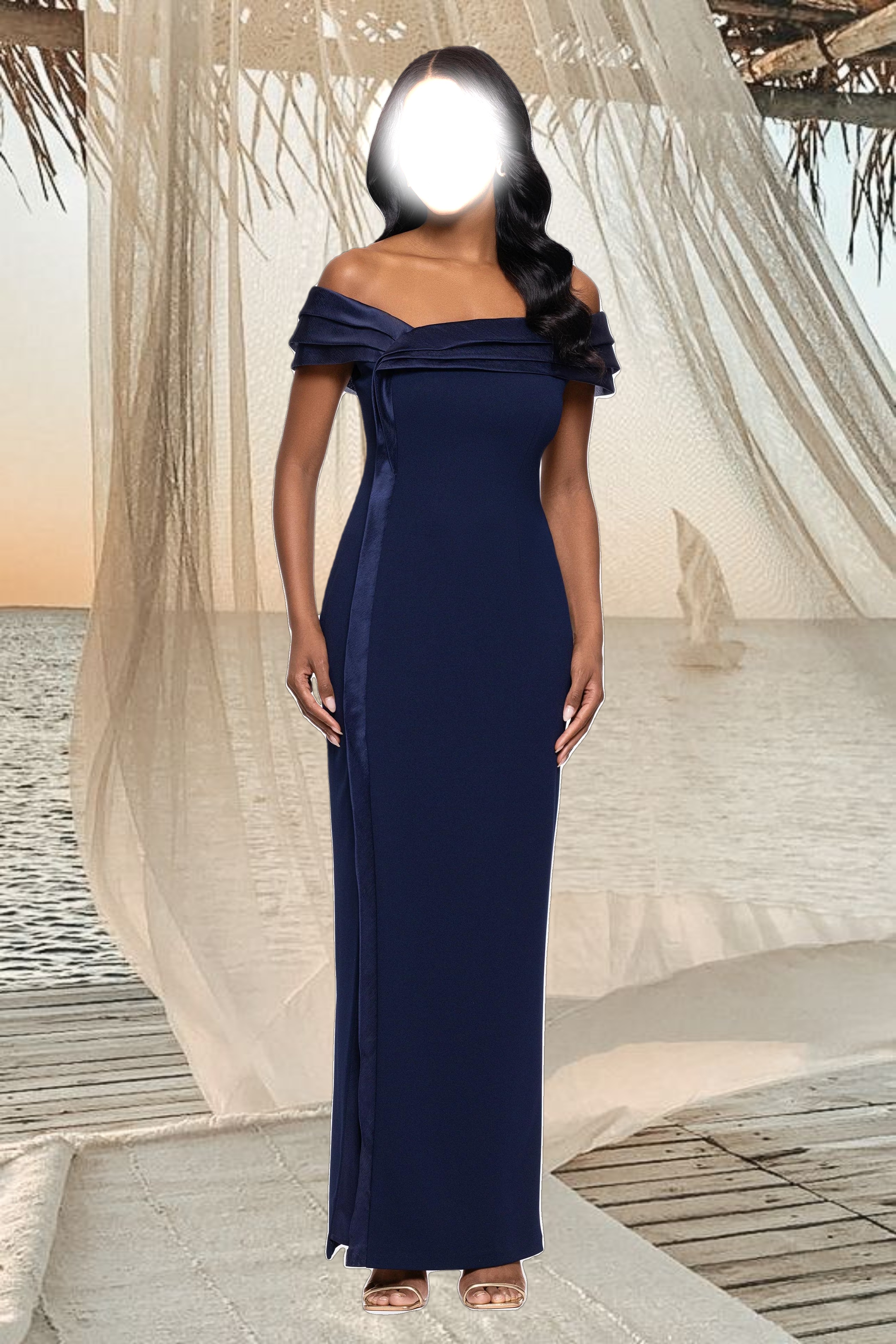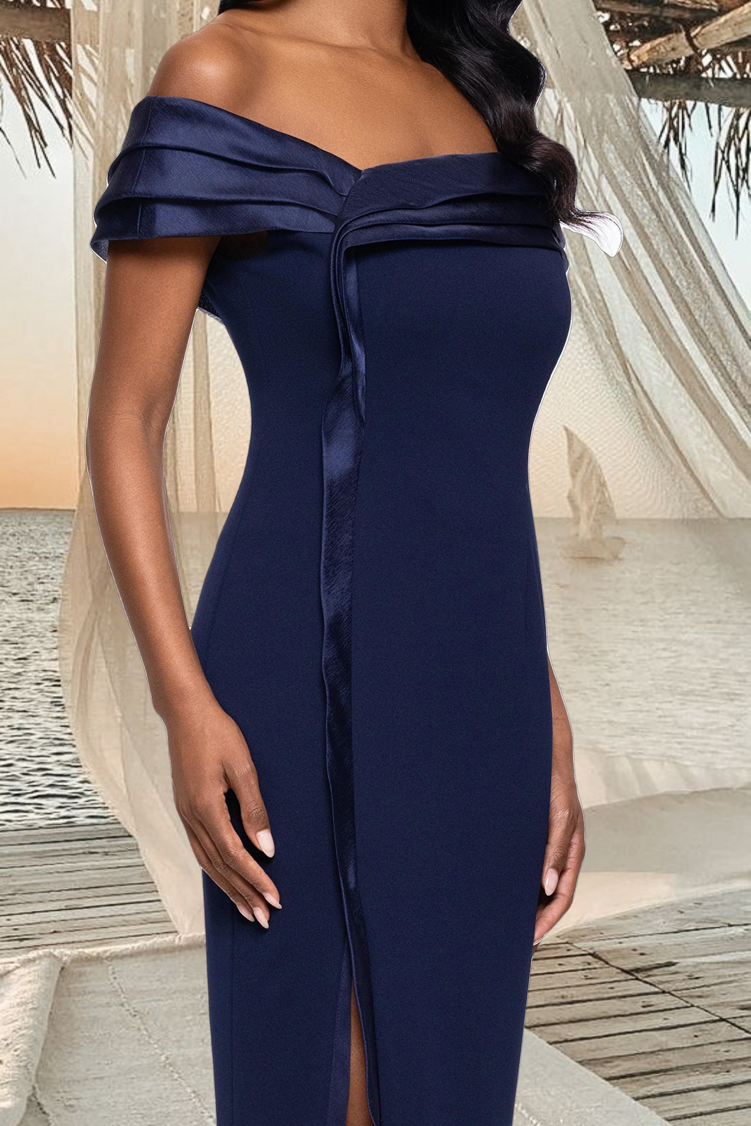 "Hazel" Scuba Crepe and Organza Off the Shoulder Dress