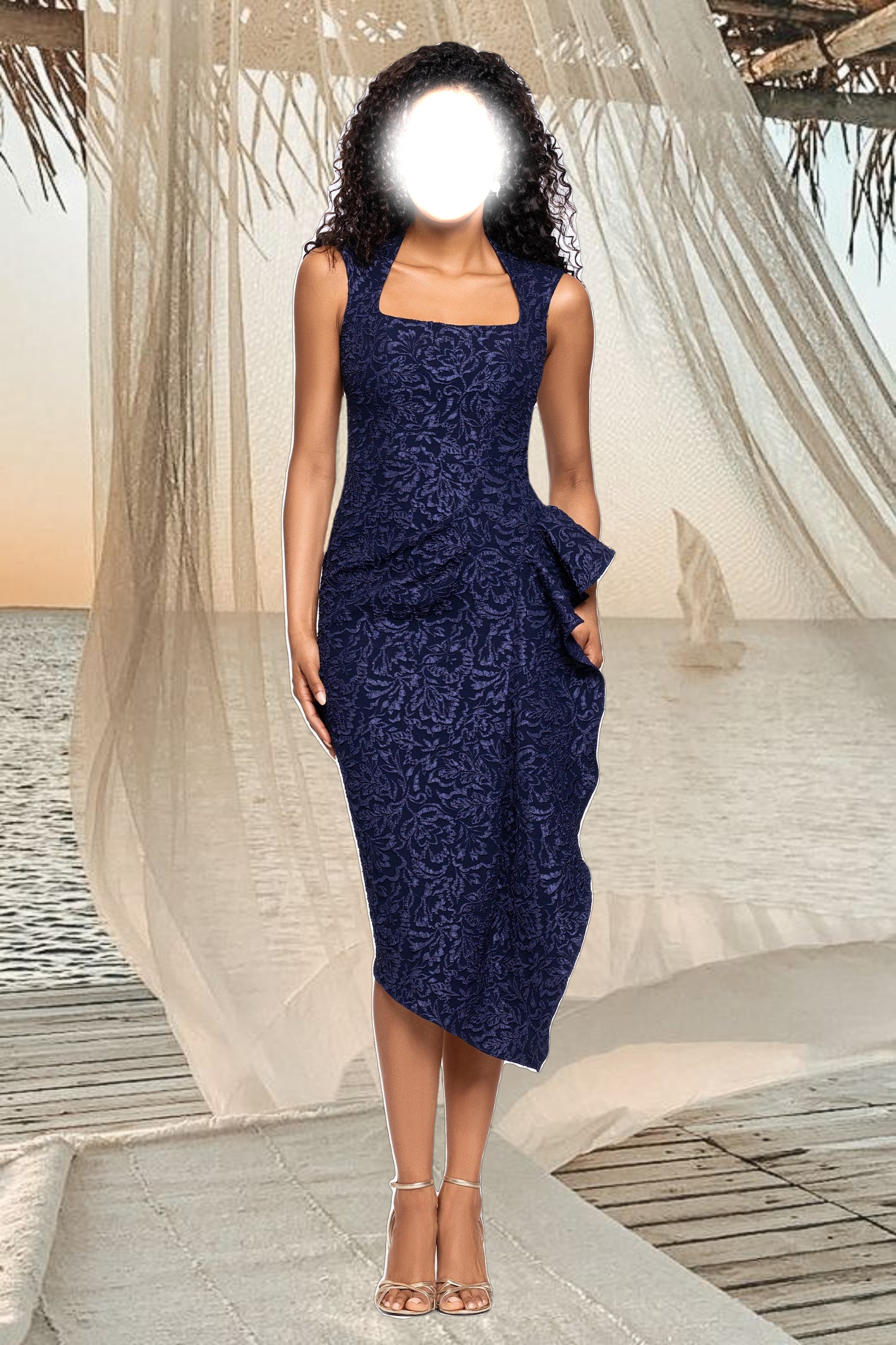 "Elise" Jacquard Knee Length Ruffle Square Neck Dress