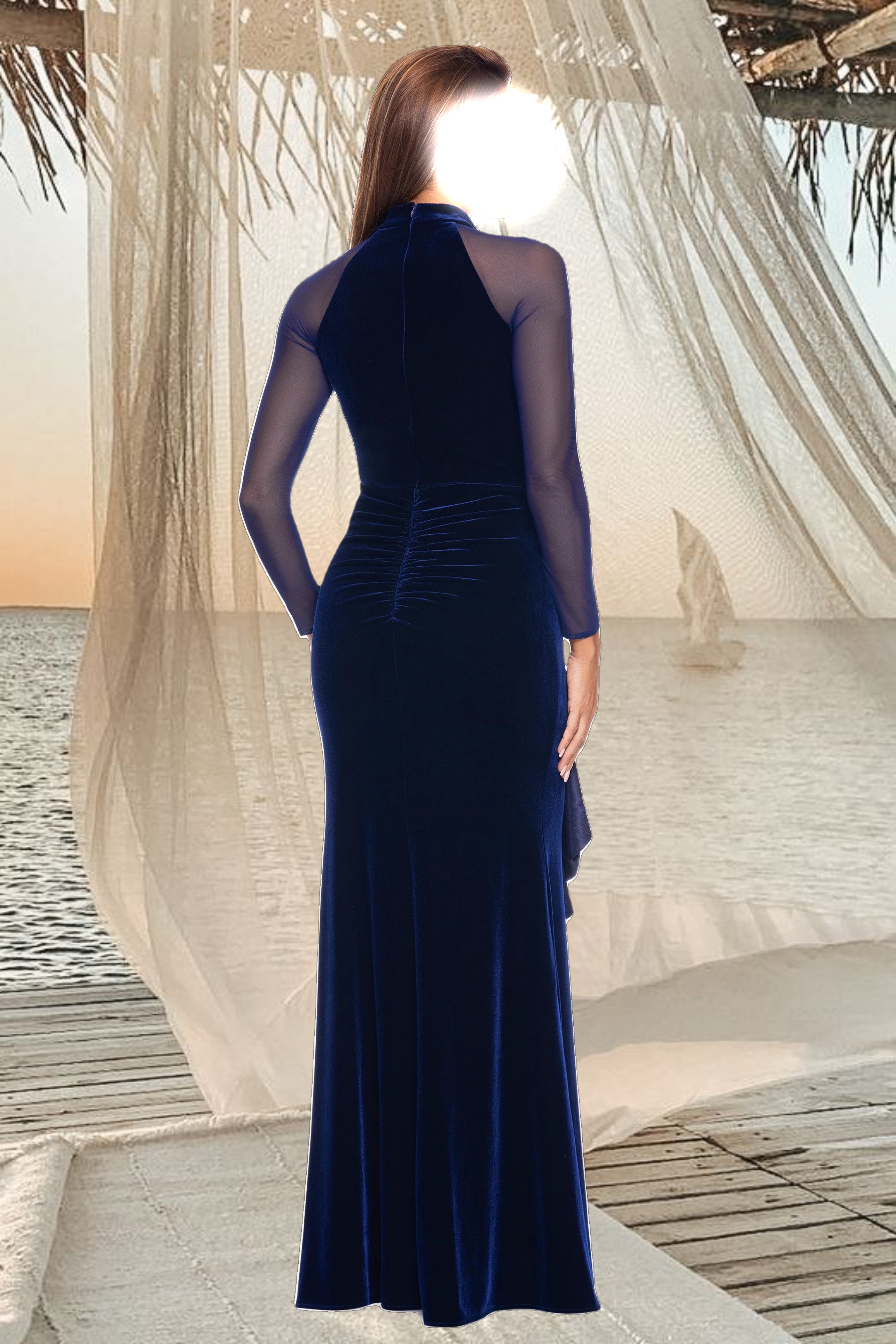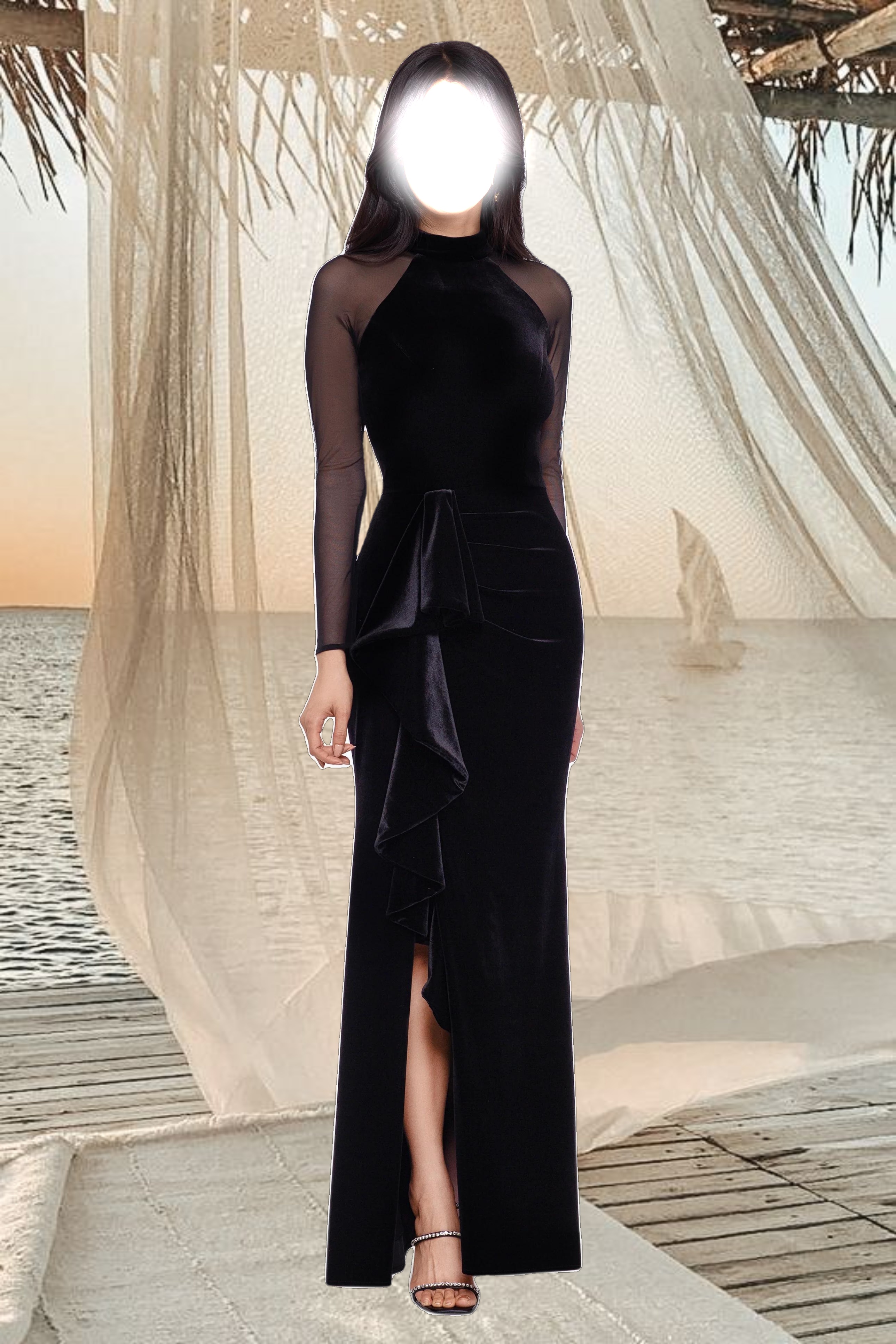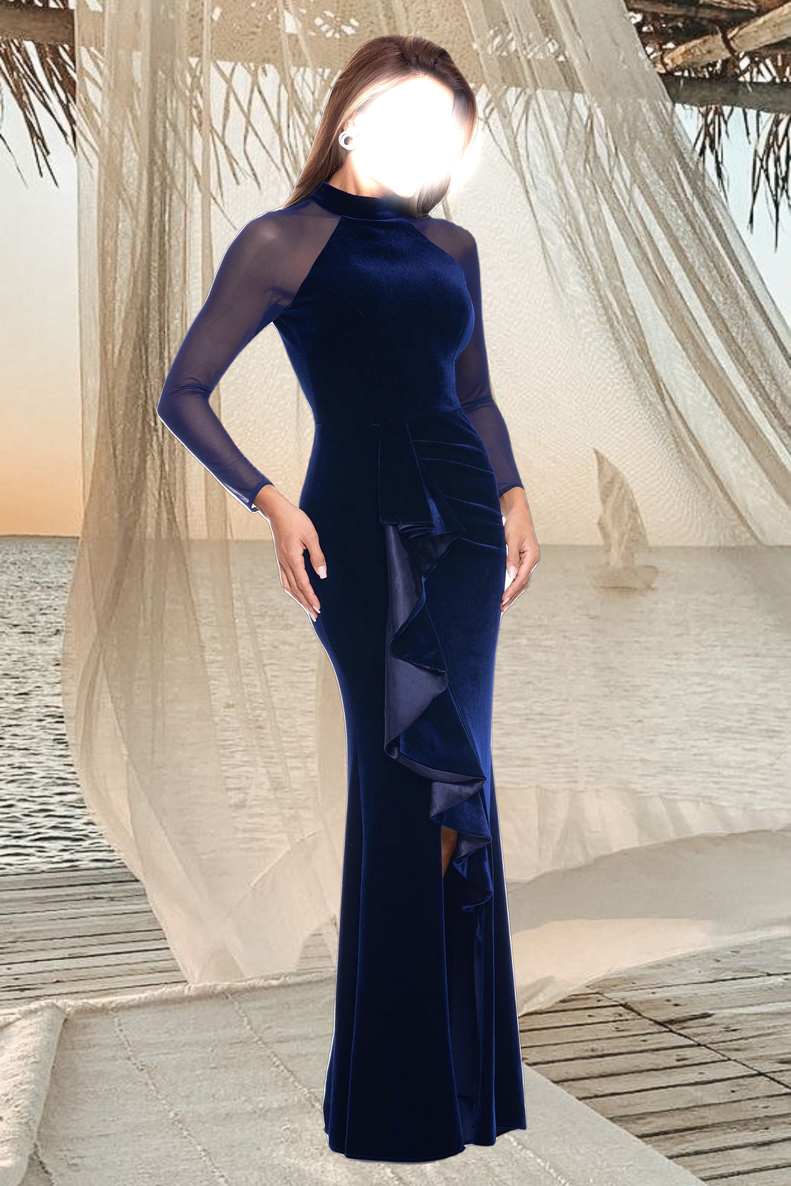 Step out for the evening in timeless elegance with the "Valentina" Long Velvet Mesh Illusion Sleeve Dress. Crafted from luxurious velvet, this exquisite dress is given a contemporary twist with its delicate mesh illusion sleeves. A subtle leg slit and ruffle add a hint of femininity, creating the perfect balance between classic sophistication and modern style. Make a bold yet refined statement with this timeless piece.