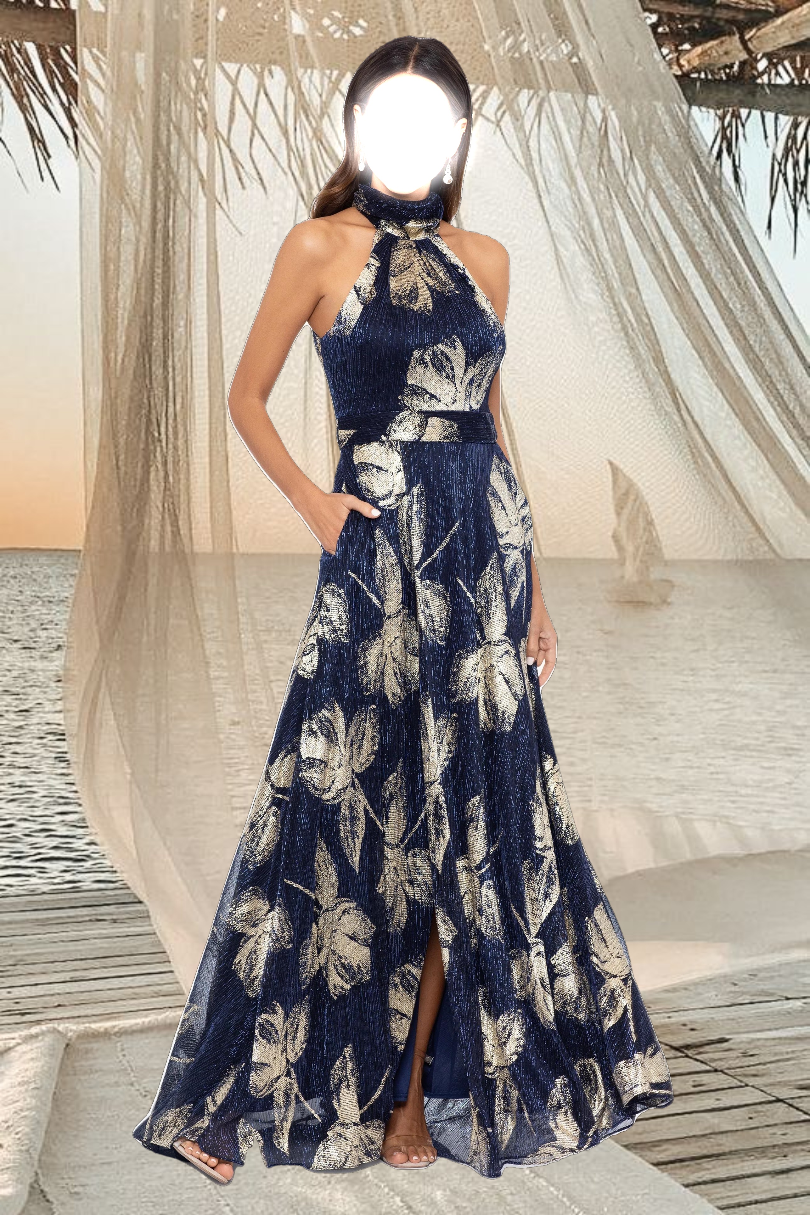 Home / Blue / "Dana" Long Mock Neck Foil Wrap Dress