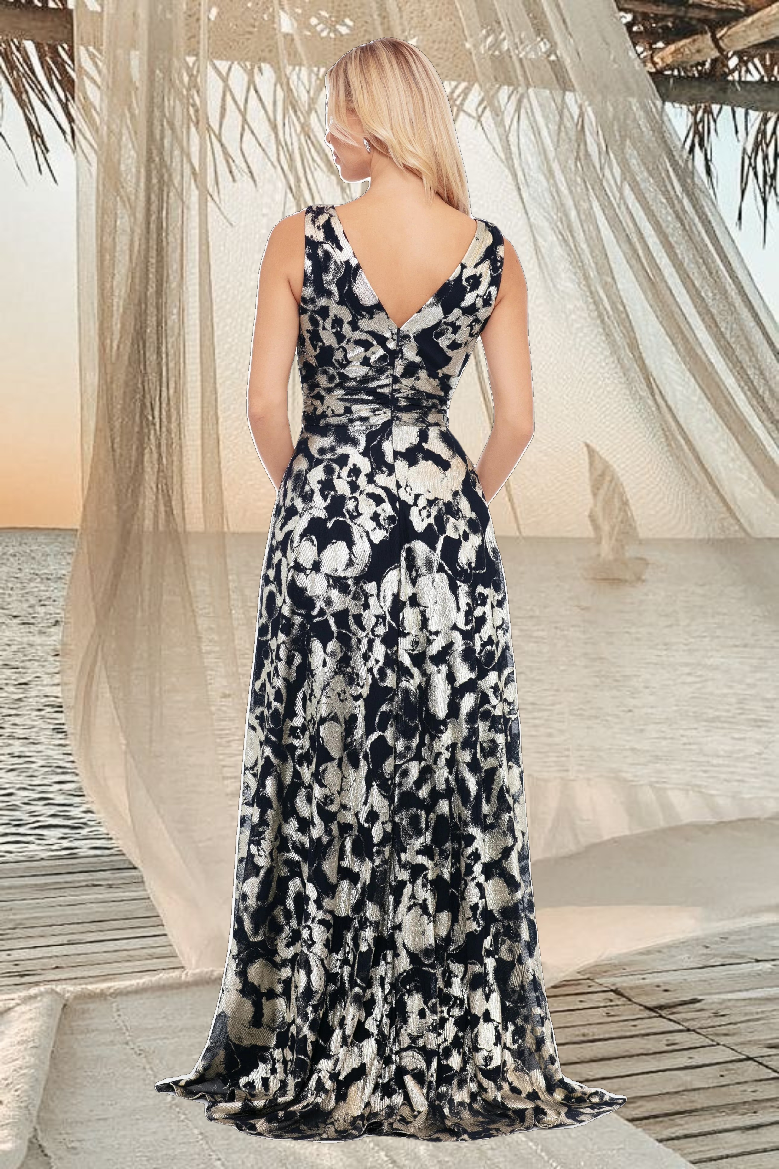 "Maria" Long Foil V-Neck Floor Length Dress