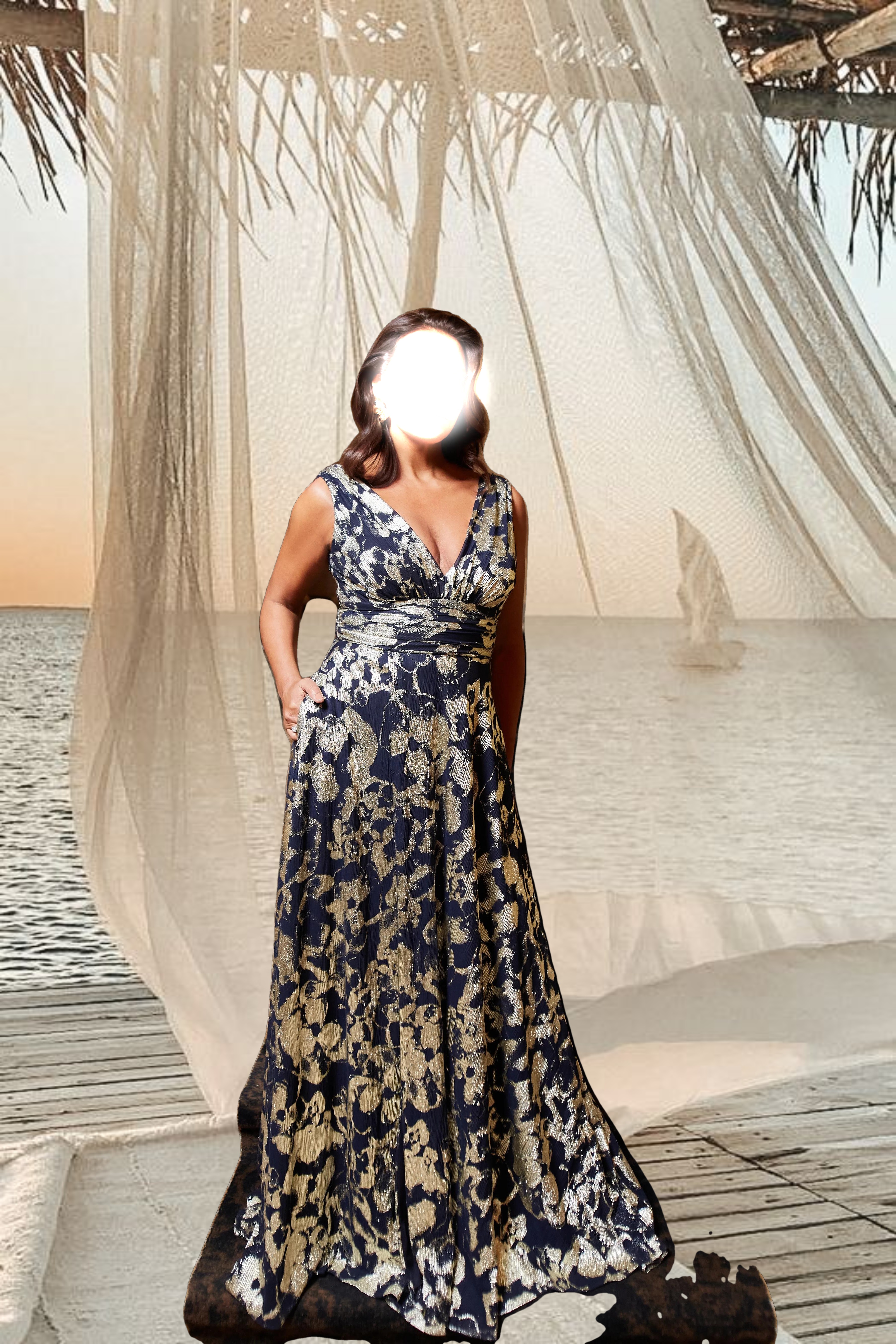 Discover elegance in the timeless "Maria" Long Foil V-Neck Floor Length Dress. This stunning gown features a graceful foil pattern, enhancing its allure. With a flattering V-neckline and a flowing floor-length silhouette, the "Maria" dress is perfect for formal occasions, weddings, or any special event. Immerse yourself in sophistication and style with this exquisite dress, designed to make a lasting impression.