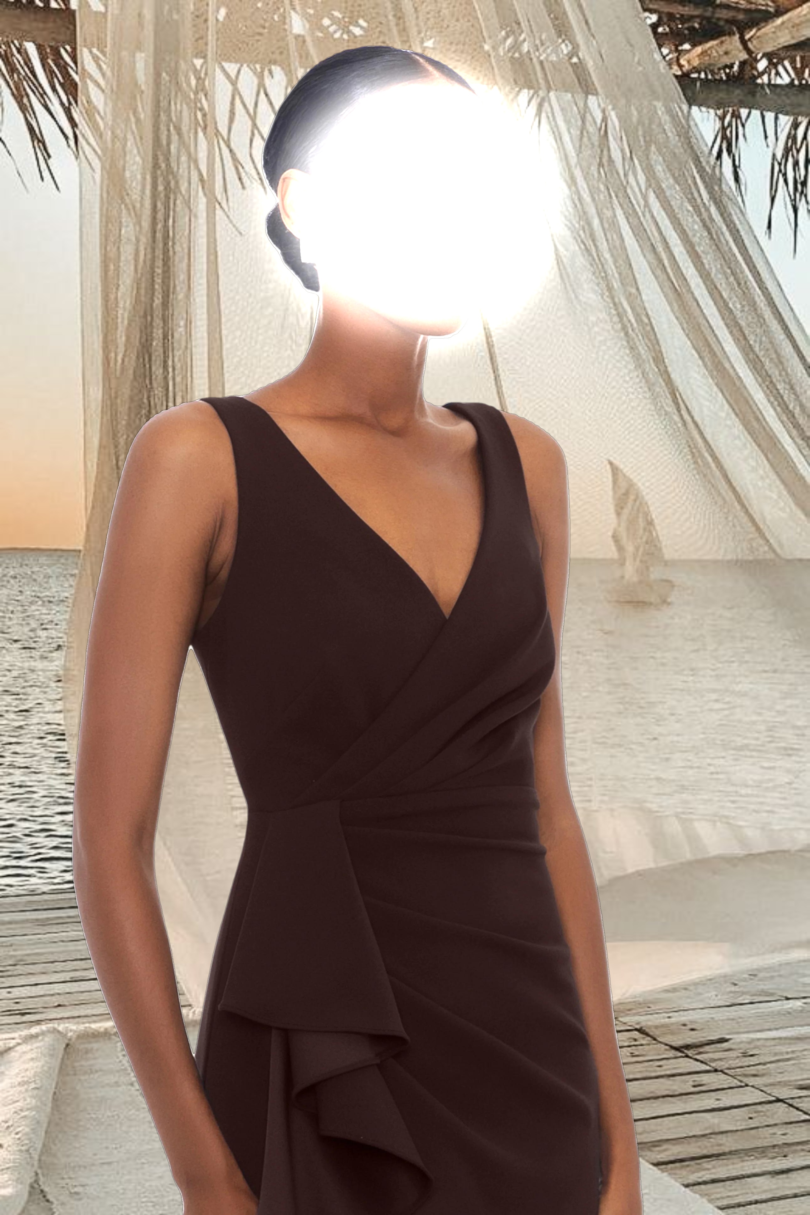 • Details: V-Neck, Rouched Side, Ruffles, High Low, Cascade Skirt
