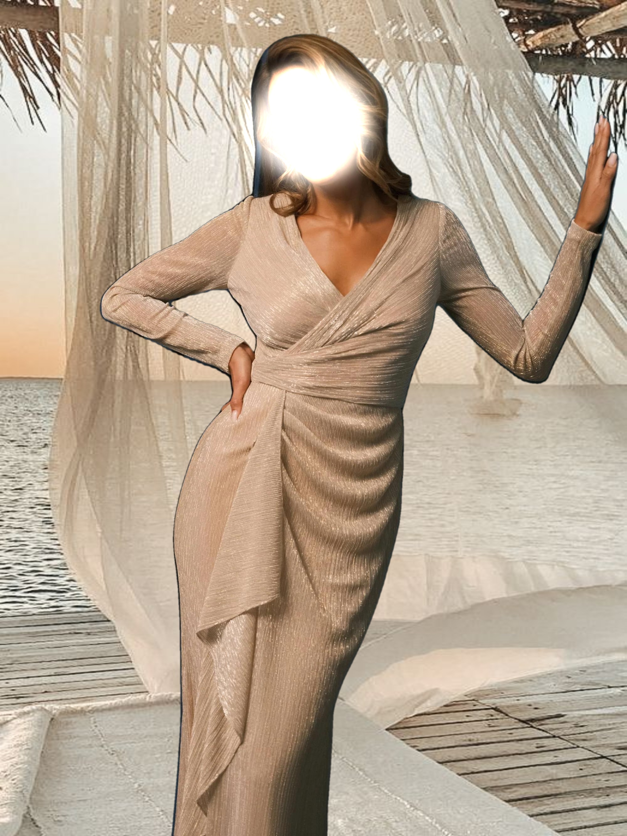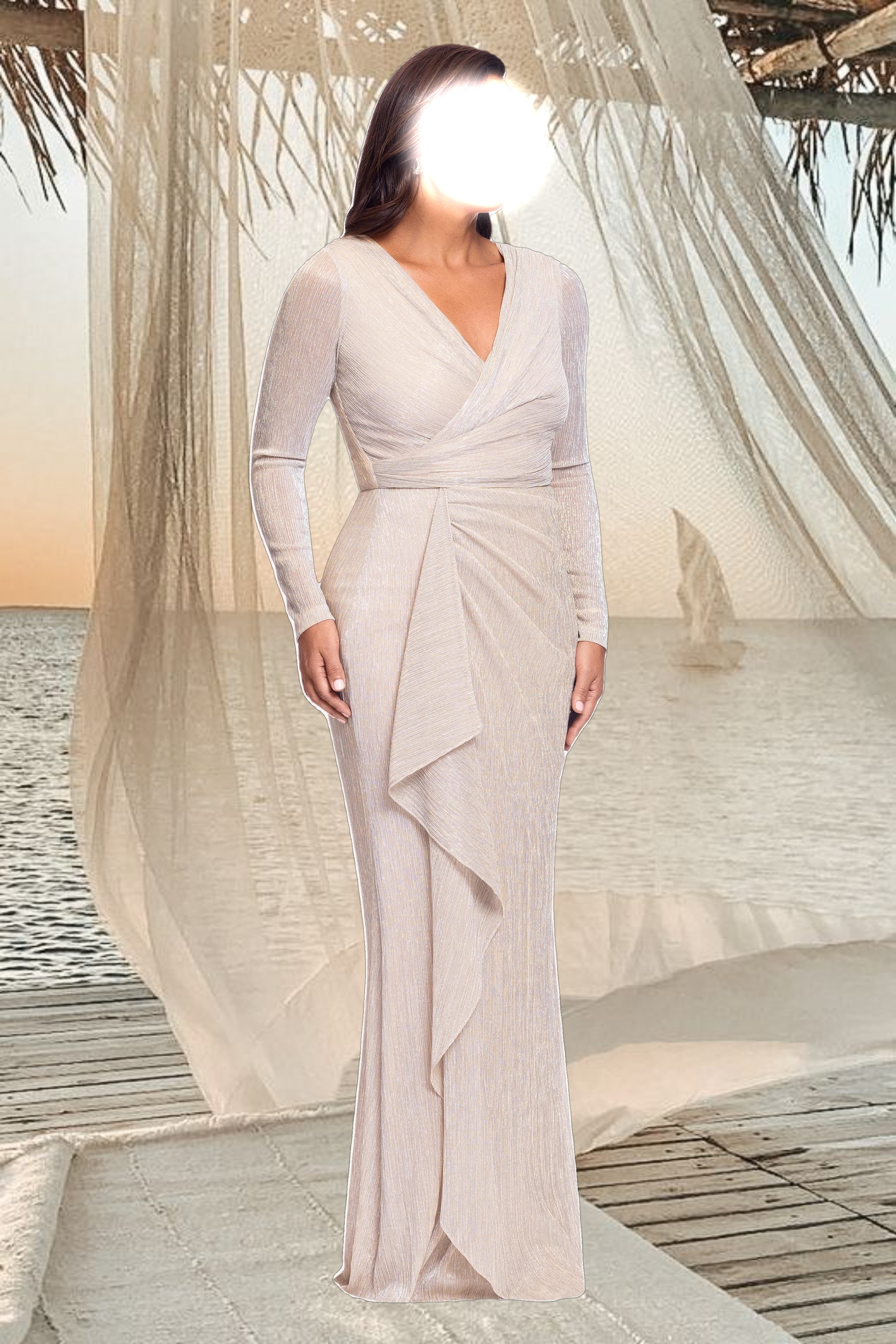 "Maggie" Long Pleated Metallic V-Neck Dress