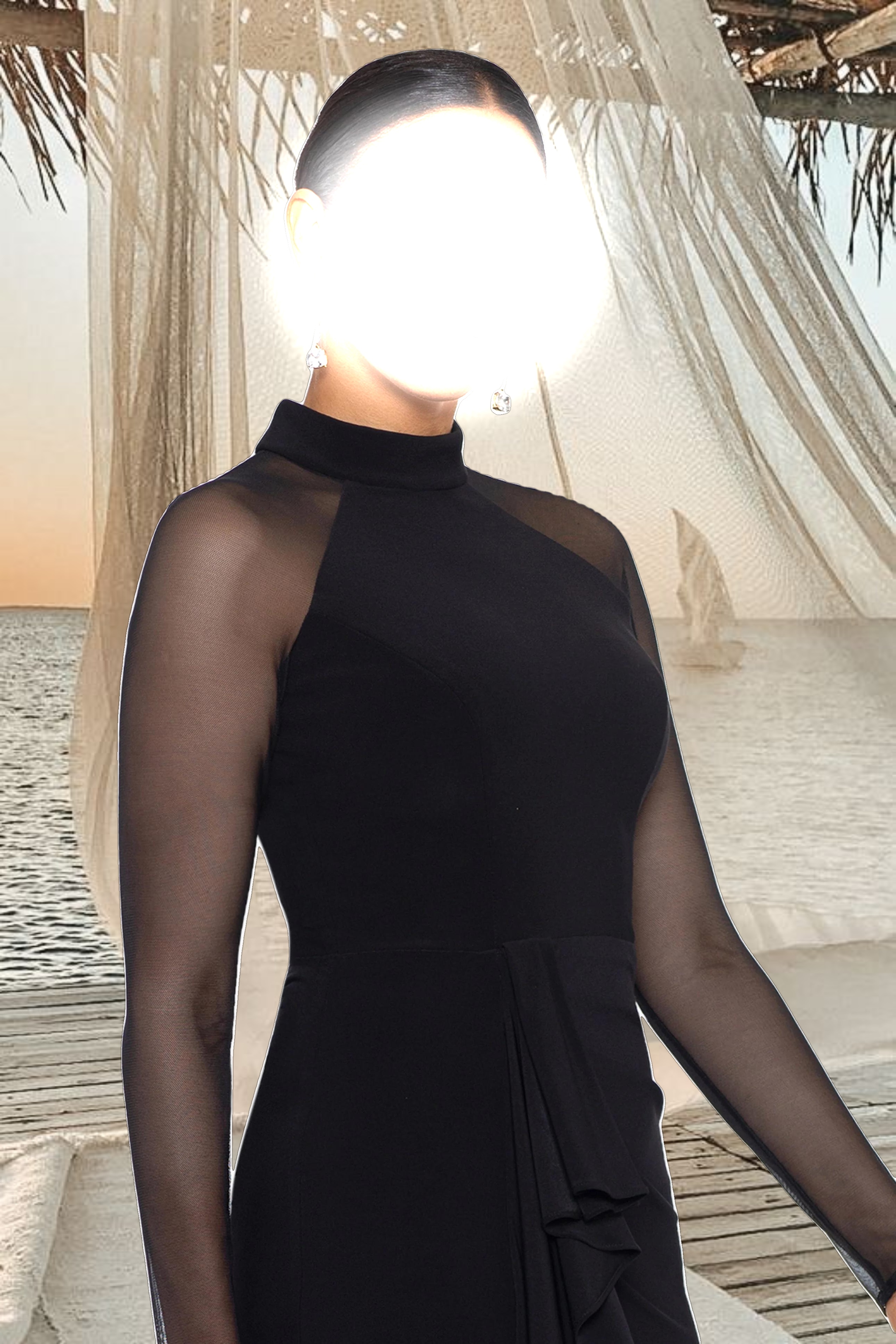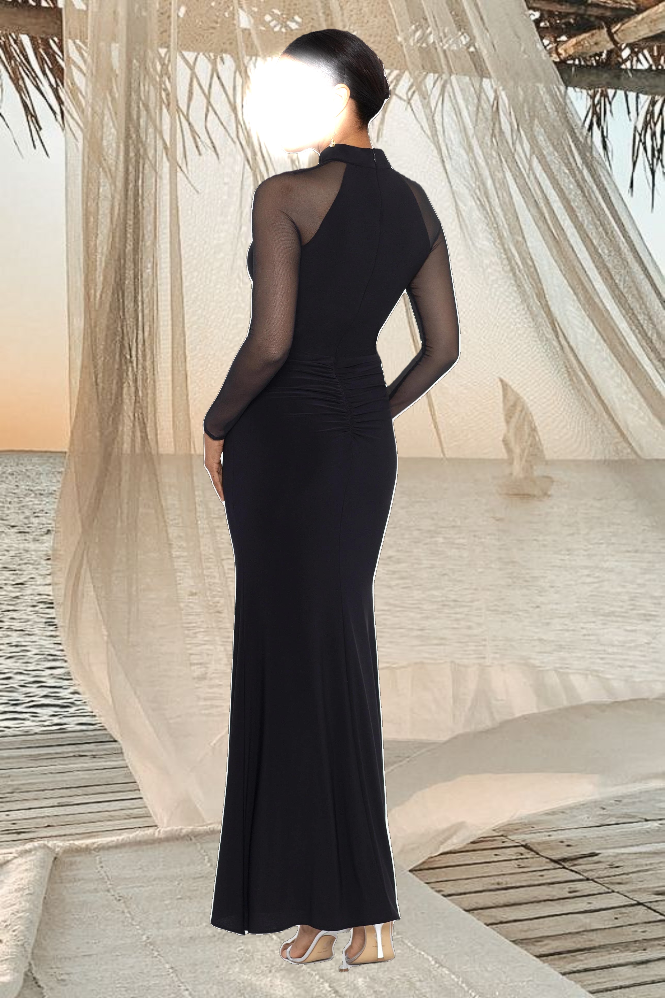 Look great and feel confident in the stunning "Natalie" long mock neck dress. Crafted with delicate mesh sleeves and elegant ruffle detailing, this black dress will turn heads wherever you go. A subtle slit is featured in the front, adding a hint of drama that will make you the center of attention. Enjoy timeless style and perfect fit with this special piece.