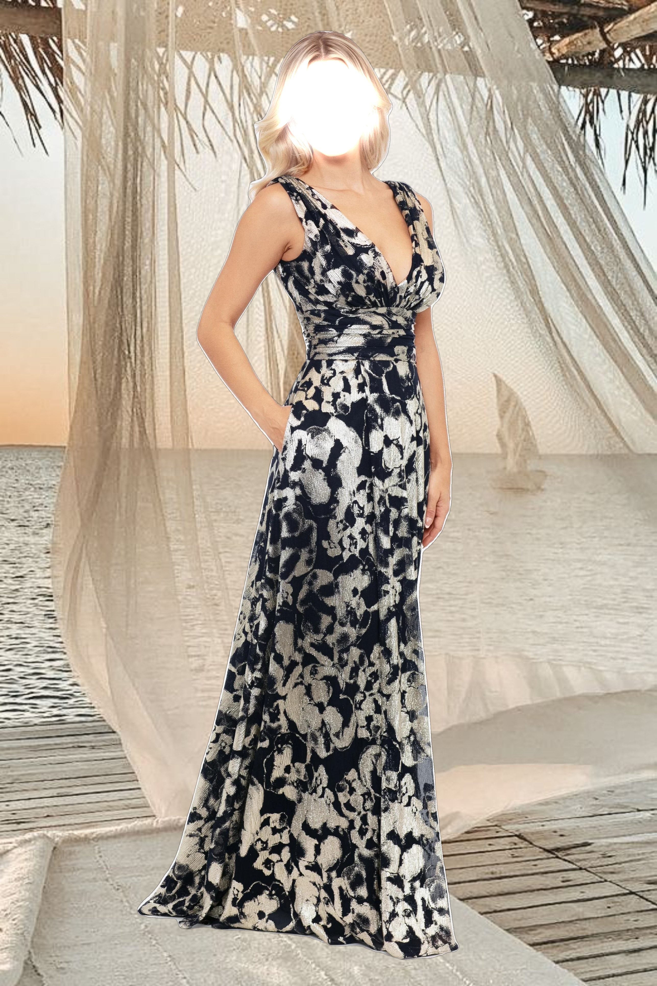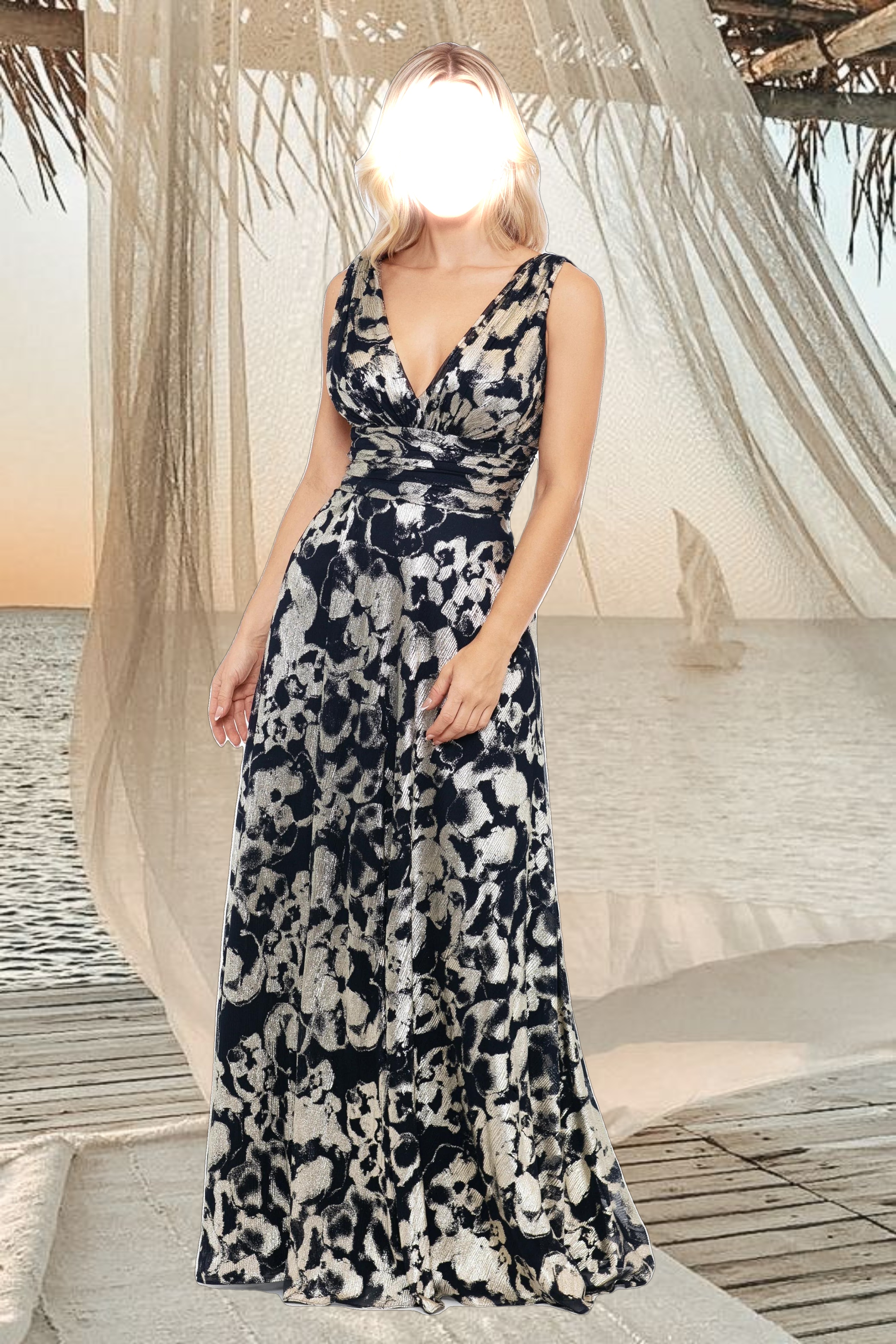 "Maria" Long Foil V-Neck Floor Length Dress