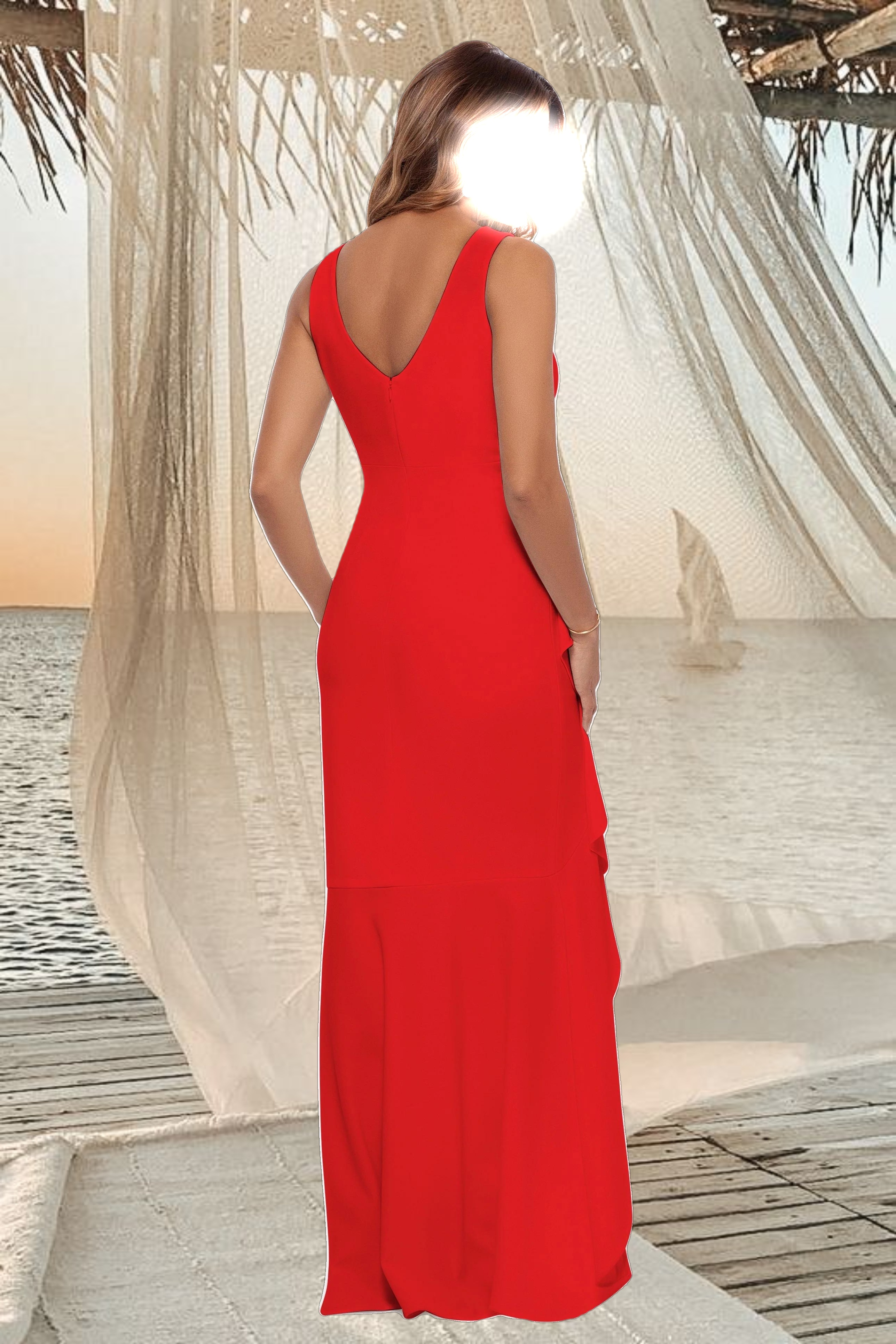 "Candace" Long V- Neck Hi Low Cascade Dress