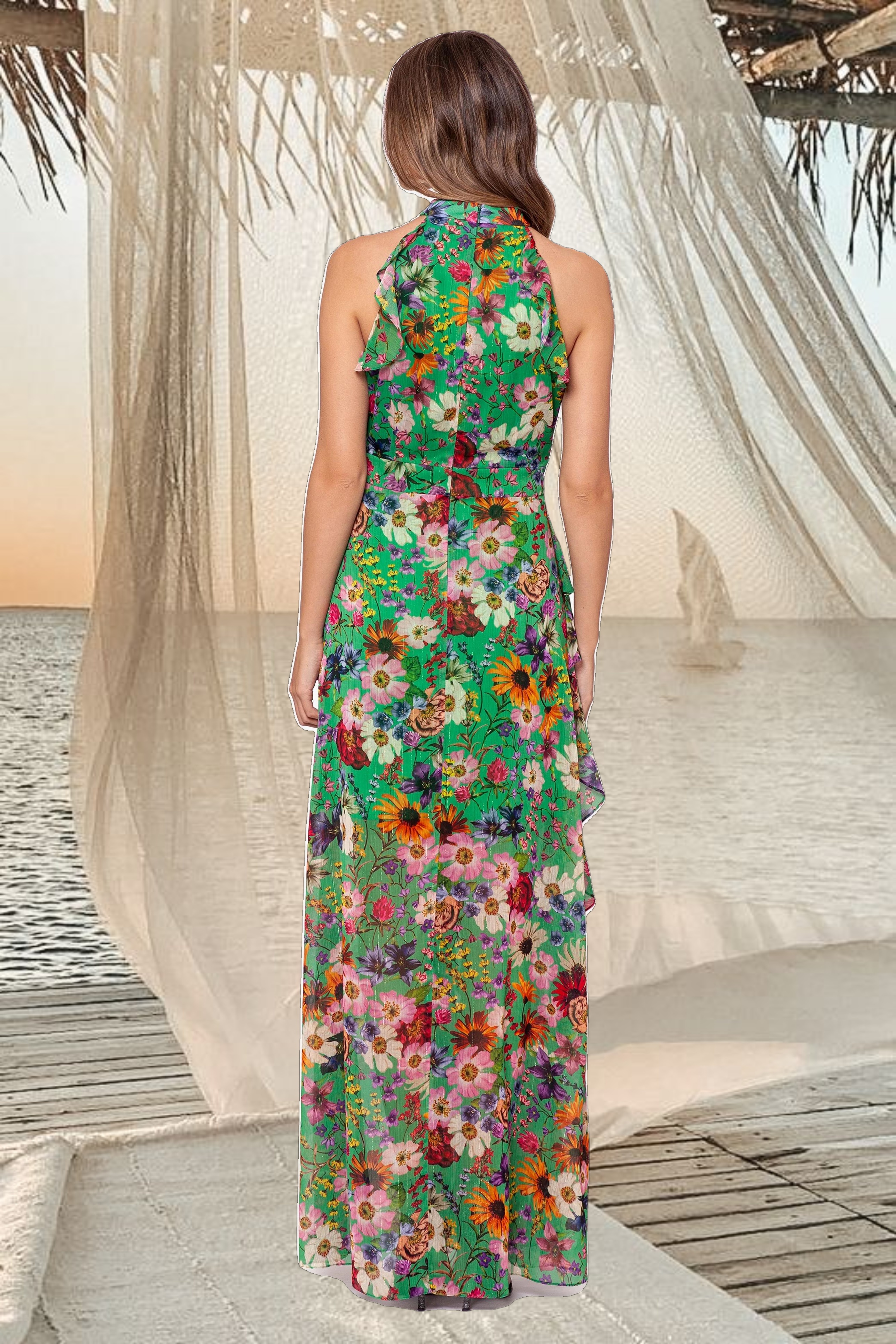 "Cameron" Long Chiffon Print Halter Flutter Dress