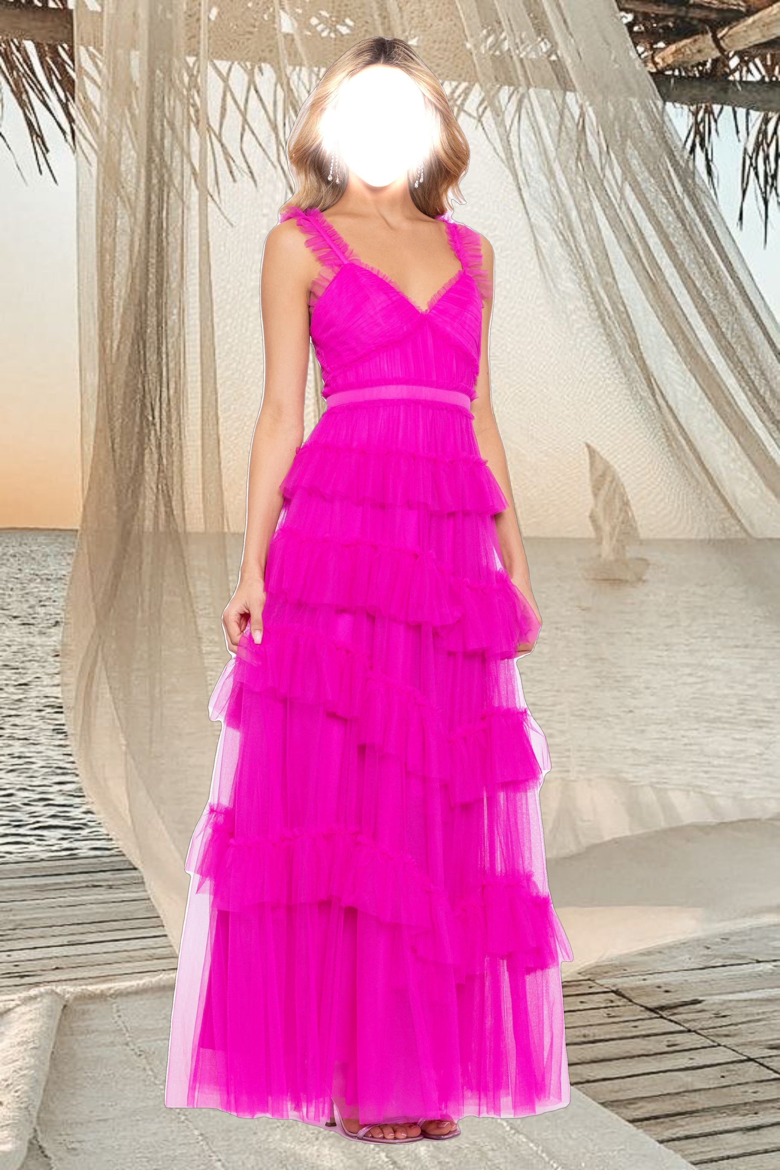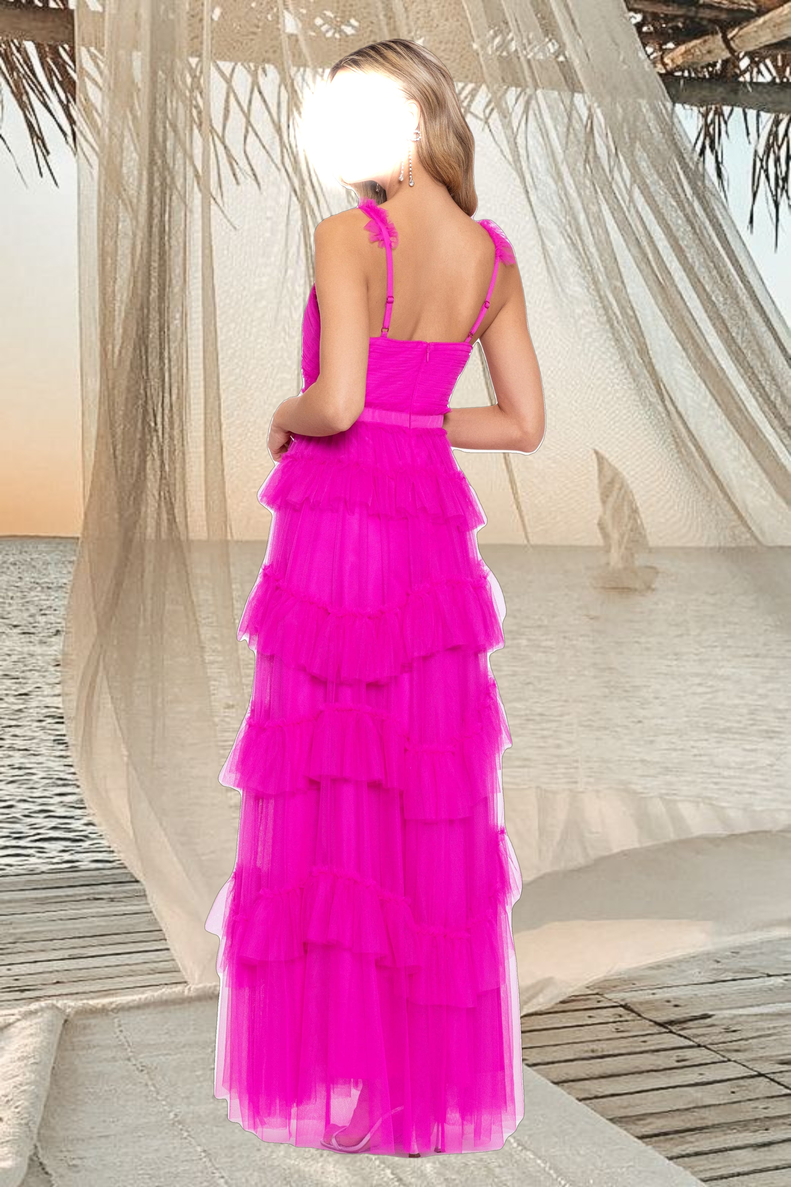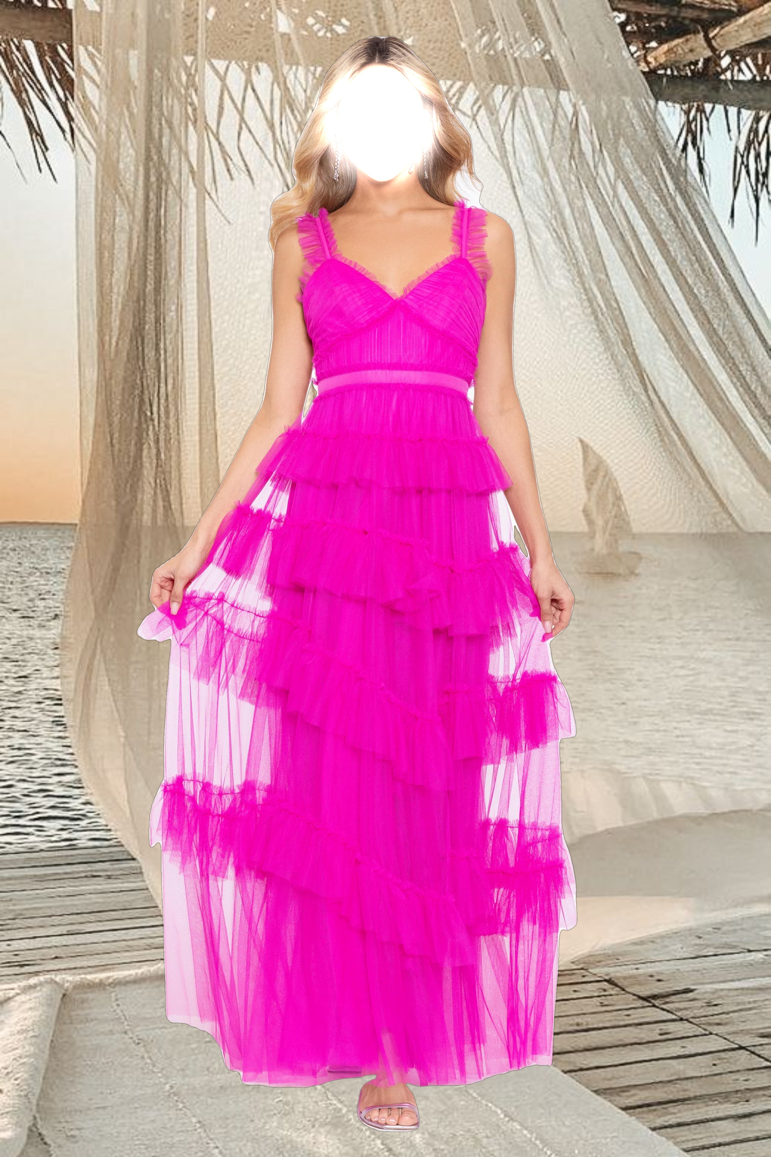 "Gigi" Long Ruffle Mesh Dress: The perfect blend of flirty and chic! Made of lightweight mesh with fully lined interior, this dress features a hidden zipper for a seamless look. The V-neckline and ruffle straps add a playful touch, while the satin belt accentuates your waist. Complete with a tiered ruffle skirt for added charm.