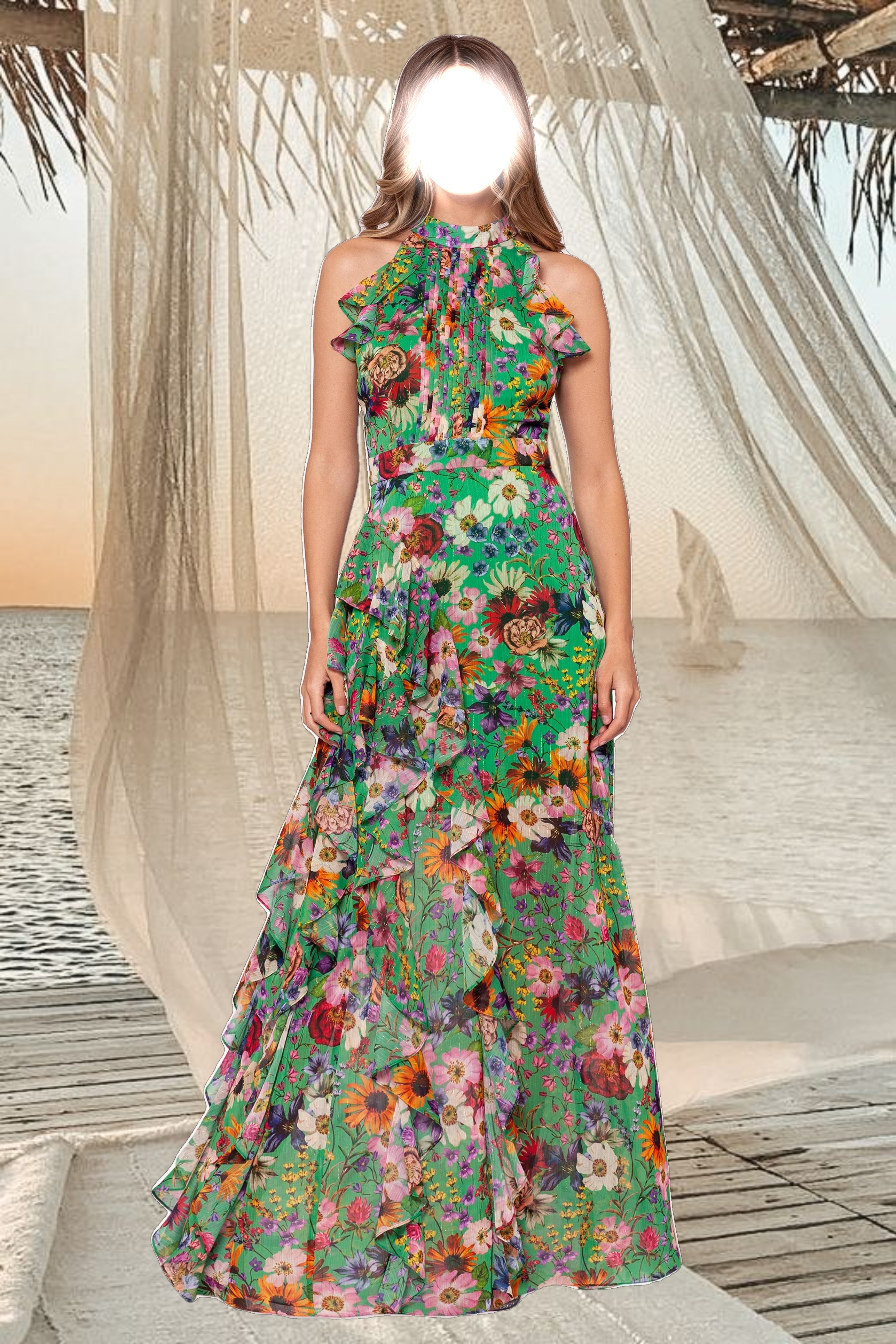 "Cameron" Long Chiffon Print Halter Flutter Dress