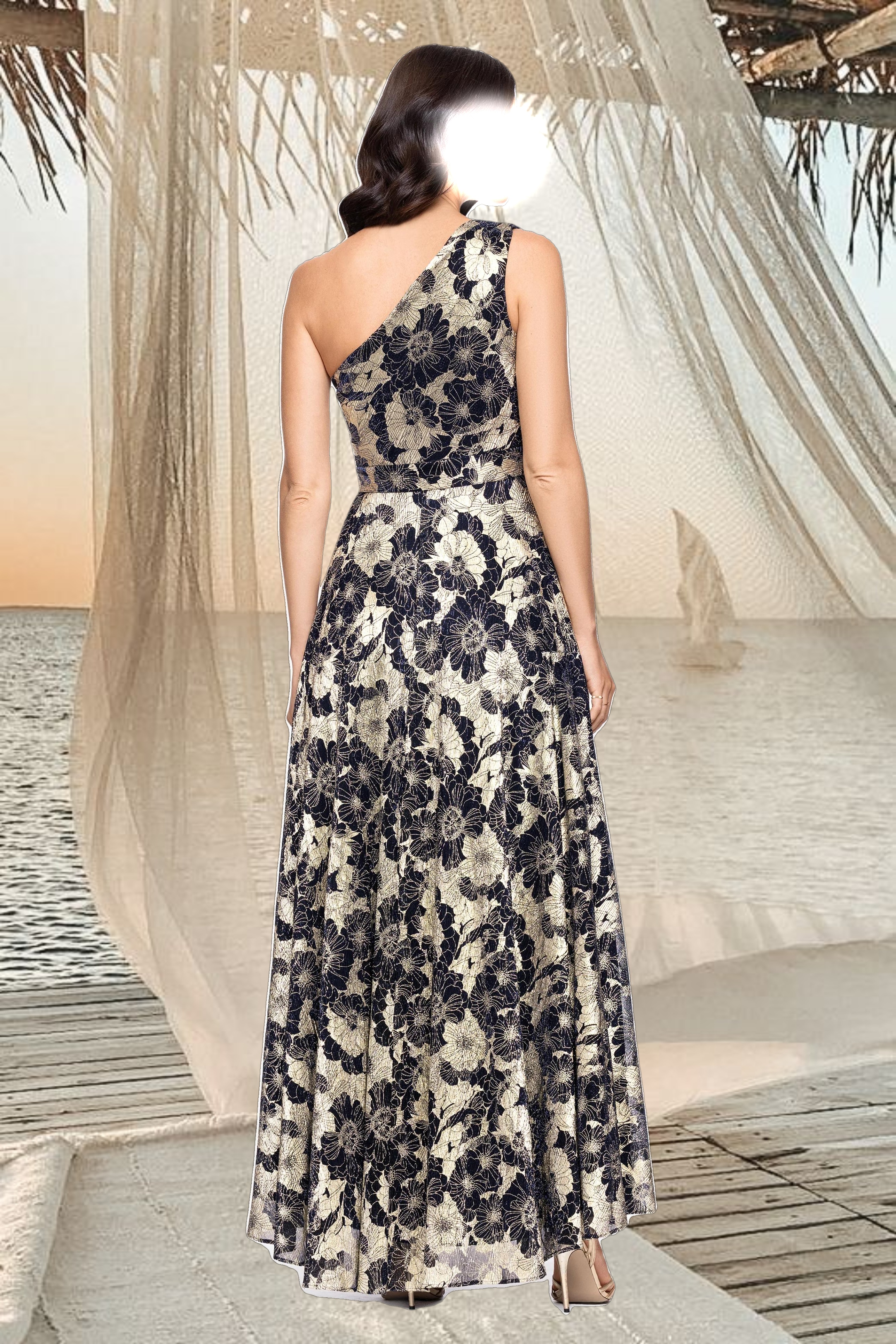 "Gwen" Long One Shoulder Wrap Foil Flower Dress