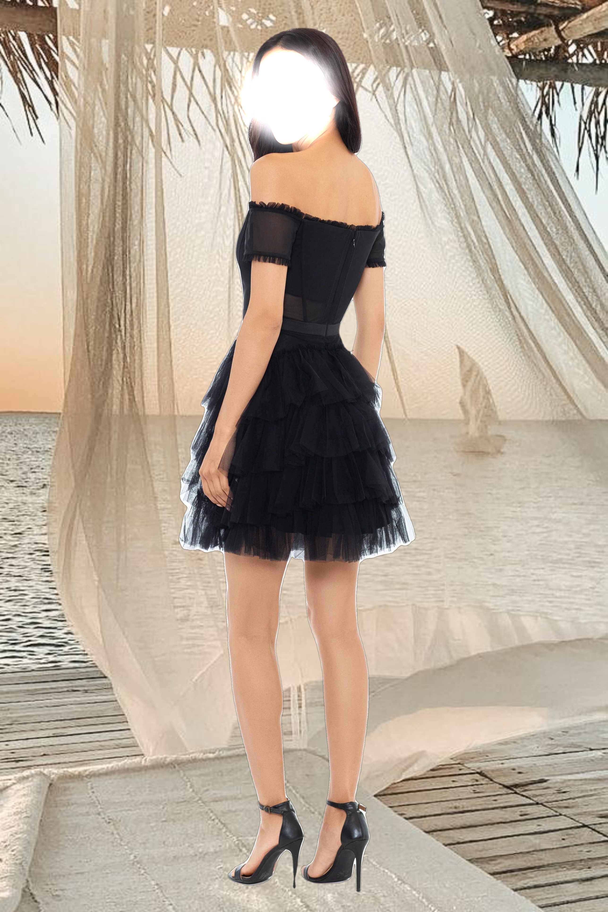 - Details: Structured Corset Bodice, Mesh Corset, Tiered Short Skirt, Off the Shoulder