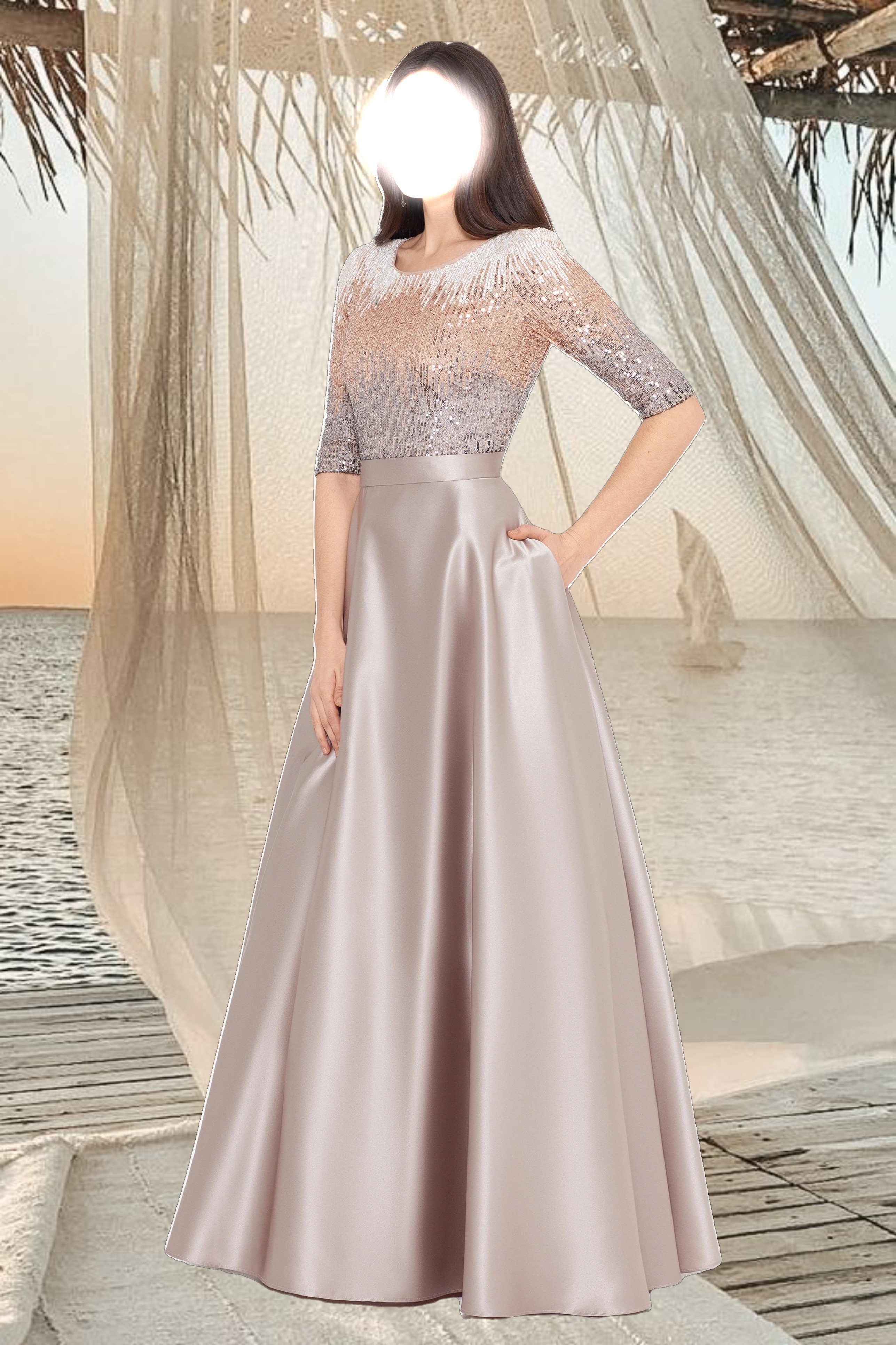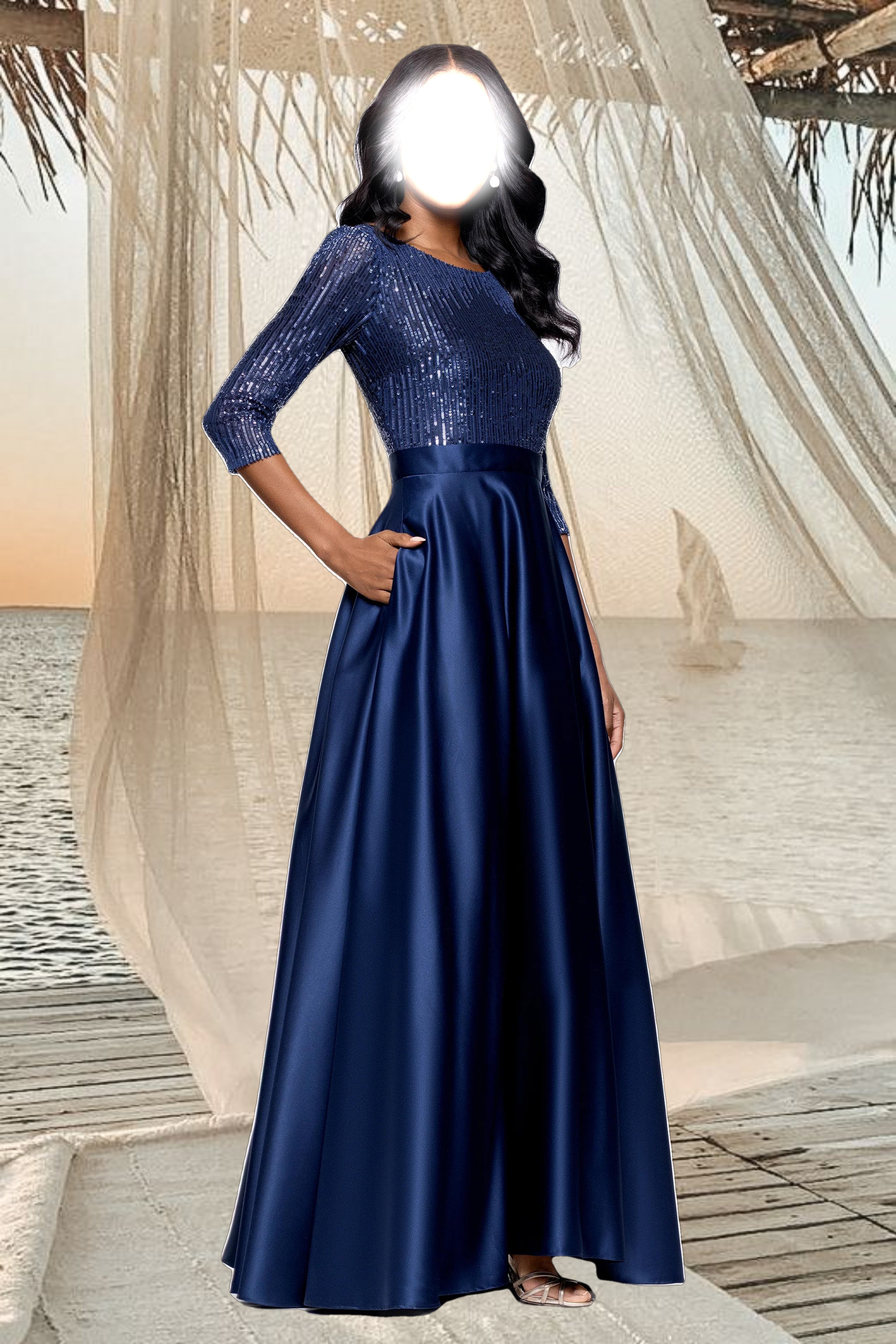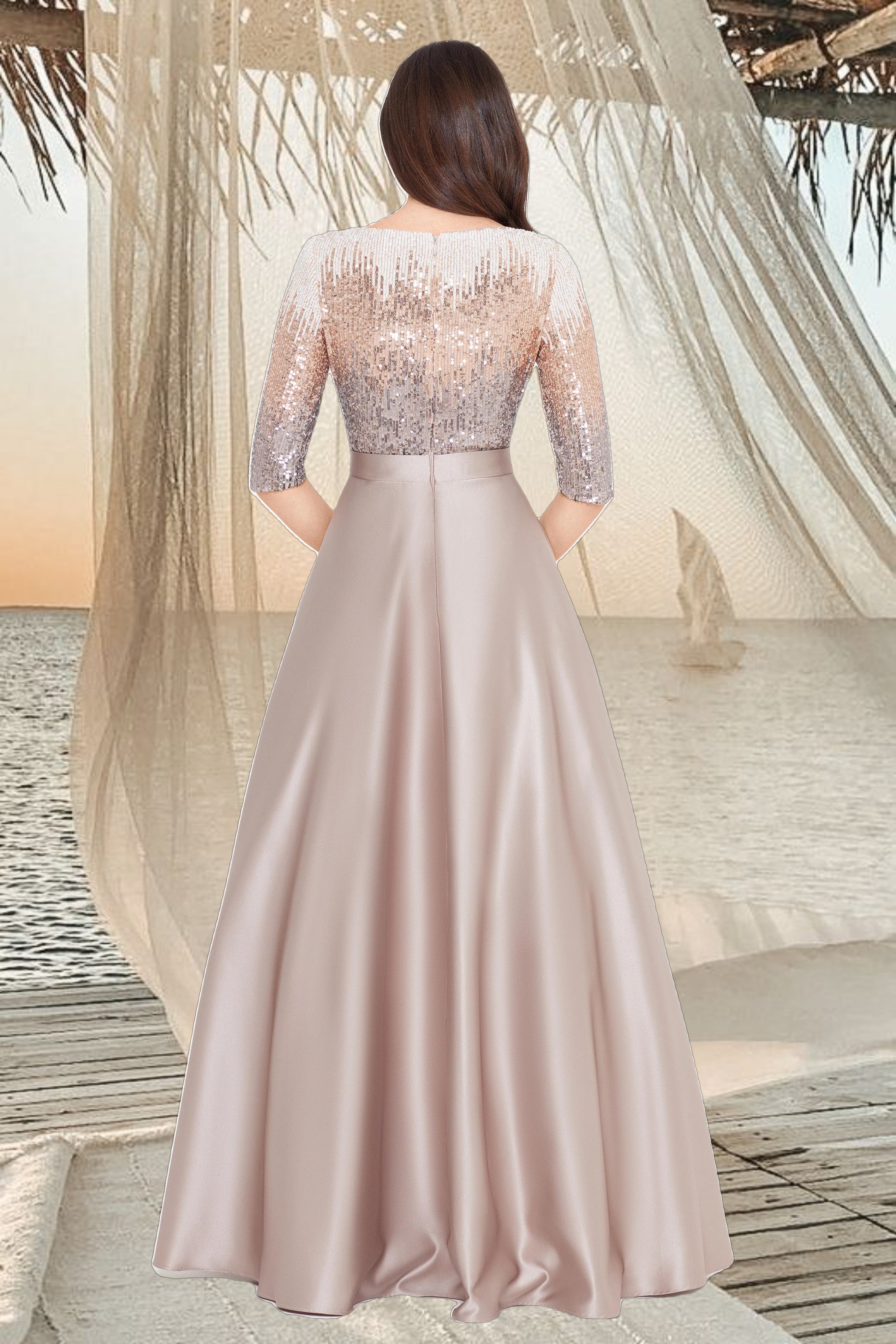 • Details: Boat Neckline, 3/4 sleeves, Embellished at Bodice and Sleeves, Two Pockets at Hips