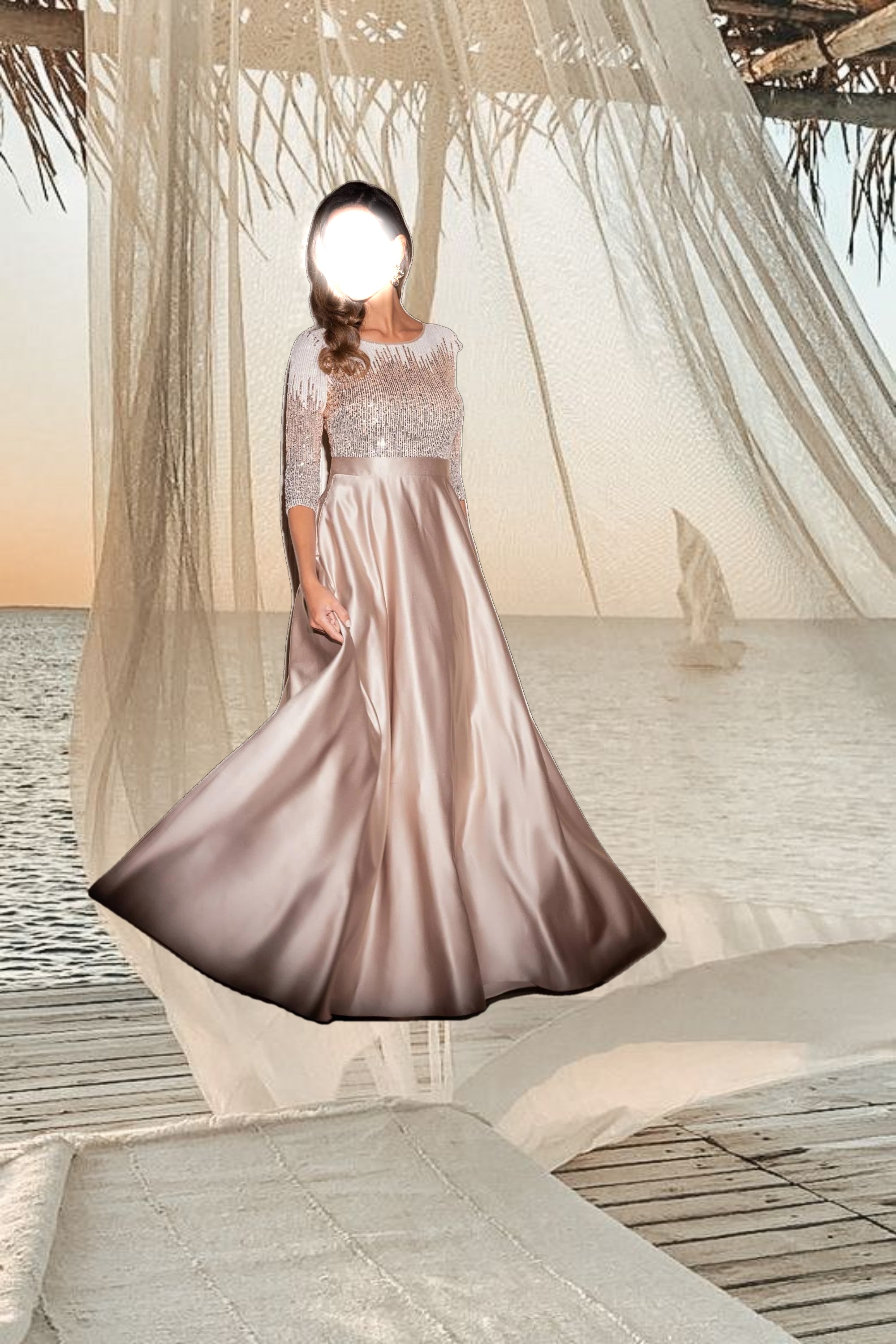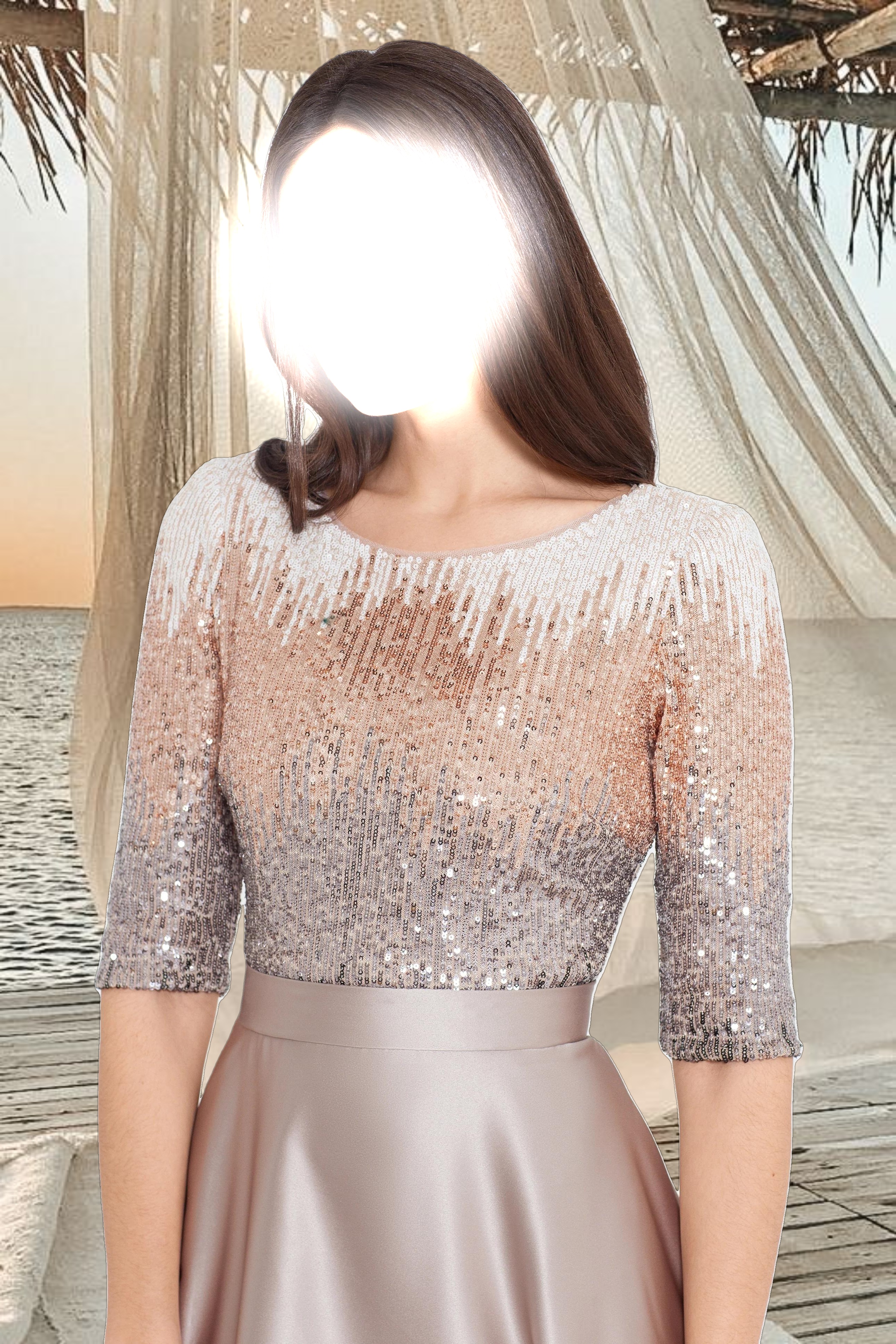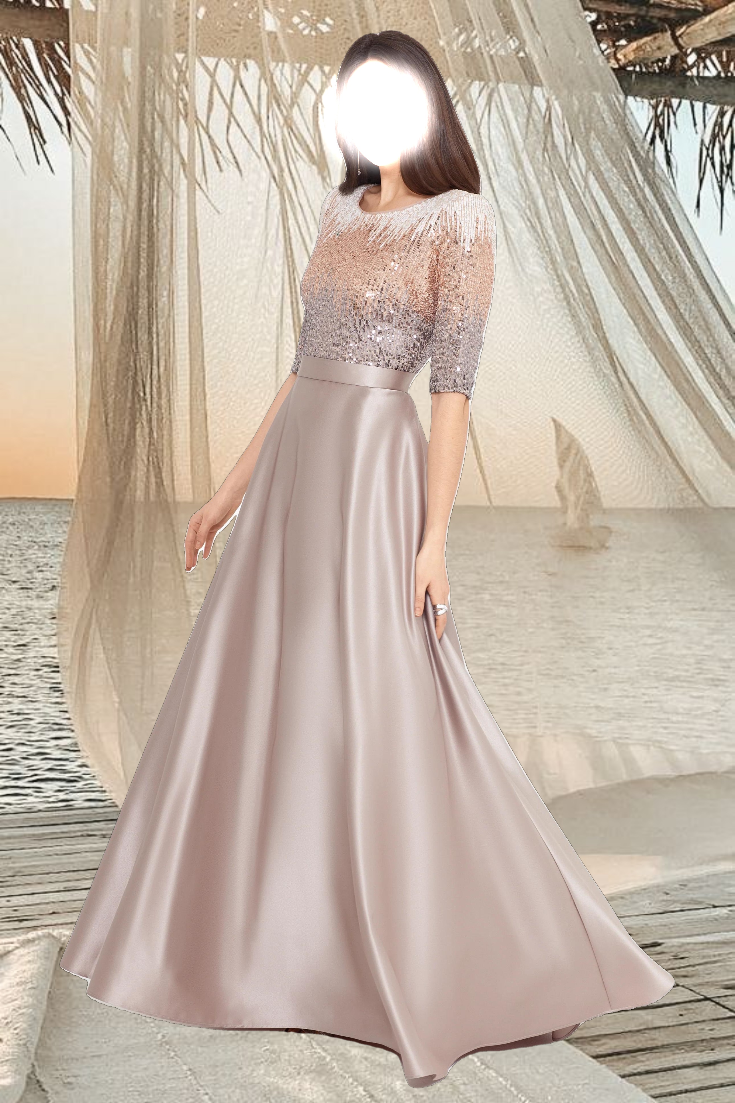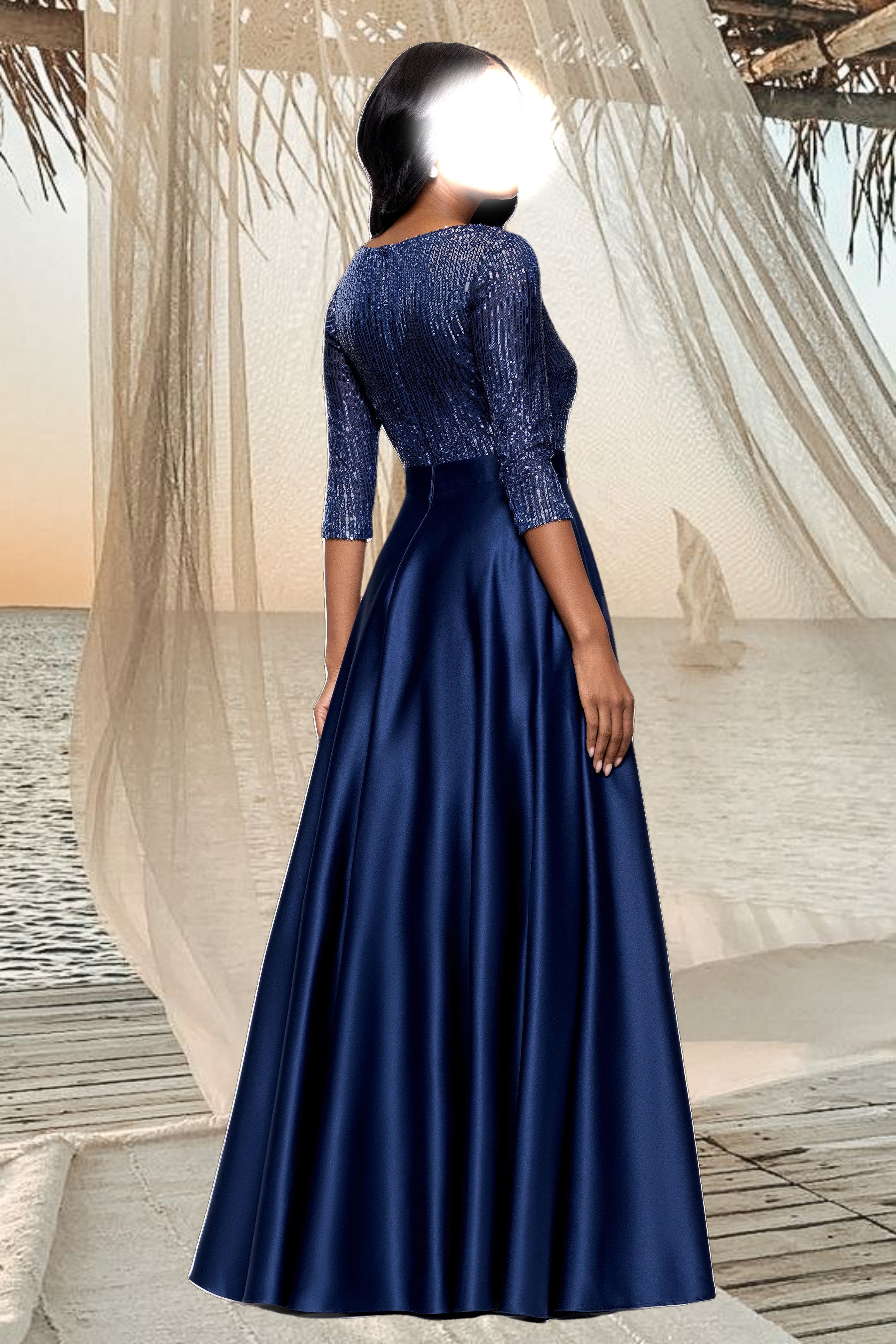 • Details: Boat Neckline, 3/4 sleeves, Embellished at Bodice and Sleeves, Two Pockets at Hips