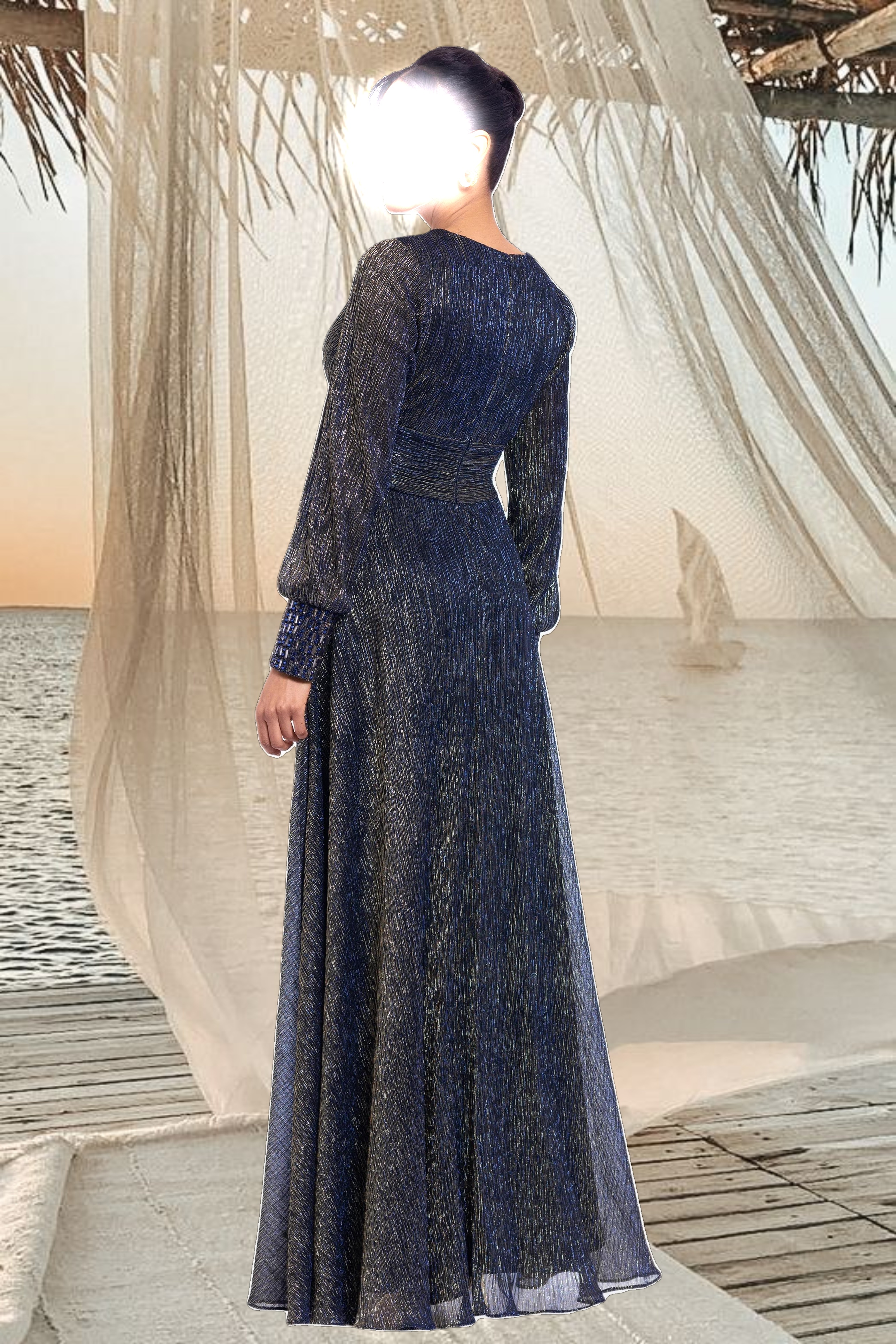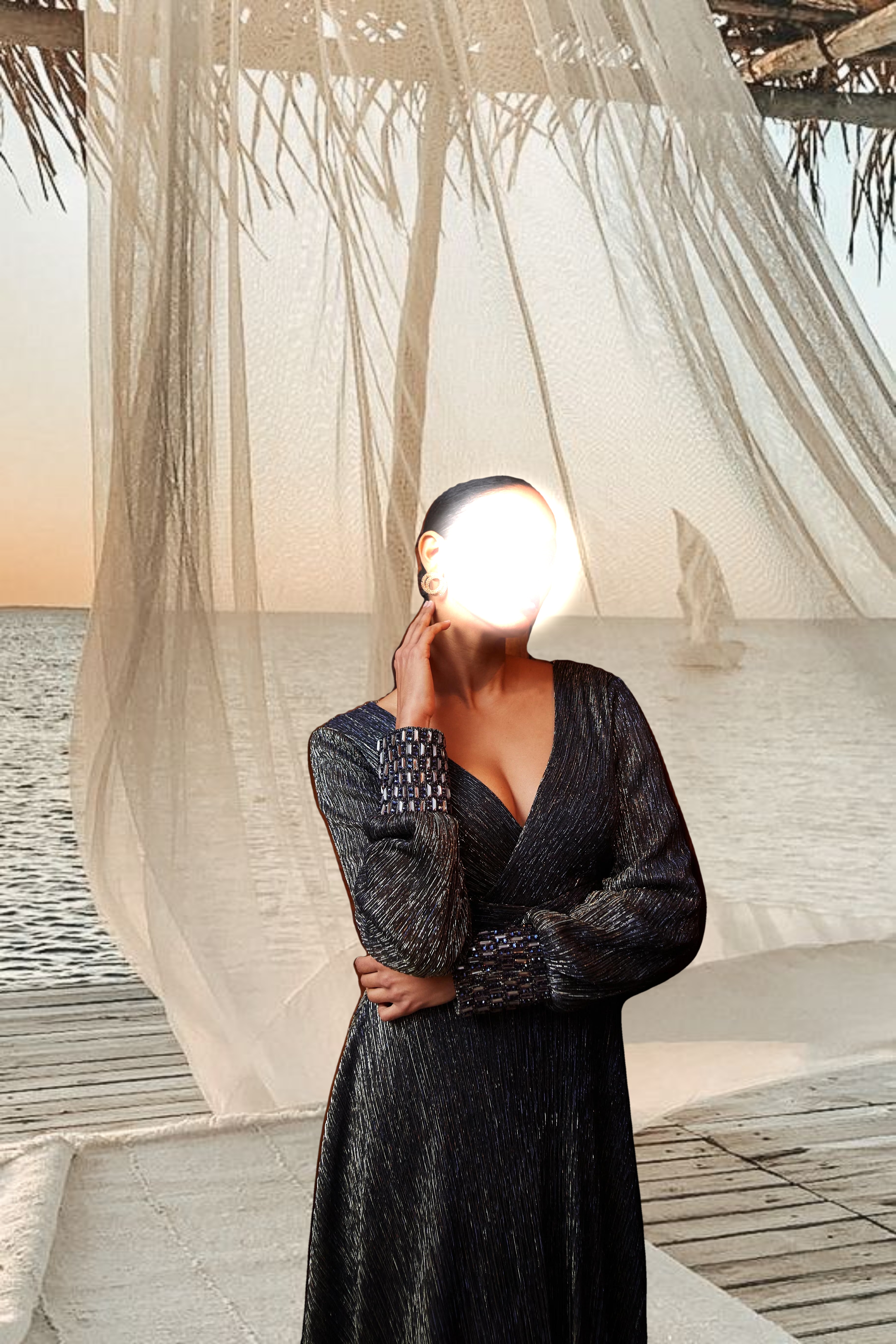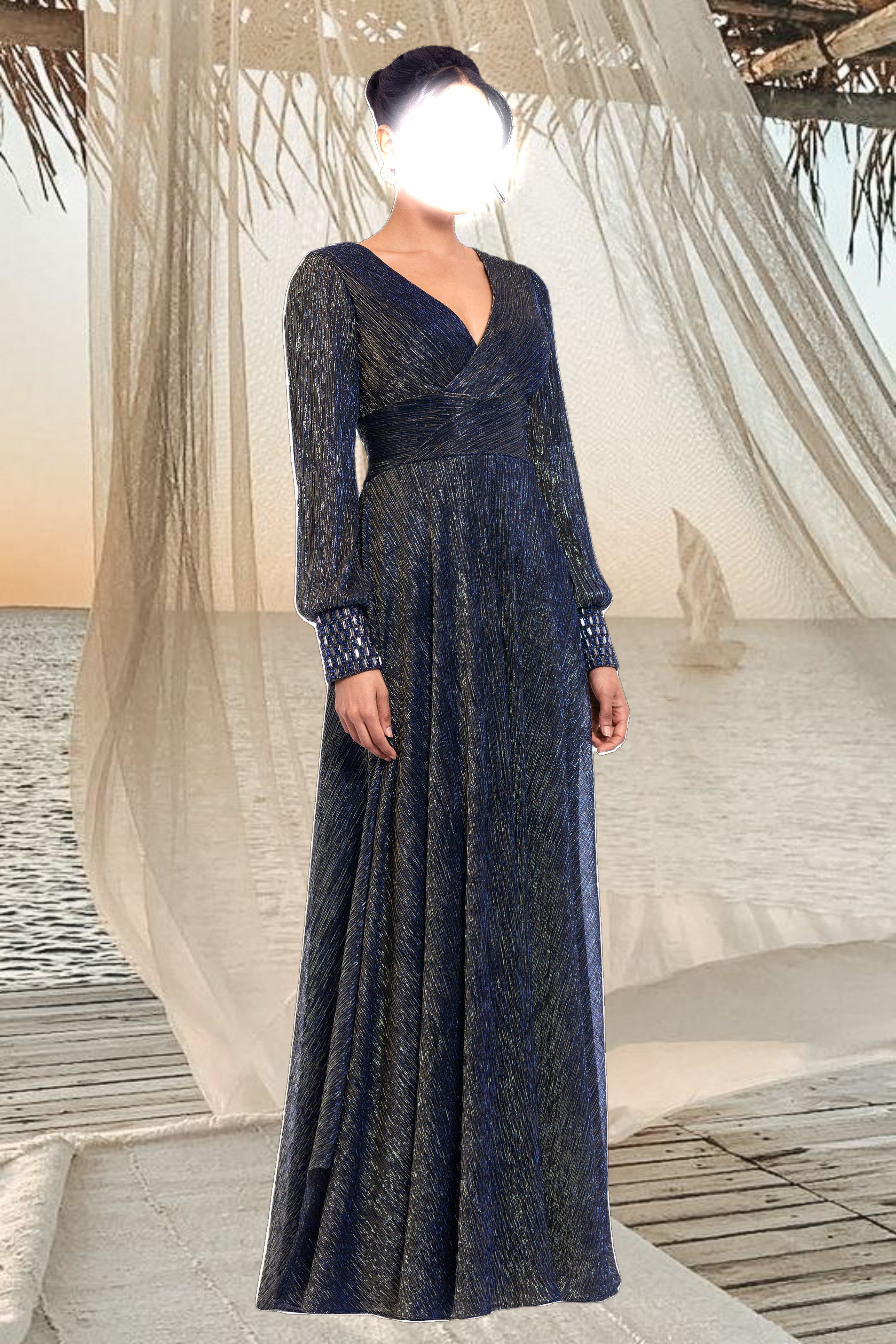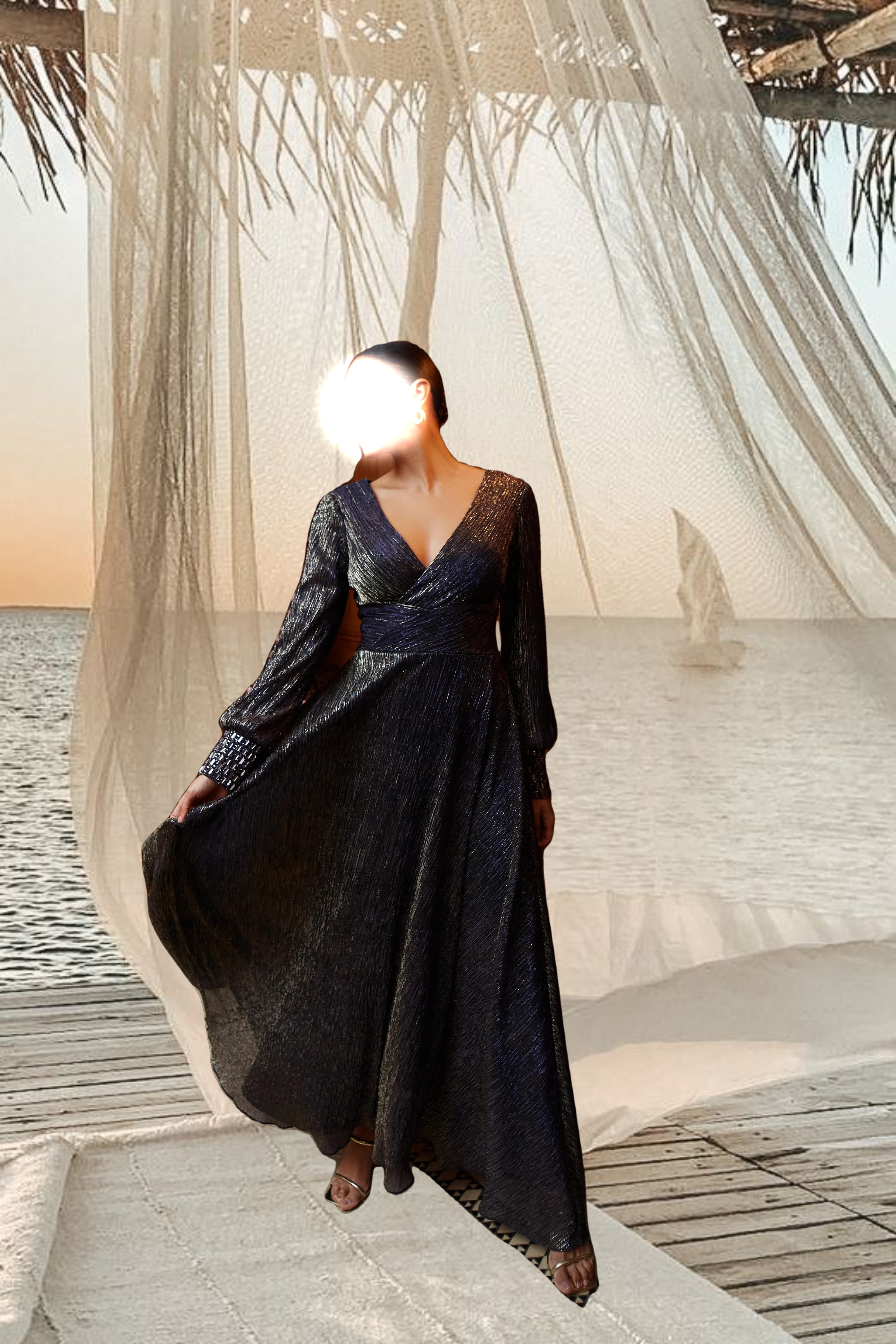 This stunning gown is designed with a flattering V-neckline and elegant long sleeves, making it a perfect choice for formal events and evening occasions. The wrap-style bodice accentuates the waist, creating a chic and sophisticated silhouette that is both timeless and modern. With its floor-length skirt, this dress exudes a graceful and ethereal charm, ideal for weddings, galas, and red-carpet appearances.