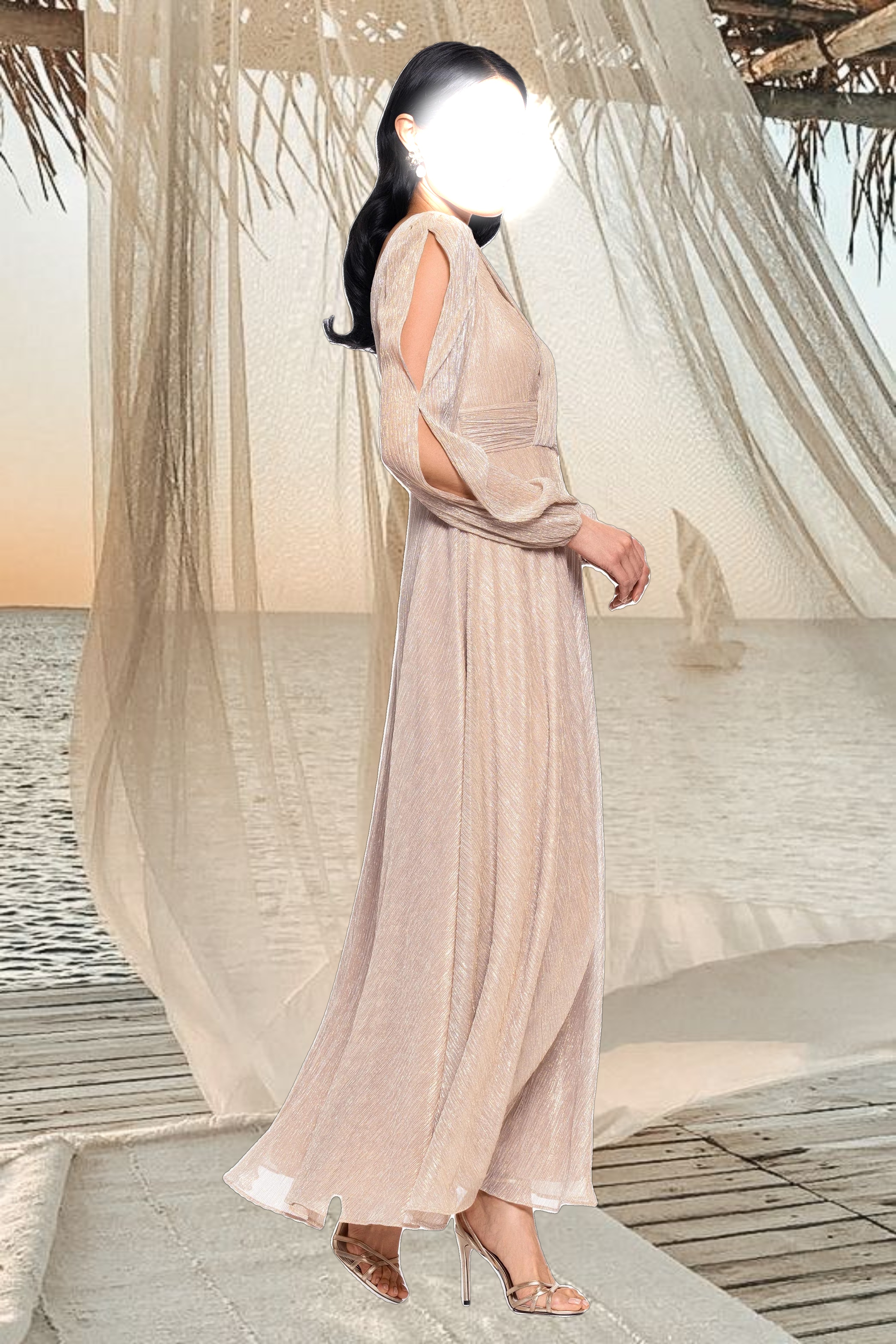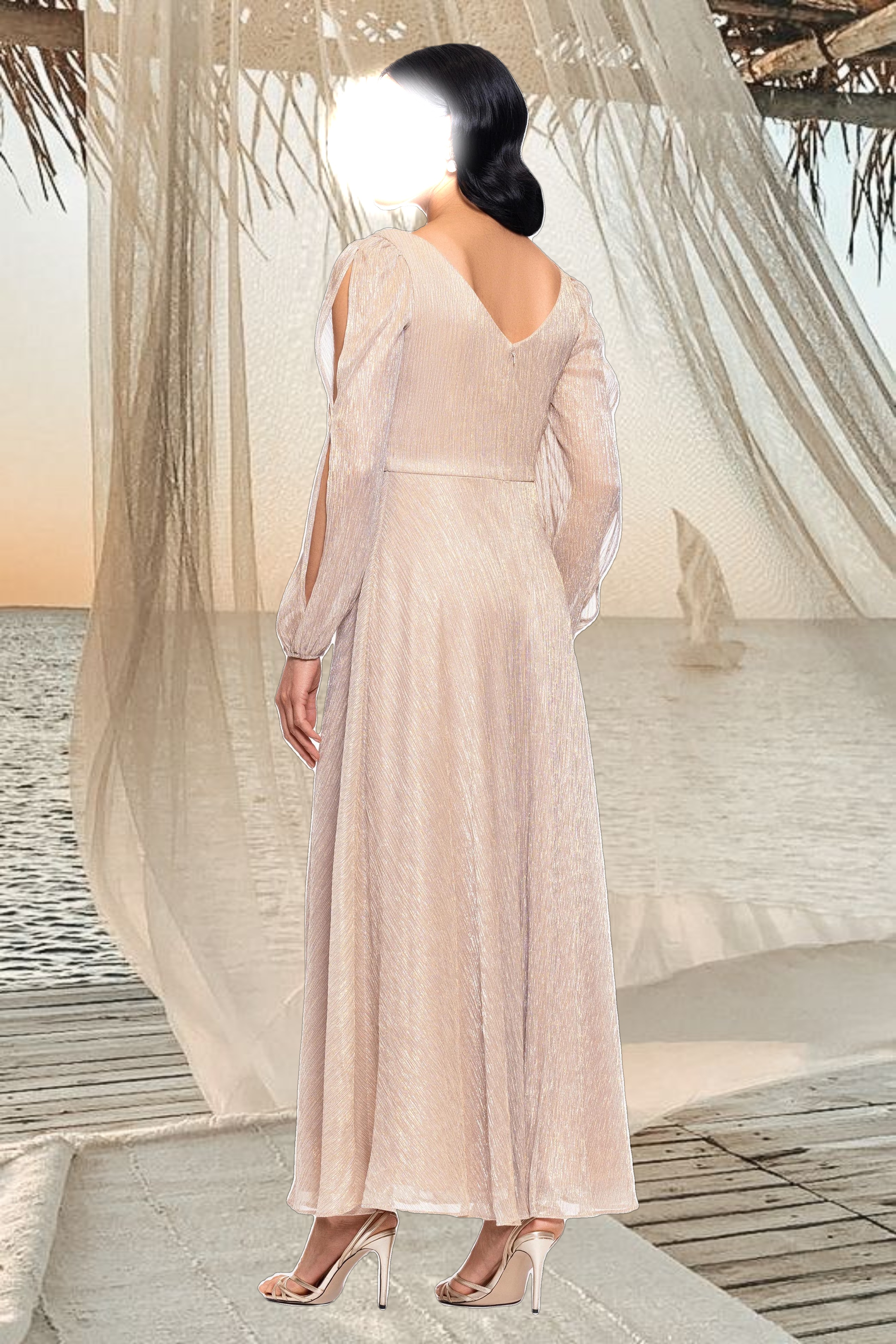 DetailThis gown exudes understated glamour with its shimmering fabric and flowing A-line silhouette. Featuring a surplice V-neckline and long sheer sleeves, it beautifully combines elegance and comfort. The cinched waist and subtle metallic sheen make it a perfect choice for formal events or celebrations.