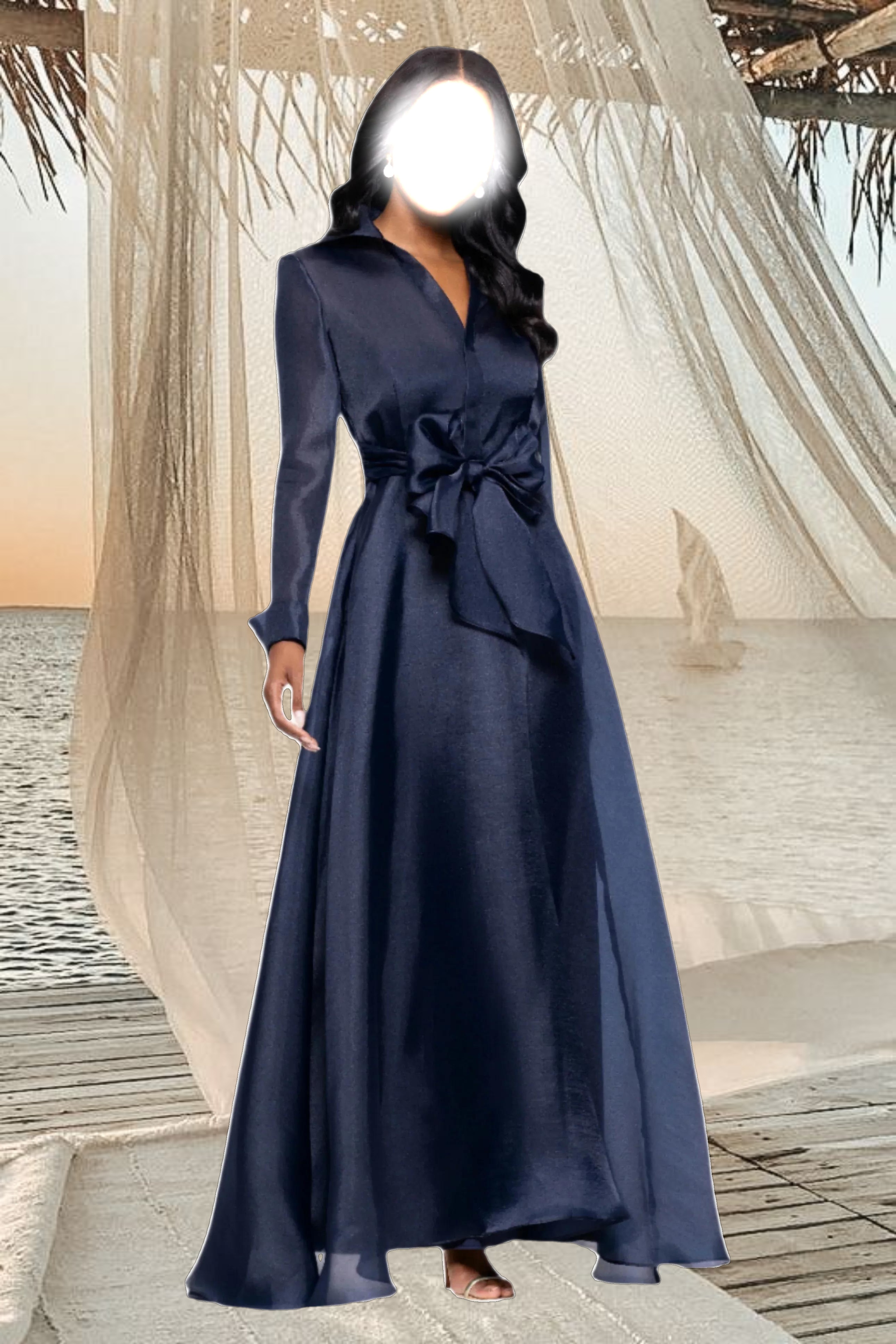 This elegant dress features a classic shirt-style design with long sleeves and a flattering bow belt that cinches the waist. The flowing A-line skirt adds graceful movement, making it perfect for formal occasions, galas, and upscale events. The lightweight fabric provides comfort while maintaining a sophisticated look.
