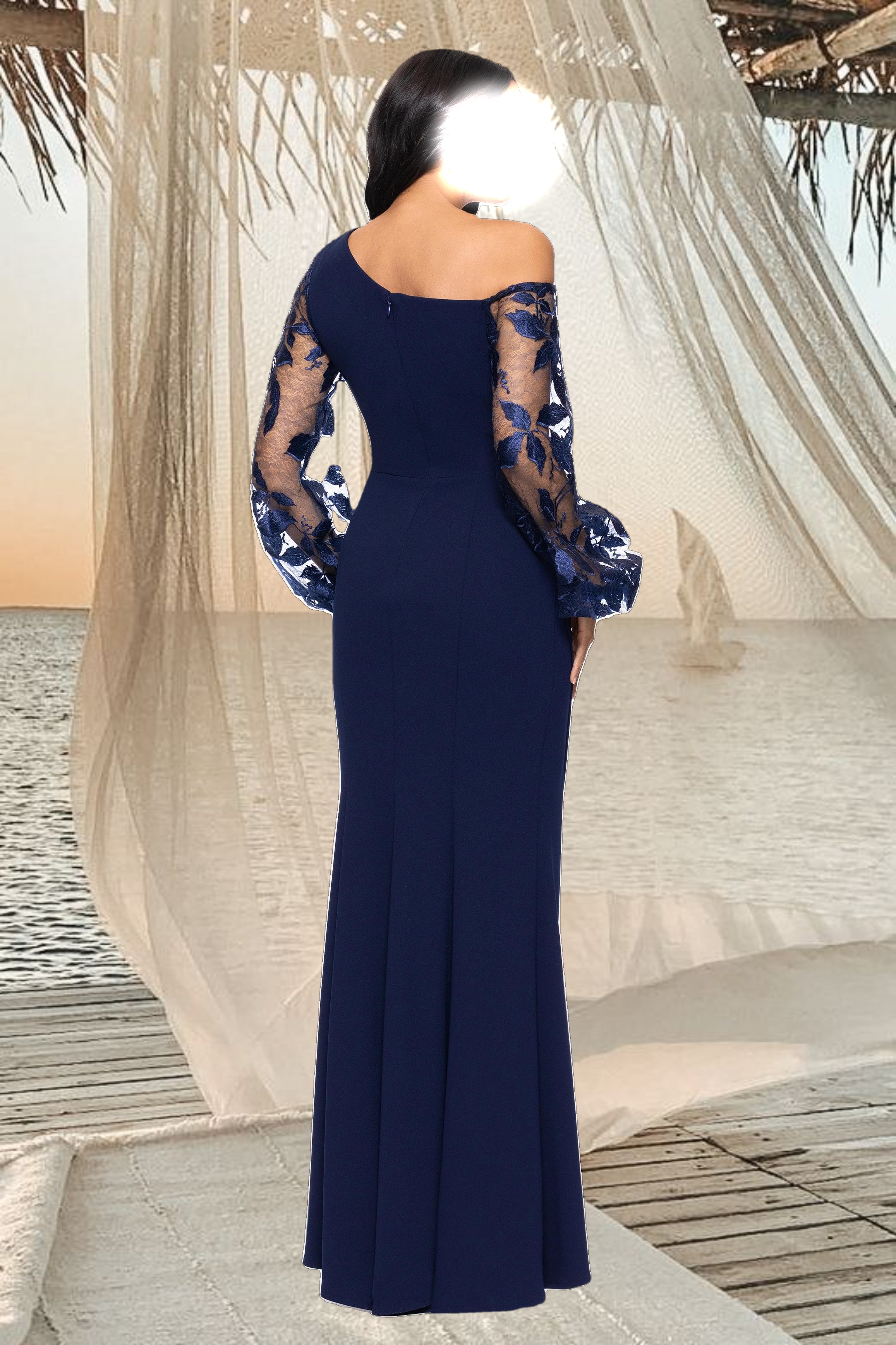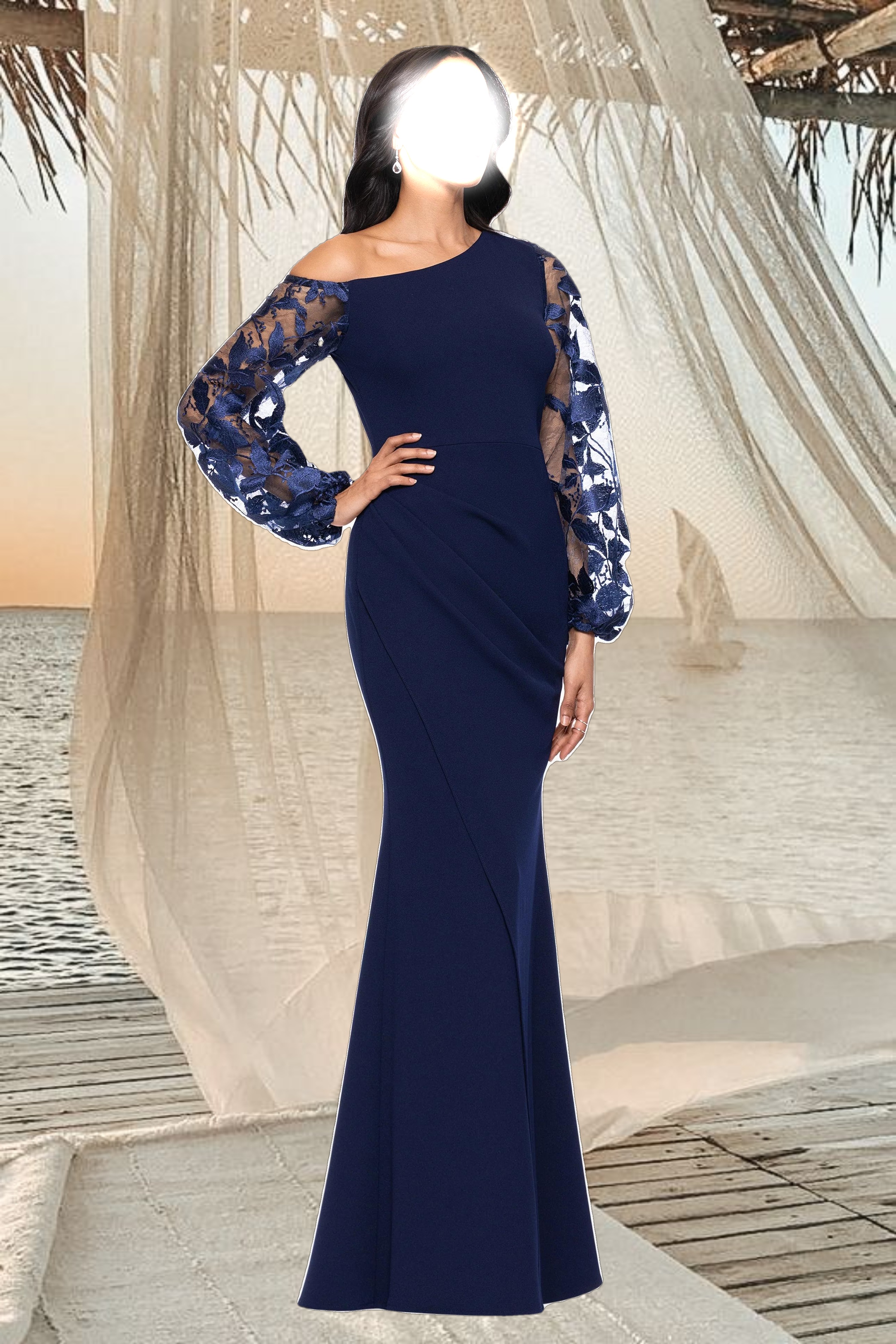 This sophisticated off-shoulder gown features sheer balloon sleeves and intricate floral embroidery for a romantic touch. Designed with a tailored bodice and gentle side pleating, it offers a flattering fit through the waist and hips. The floor-length silhouette creates an elegant, statuesque look ideal for galas, weddings, or black-tie evenings.