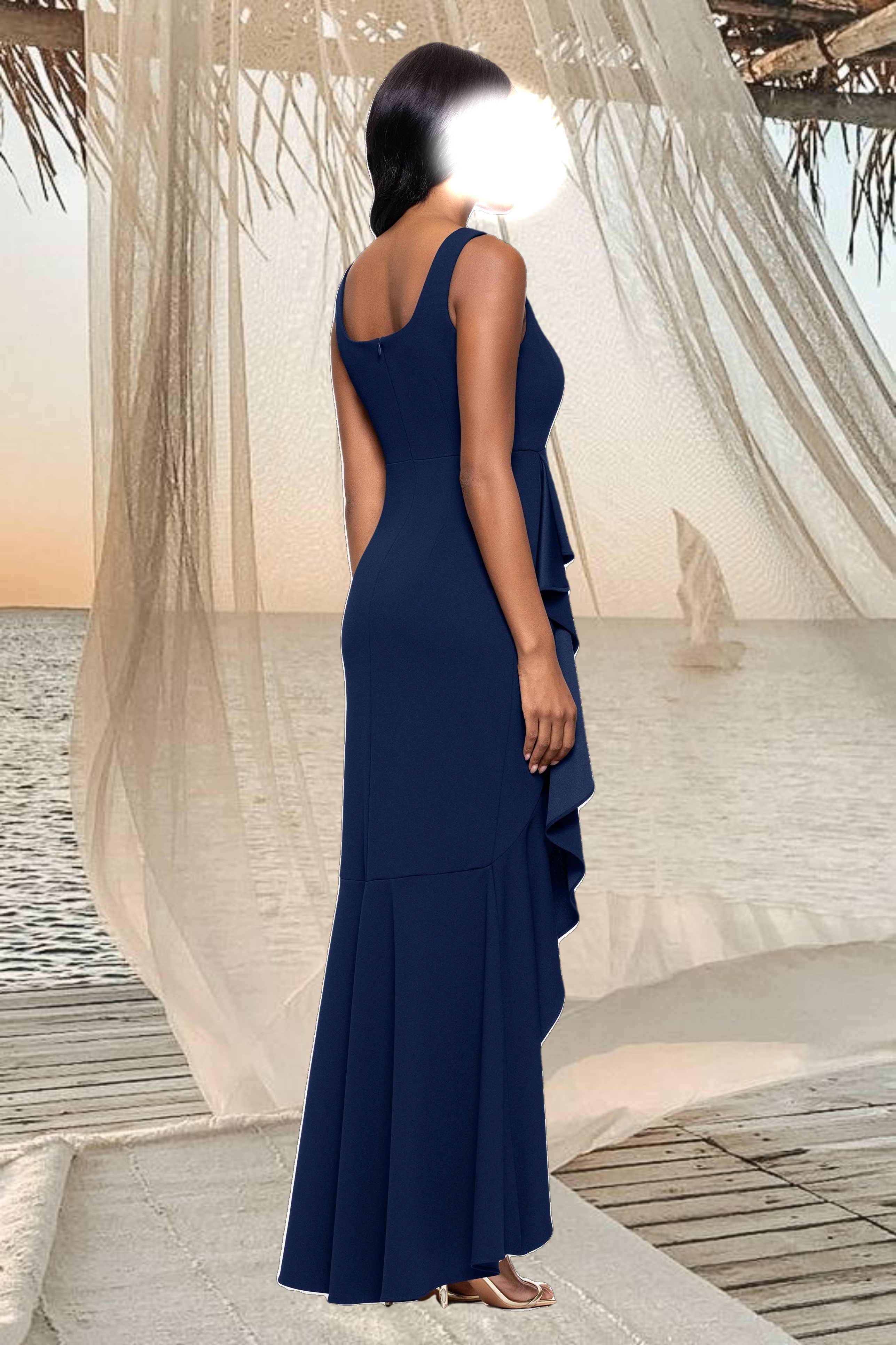 This gown features a modern square neckline and curve-enhancing silhouette, finished with cascading ruffle detailing and a flounced hem that adds graceful movement—perfect for turning heads at your next elegant event.