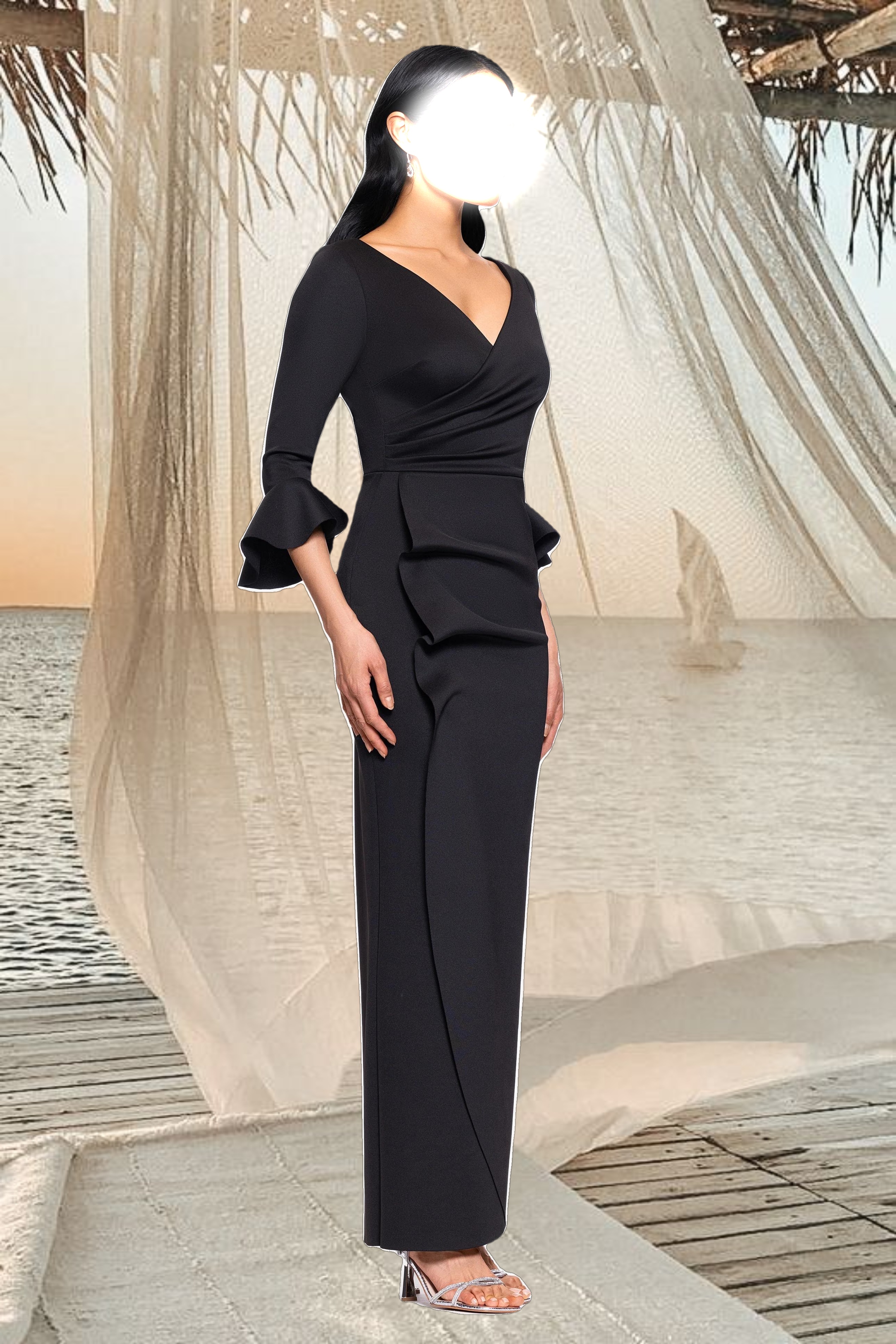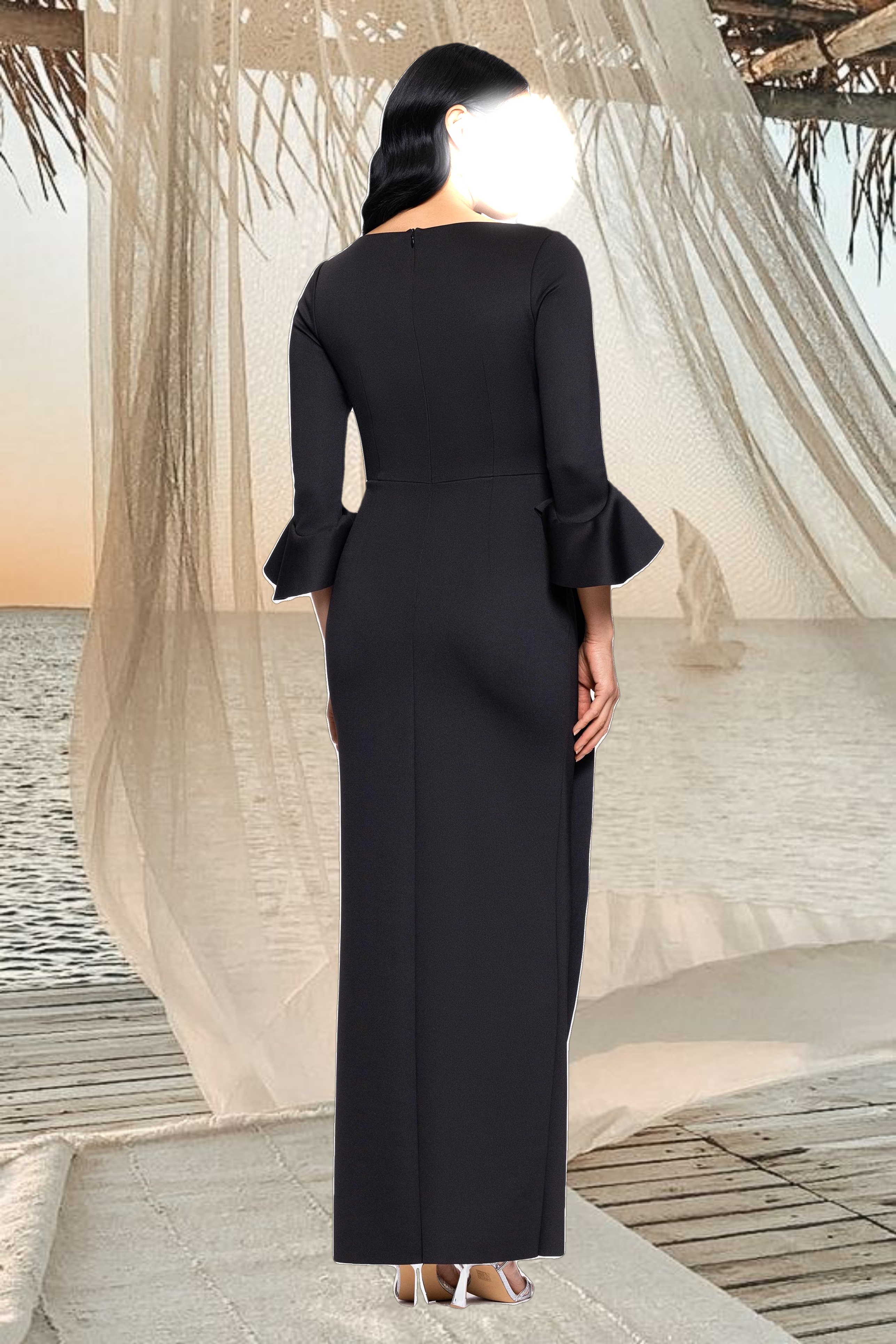 Chic and sophisticated, this gown features a flattering V-neckline, fitted bodice, and dramatic three-quarter bell sleeves. The faux-wrap silhouette and tulip hemline create a graceful shape, perfect for formal evenings and special celebrations.