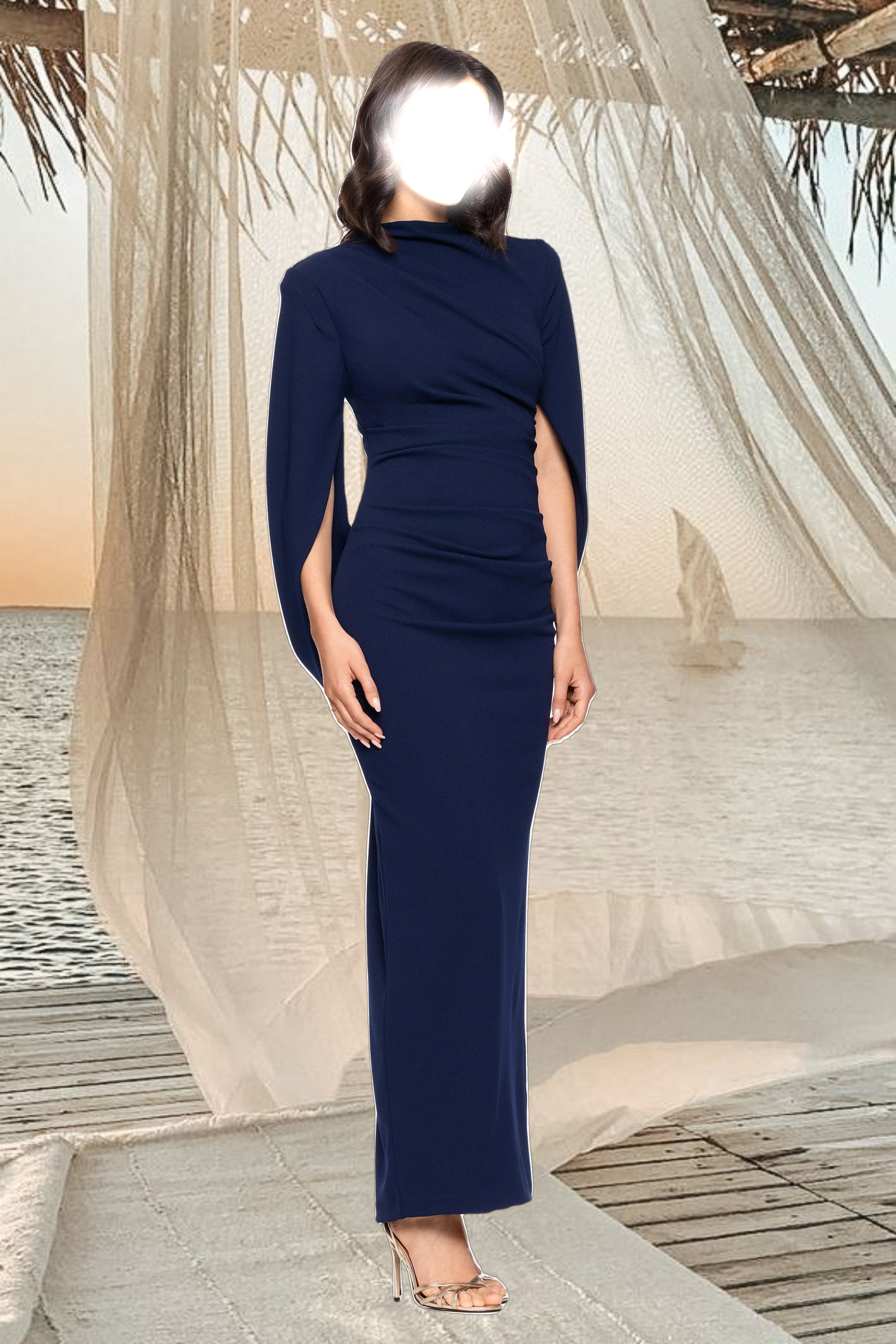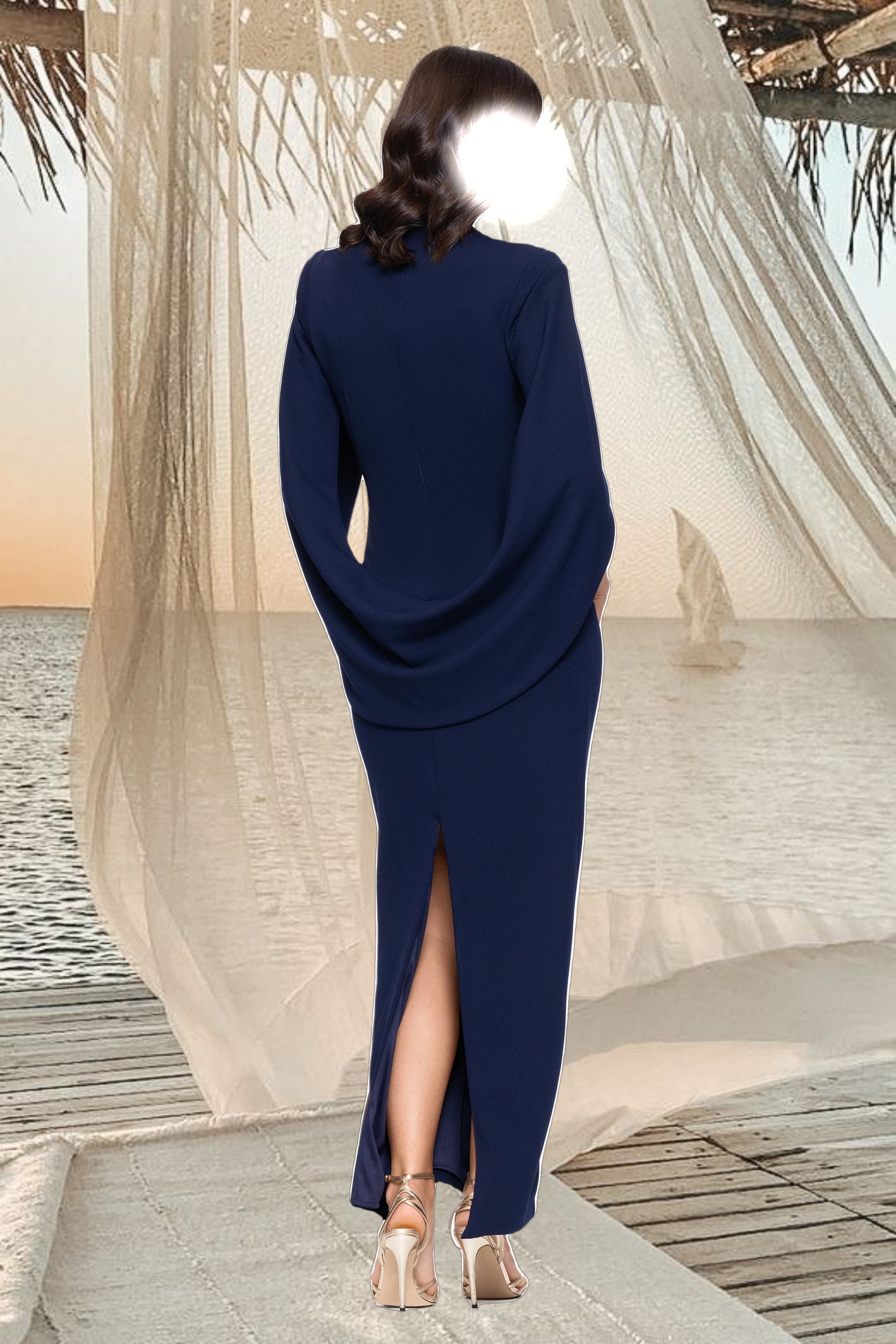 Flow gracefully in this modest floor-length dress featuring drape back sleeves and a chic high neckline. Crafted from smooth scuba crepe, it’s perfect for elegant evenings or special occasions where style meets comfort with a playful twist.