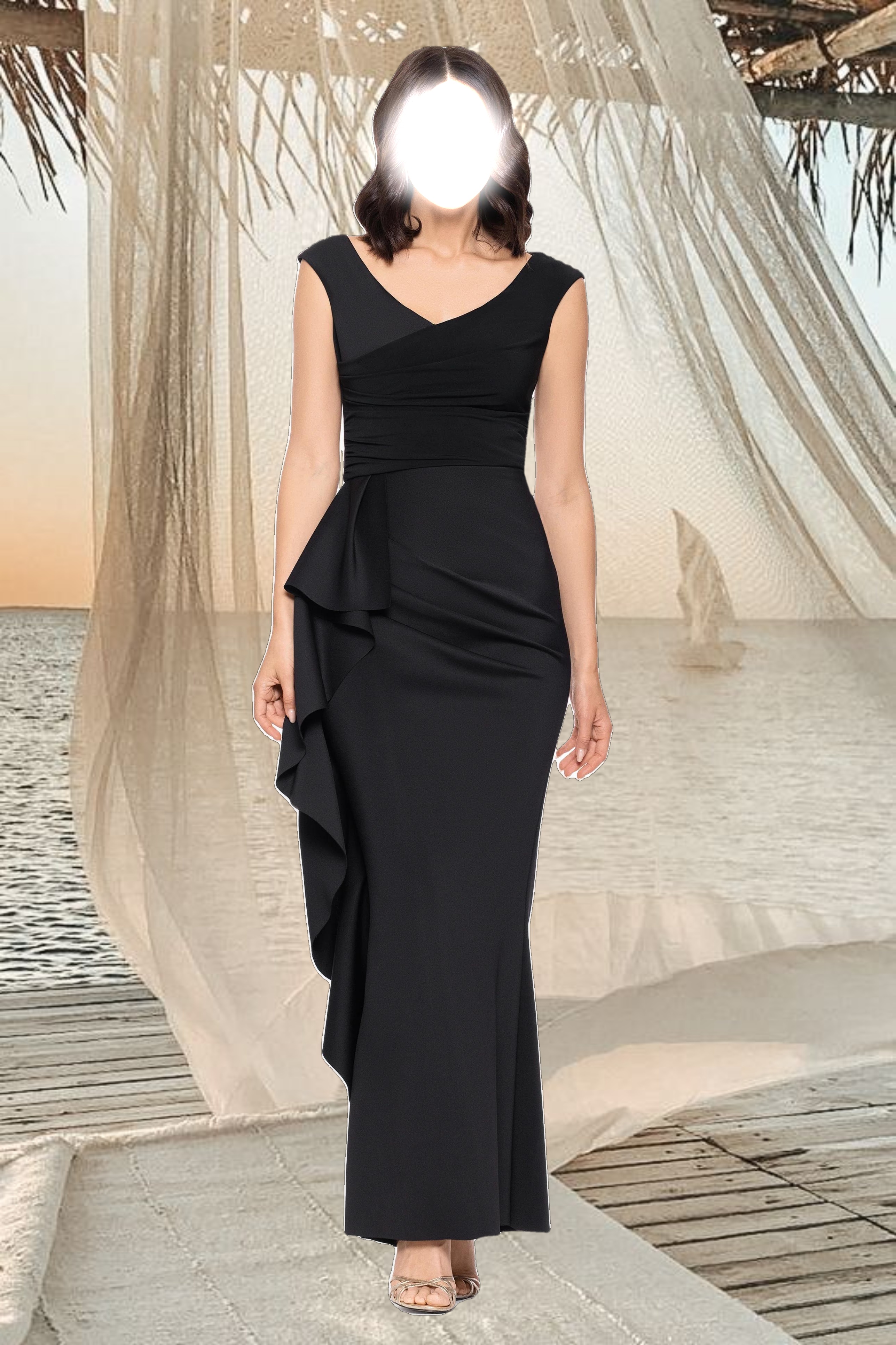 This black evening gown features a flattering ruched bodice, asymmetric neckline, and dramatic cascading ruffle detail. The fitted silhouette and floor-length skirt make it a sophisticated choice for weddings, galas, or formal celebrations.