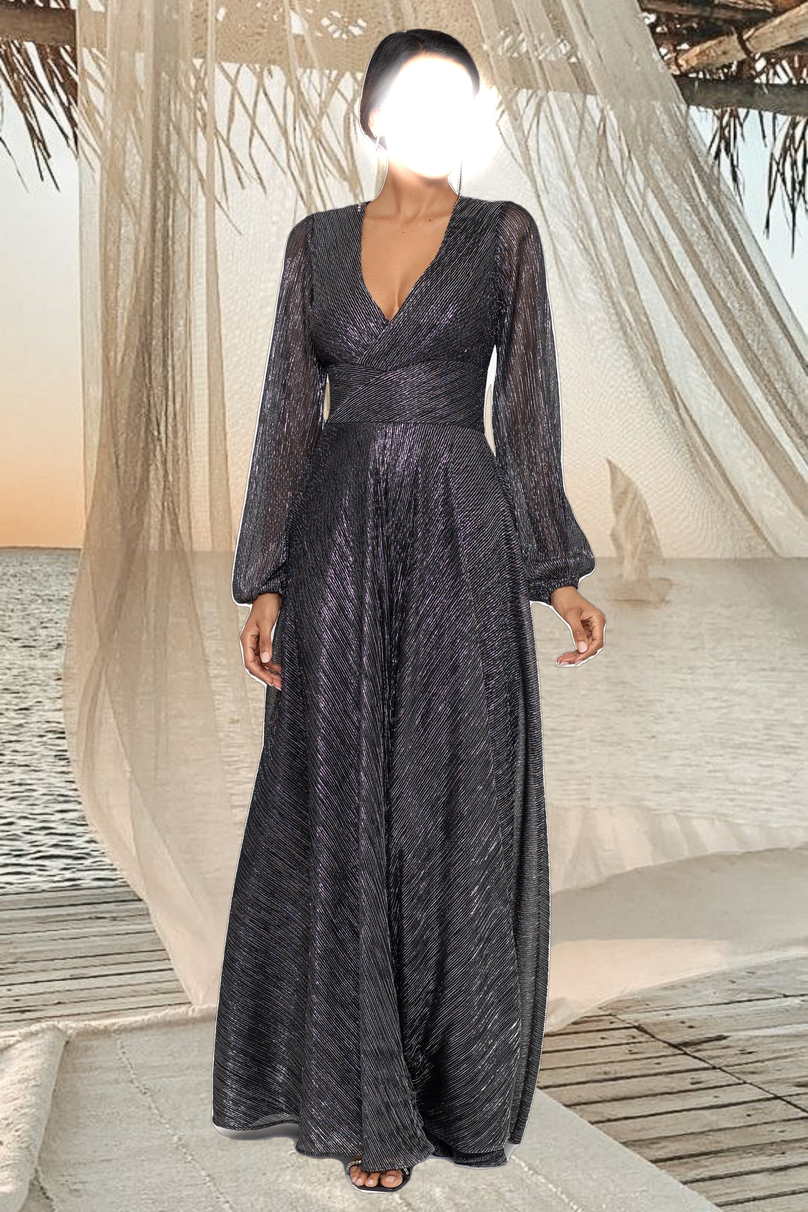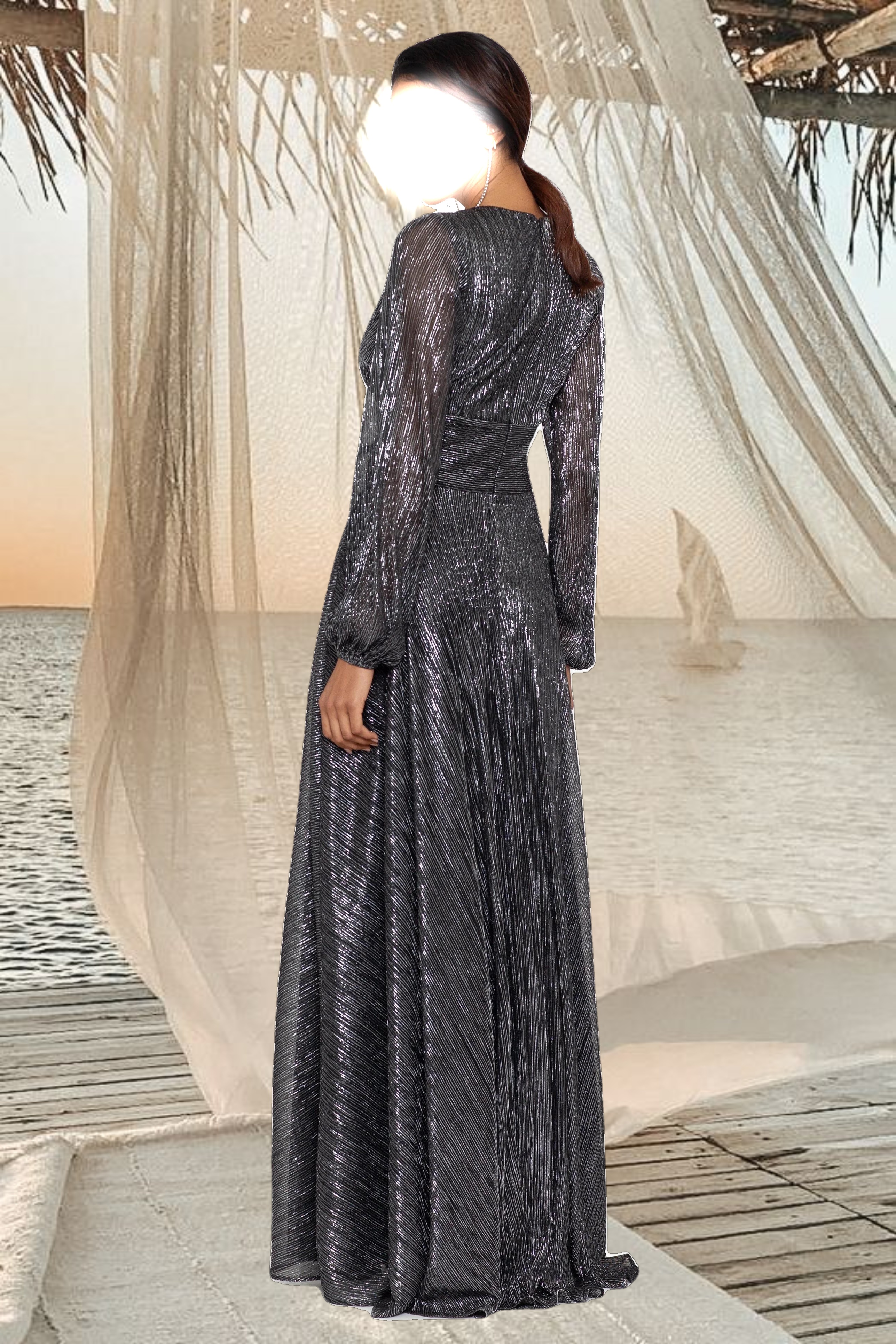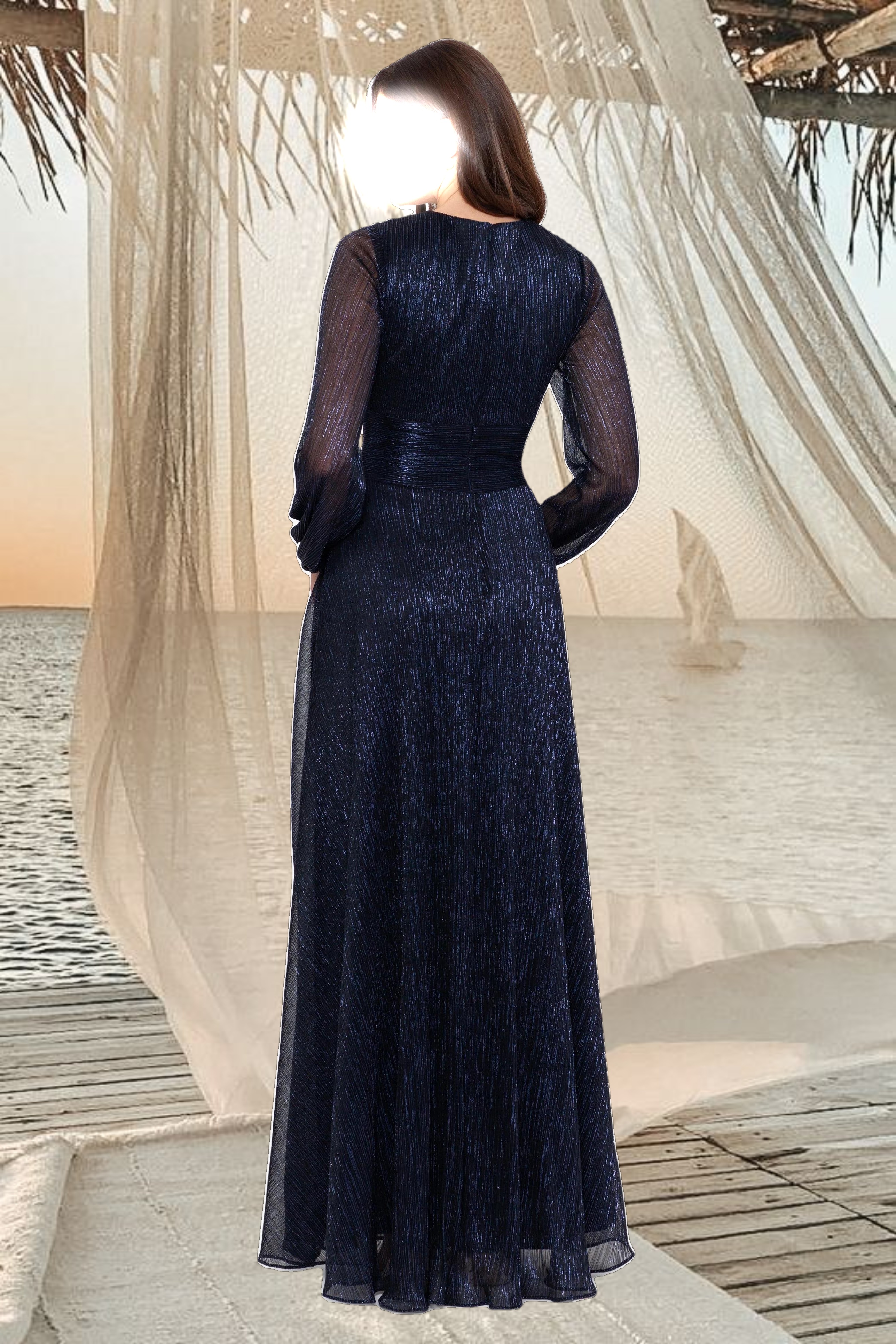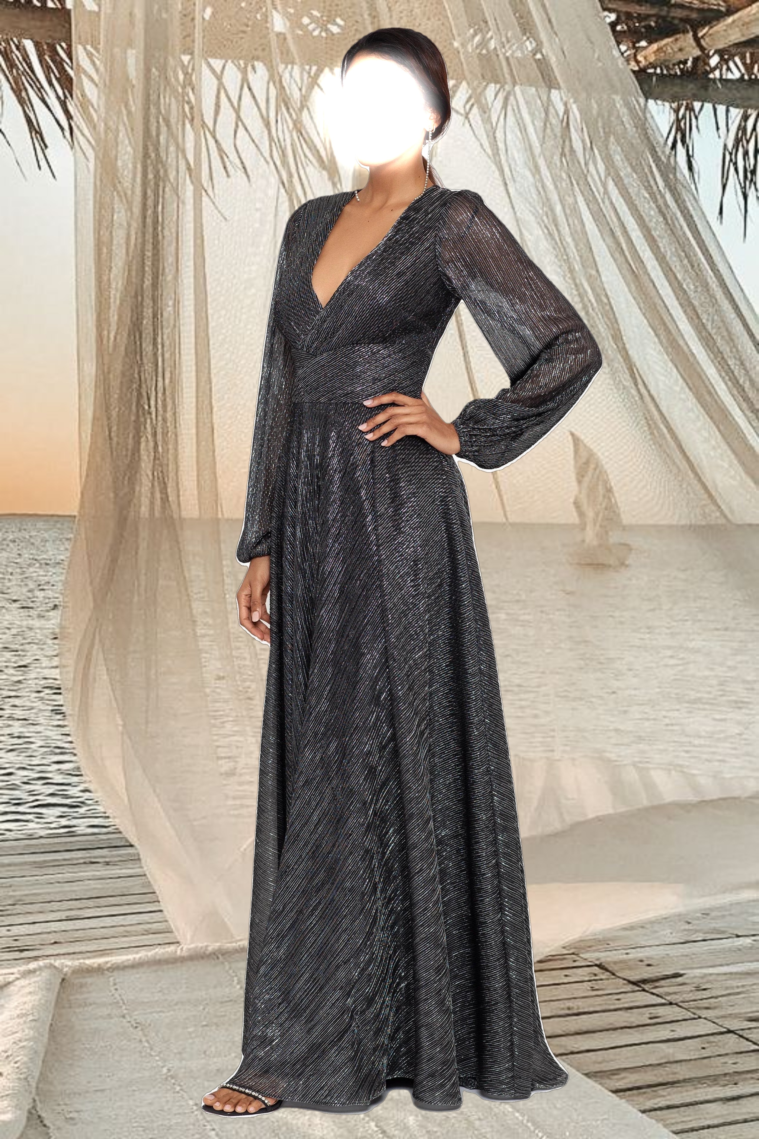• Details: Floor Length Gown, Waist Wrap, Long Sleeve Dress