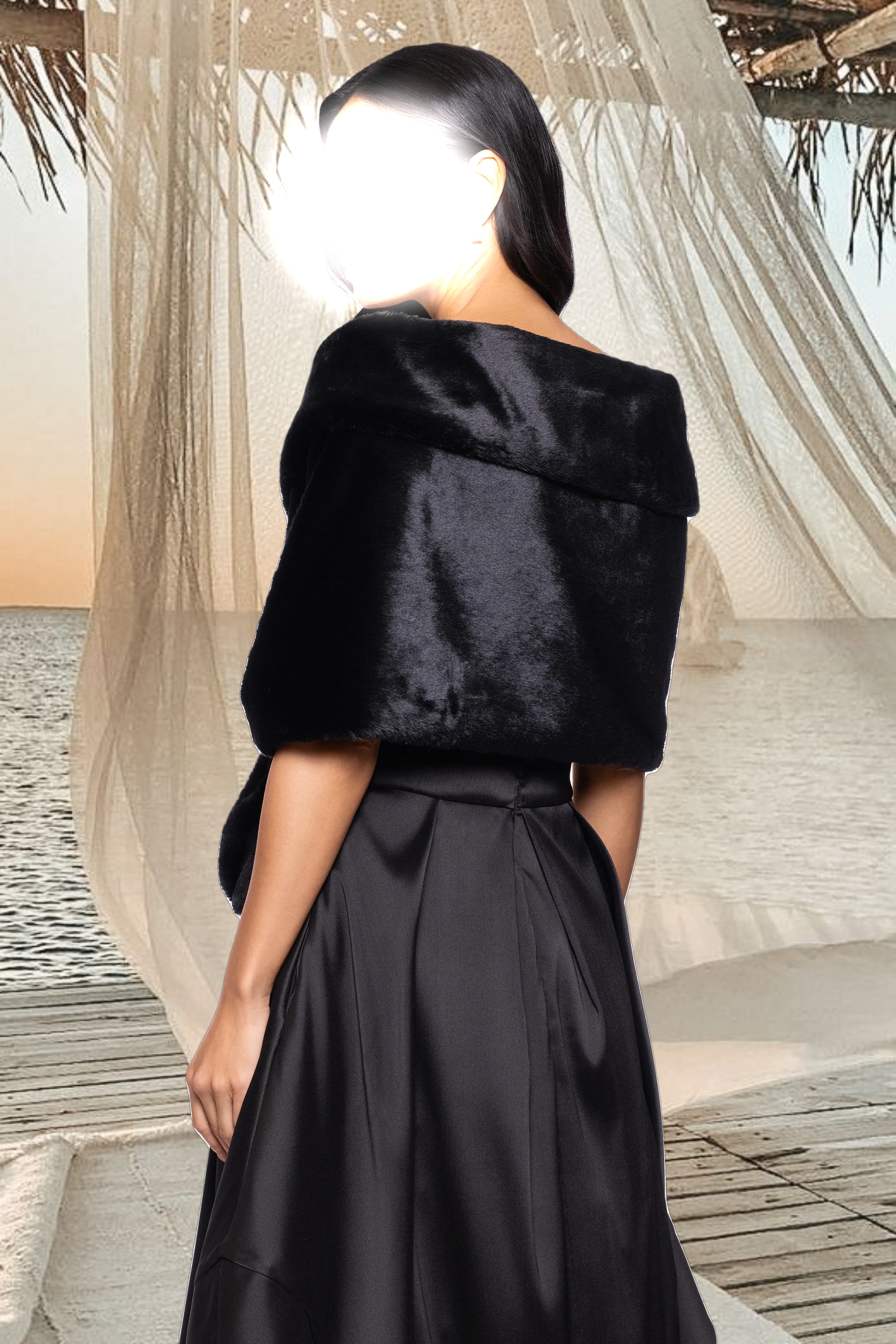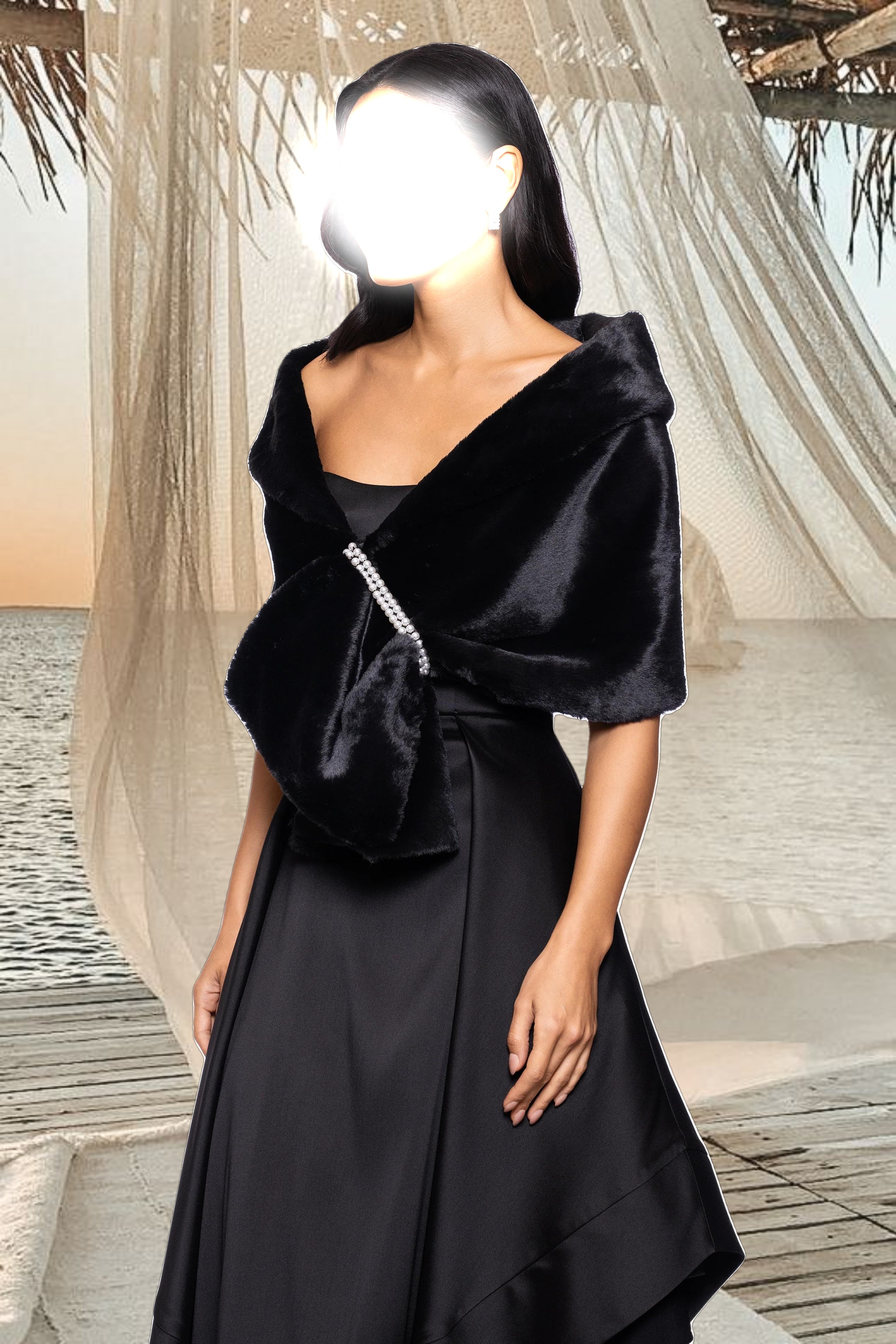 This luxurious shawl wrap exudes timeless elegance with its plush texture and opulent draping. Its sophisticated crossover design is secured with a pearl embellishment, adding a hint of glamour to any formal ensemble. Perfect for weddings, evening events, or adding a touch of refined warmth to a special occasion look.