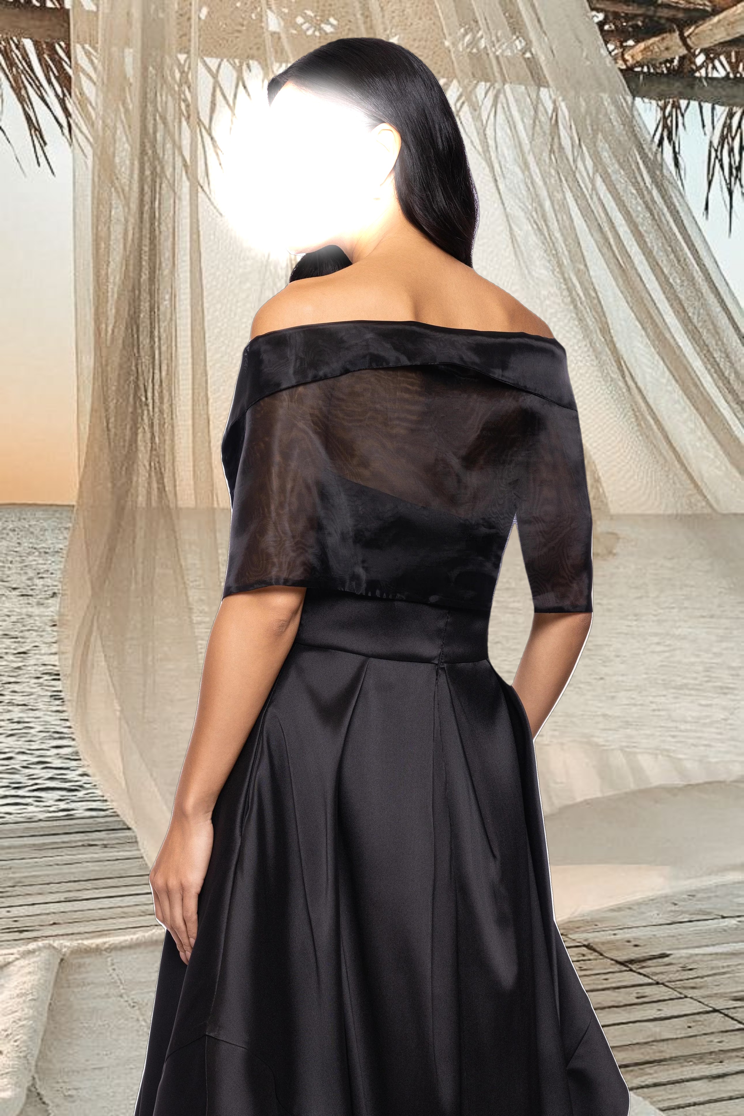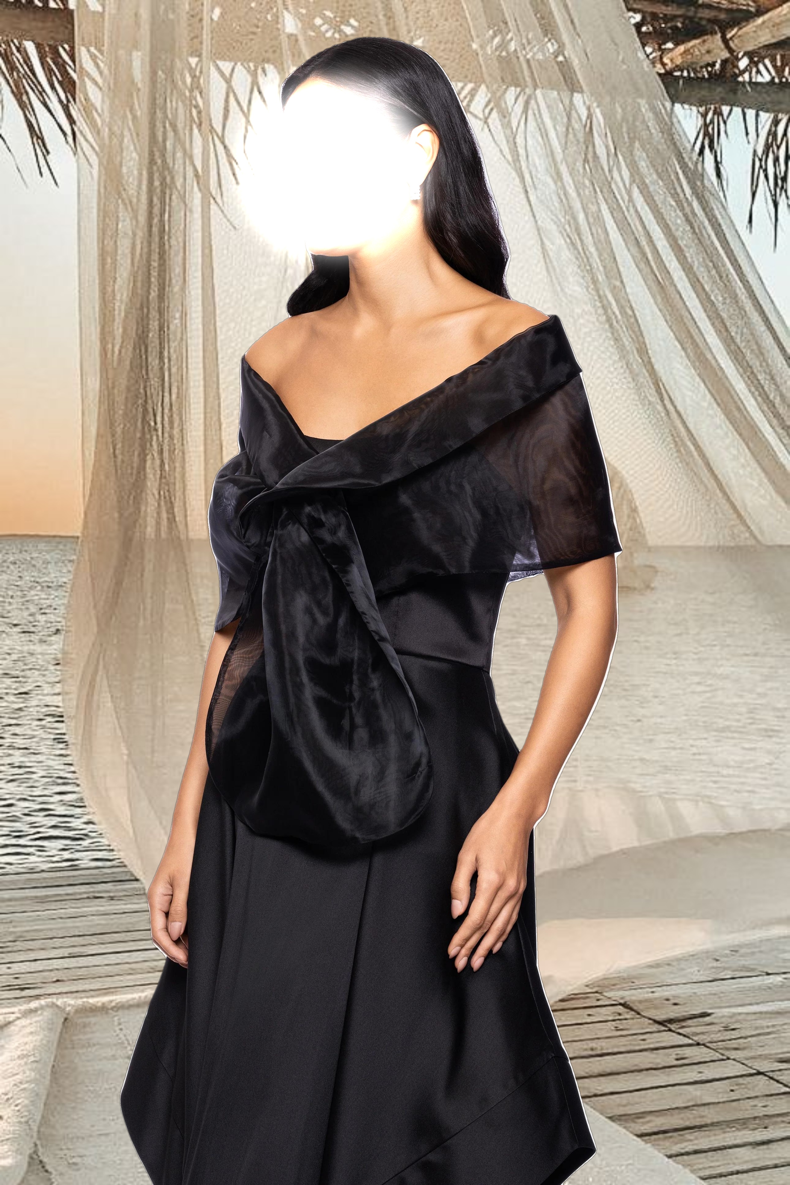 This chic wrap exudes elegance with its sheer design, perfect for draping over formal attire. The sophisticated knot detail adds a modern twist, enhancing any evening look with style and grace. Ideal for creating a striking silhouette while offering a light layer of coverage.